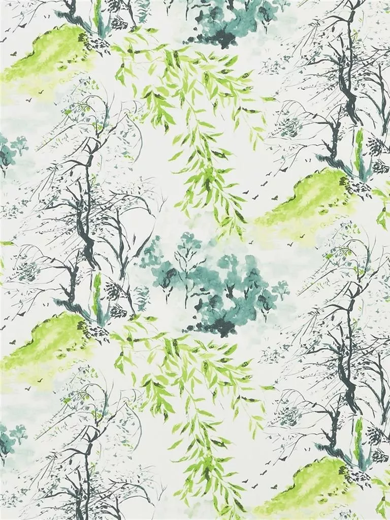A wintry landscape painted in the Chinese tradition reminiscent of modern toile de jouy with soft brushwork mixing with structural tonal washes. Beautiful woodland scenes create a very tranquil air. Printed on easy-hanging, washable non-woven paper.