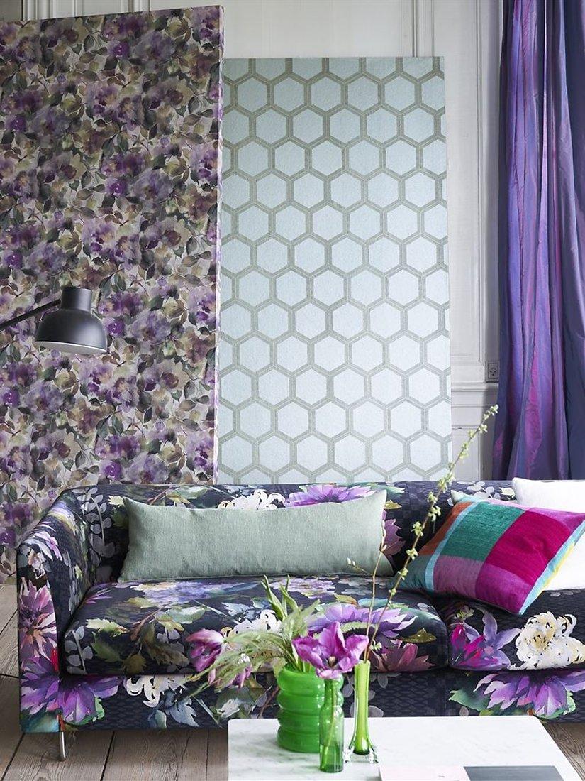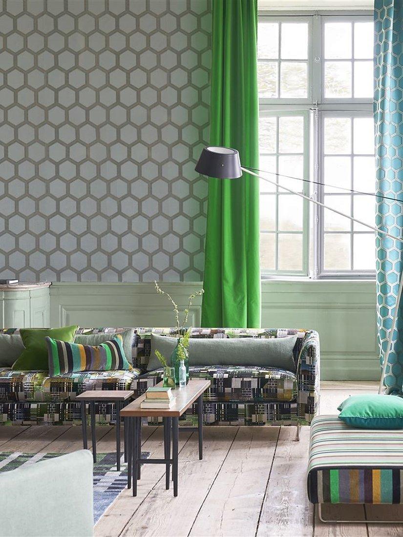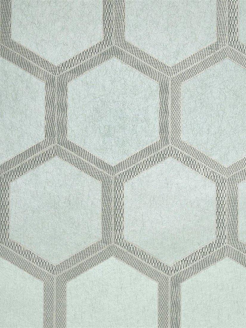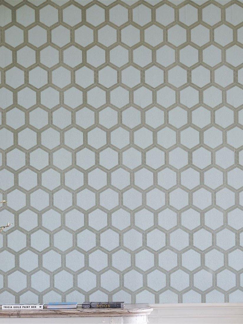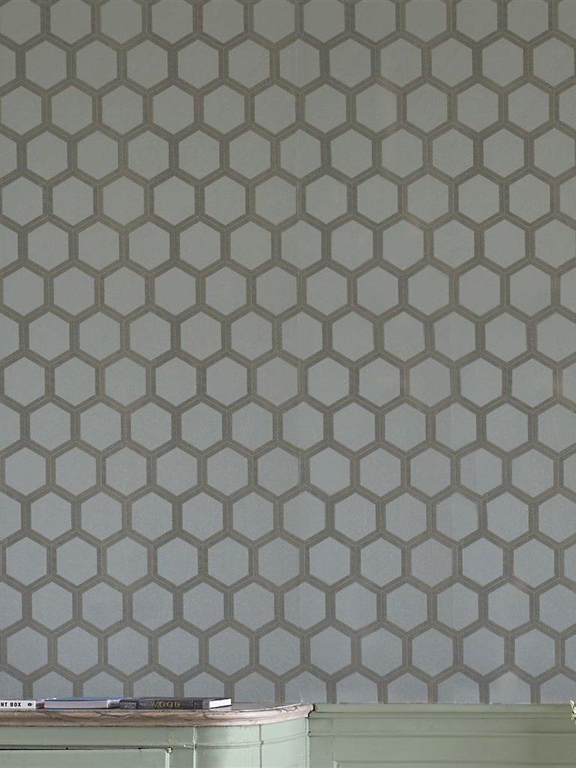 This large scale wallpaper design uses hexagonal shape and linear print to sophisticated and glamorous effect. With a subtle metallic effect, this stylish graphic wallpaper design is flexo printed onto a gently textured non-woven ground for ease of hanging in any interior setting.