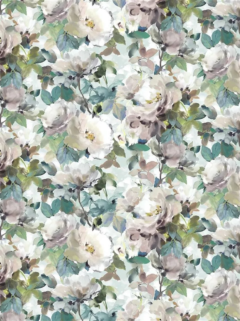 Reminiscent of an English country garden, bouquets of wild roses and peonies are painted in soft watercolour tones to create a vivid floral study on this digitally printed and softly slubbed pure cotton fabric from Designers Guild.