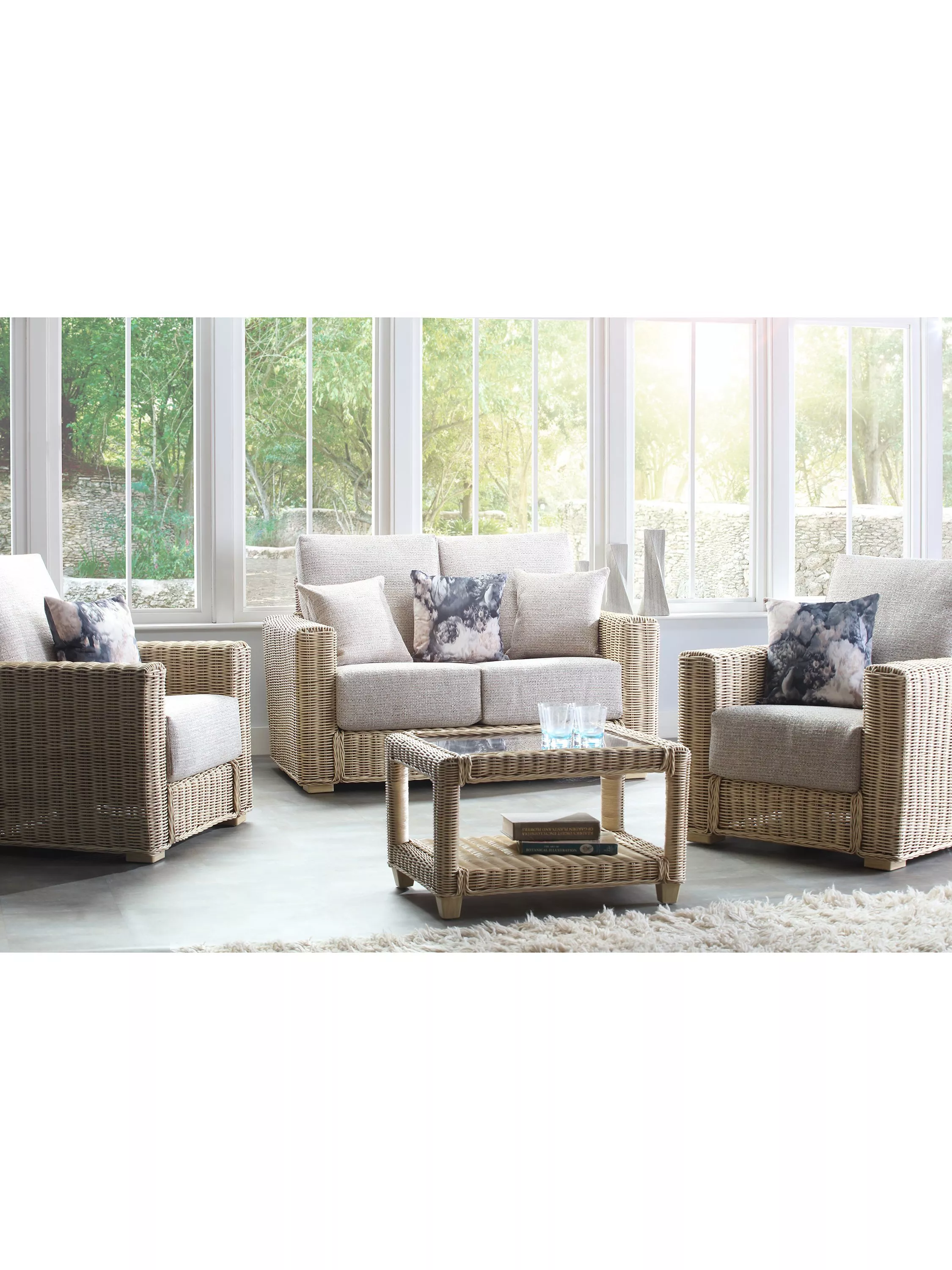 - Natural rattan, polyester cushions, toughened glass