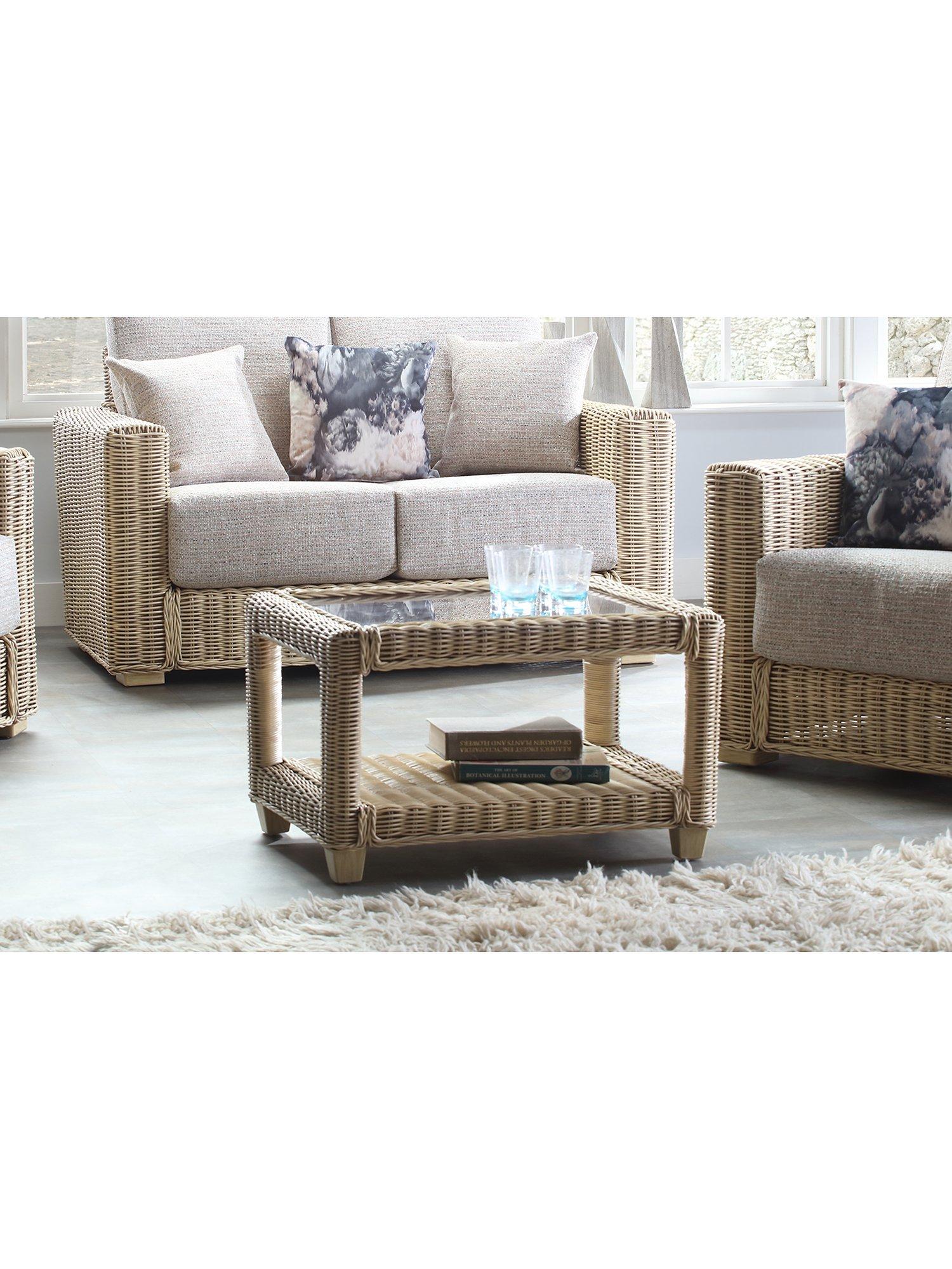 The rectangular table has sturdy wooden legs, a 5mm toughened glass top and a storage shelf to keep magazines, newspapers and books tucked away. The table complements matching boxy-shaped rattan furniture in the Burford range.