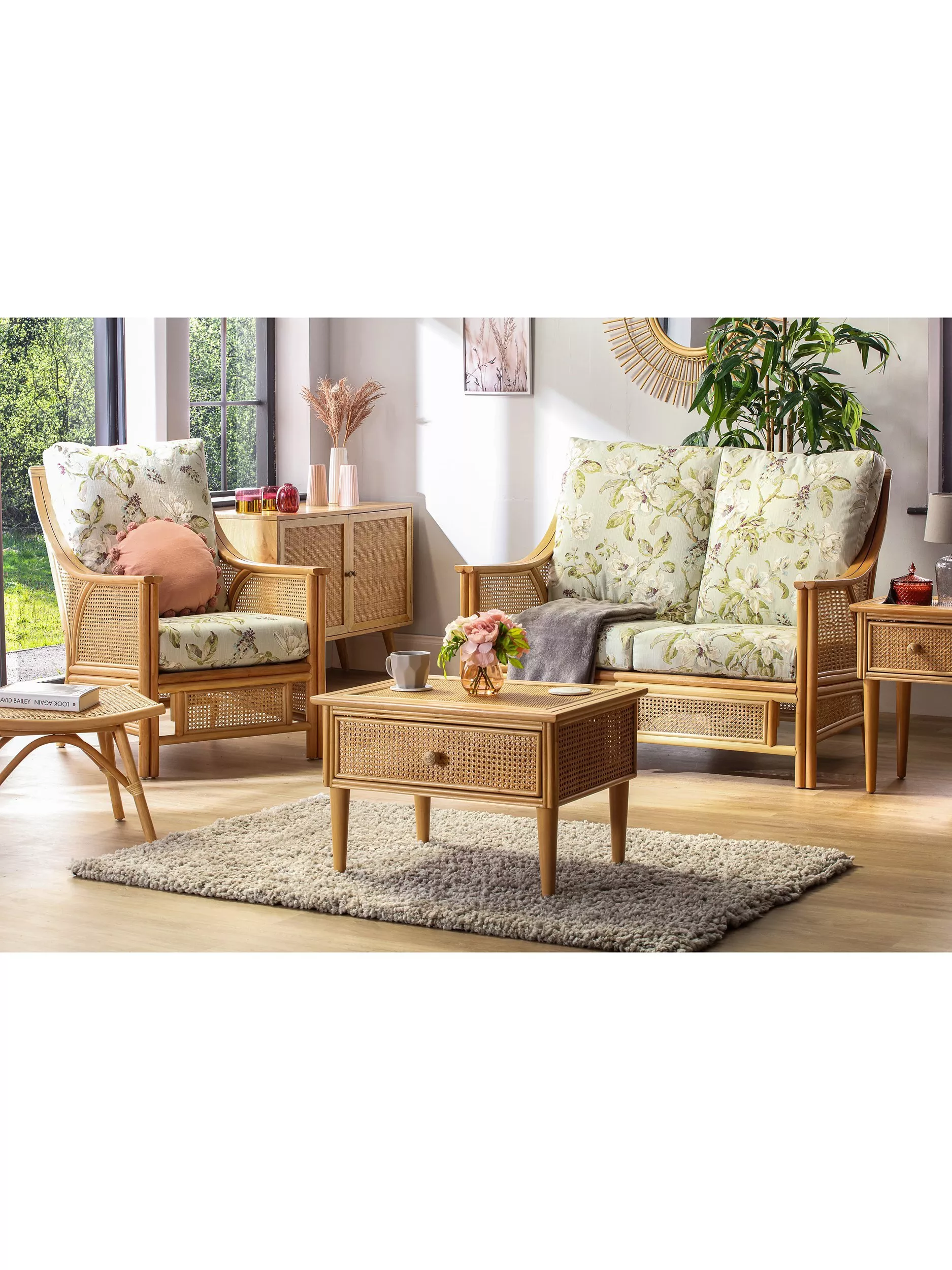Handmade from natural rattan, the Chester three-seater lounging set from Desser is an attractive design for the living room or conservatory. The set includes a two-seater sofa, an armchair, coffee table, lamp table and footstool.