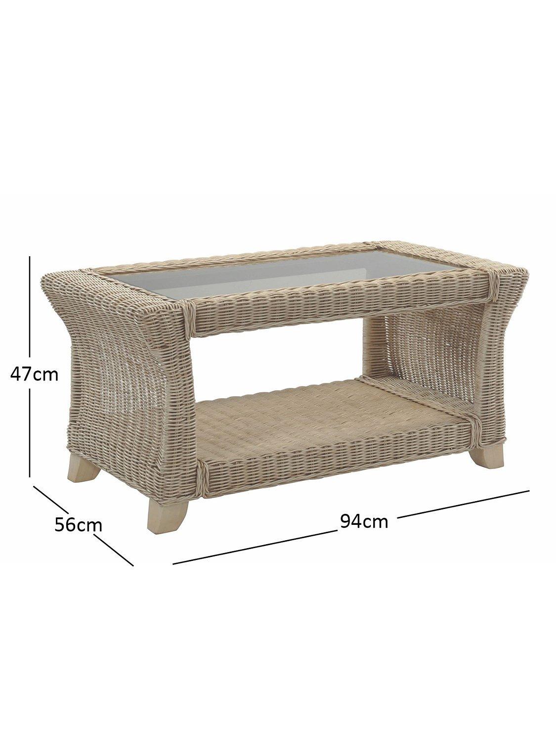 The rectangular table has sturdy legs, a 5mm toughened glass top and a storage shelf to keep magazines, newspapers and books tucked away. The table complements matching rattan furniture in the Clifton range.