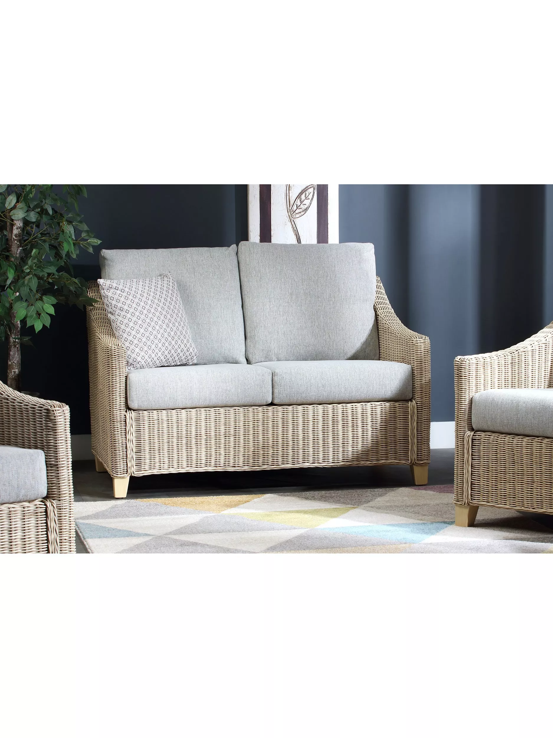 The lower back and sweeping arms give a comfortable sit and the wooden legs ensure stability. The handsewn seat and backrest cushions are made in the UK with a wrapped finish to help prevent wear and tear. The sofa complements matching rattan furniture in the Dijon range.