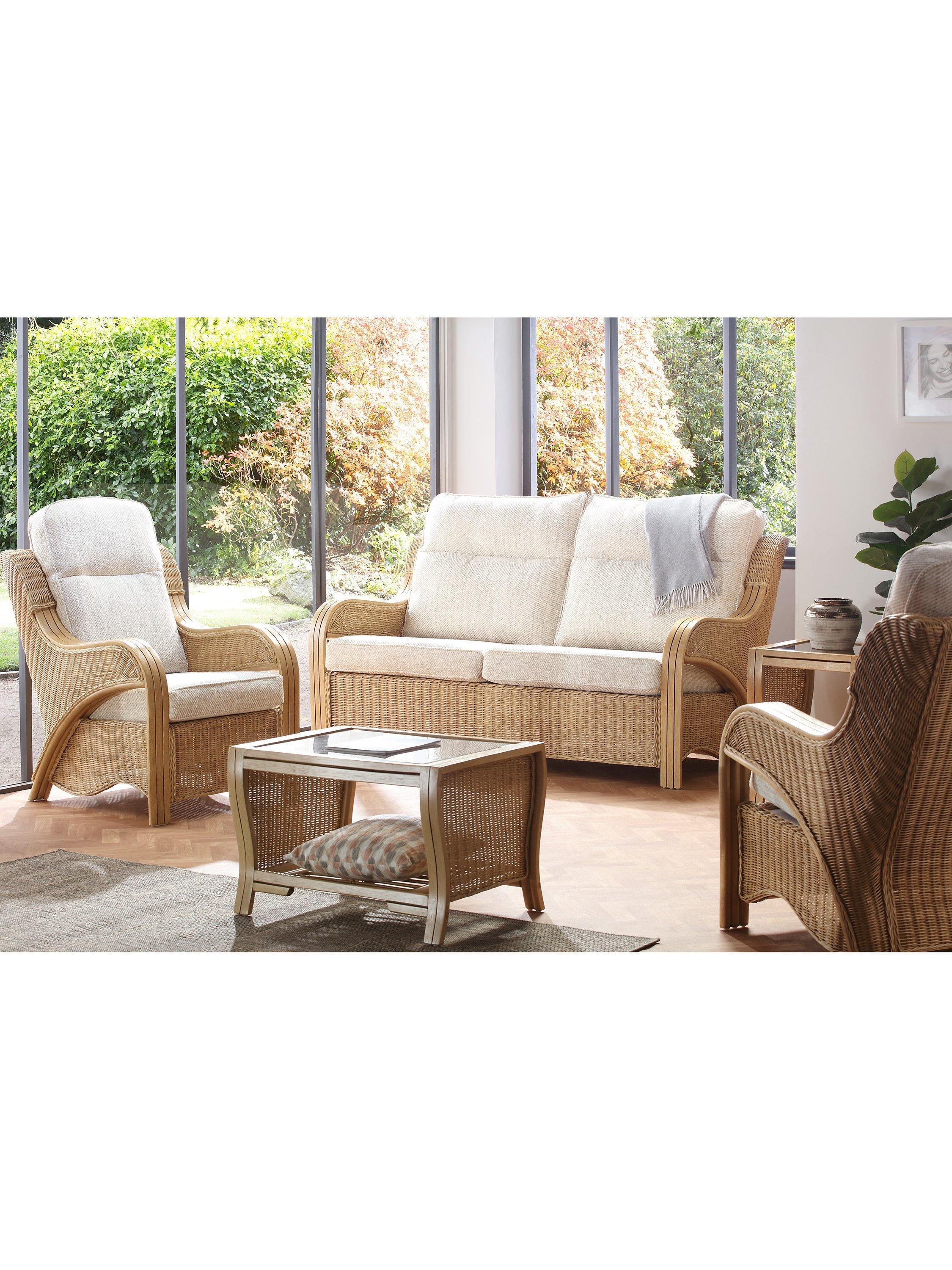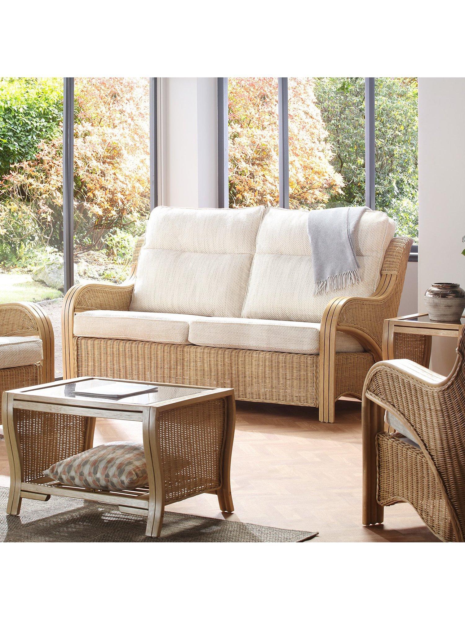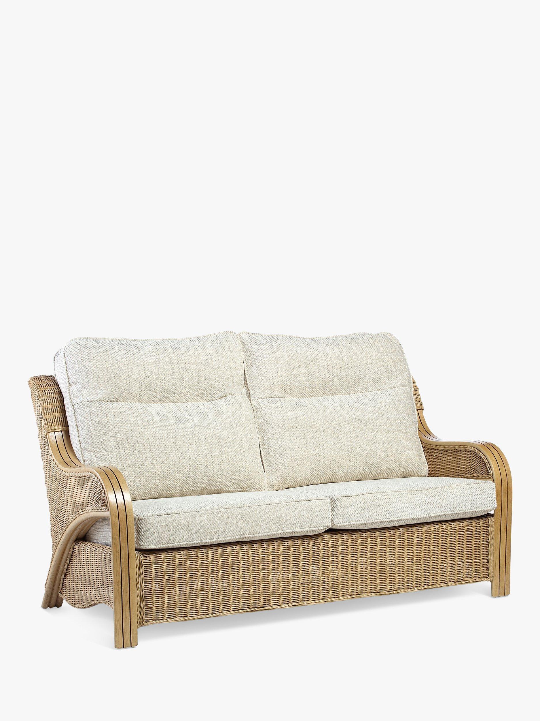 Handmade from natural rattan, the Opera three-seater sofa from Desser features an intricate wicker weave and wood-effect curved cane detailing, creating an attractive piece for the living room or conservatory.