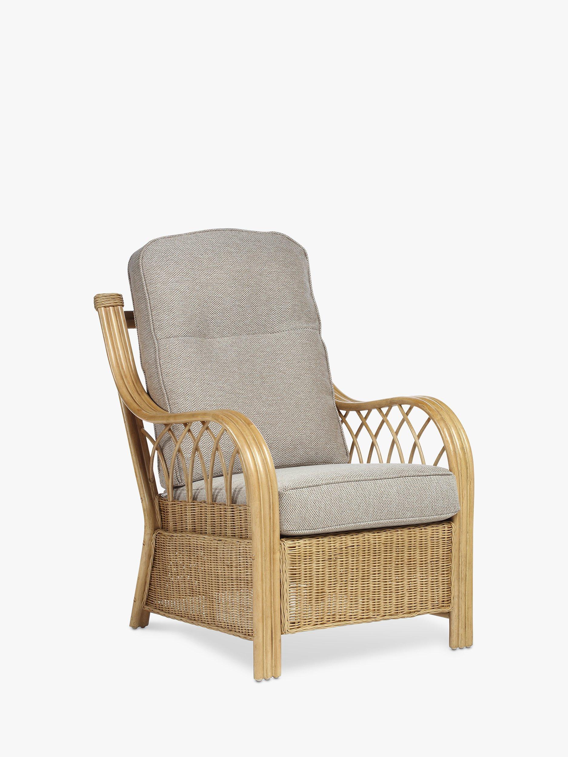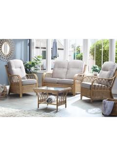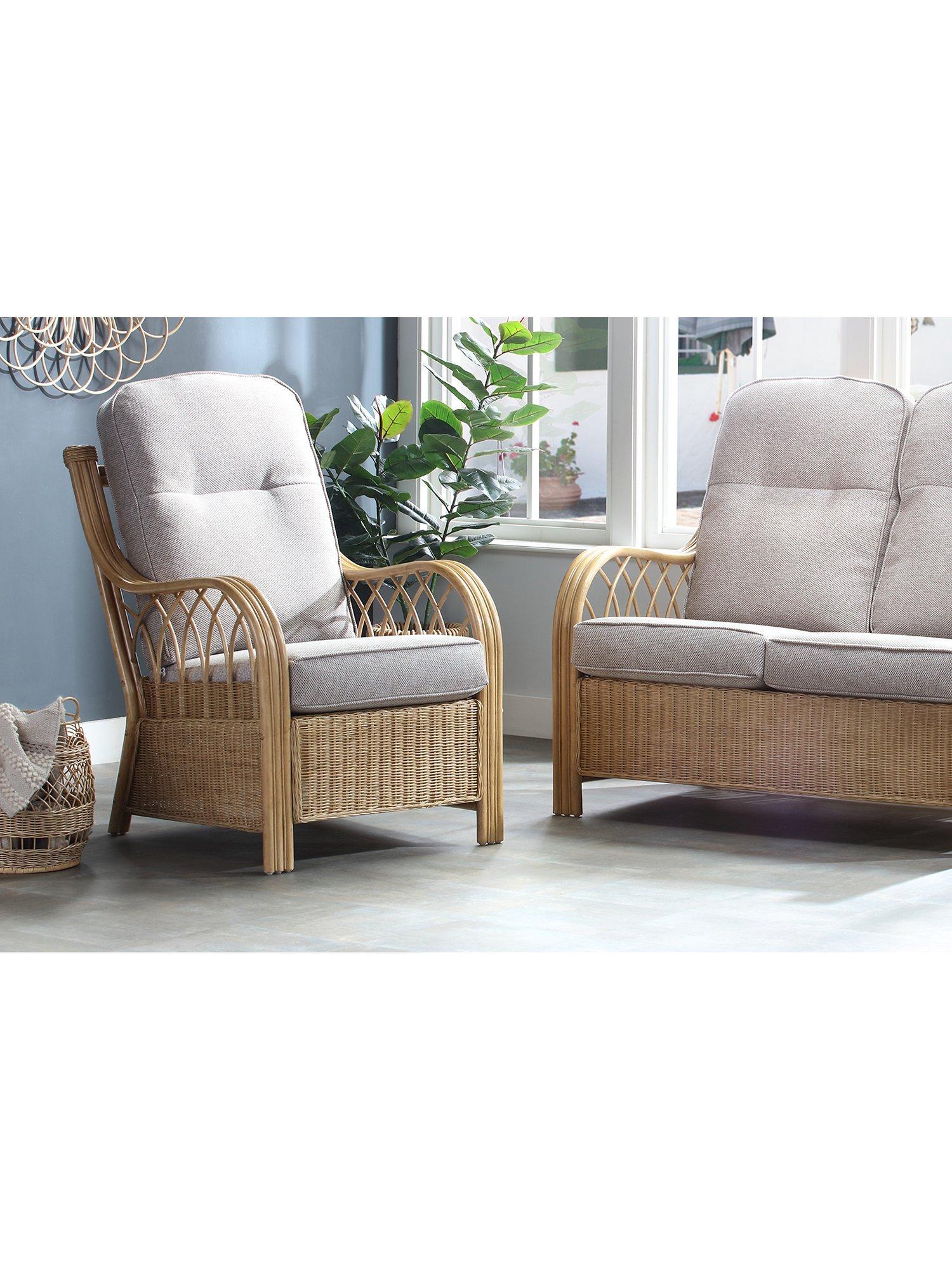 The two-seater sofa and pair of lounge armchairs feature sweeping laminated triple rattan arms and intricate woven and curved cane detailing. The handsewn seat and backrest cushions are made in the UK with a wrapped finish to help prevent wear and tear.