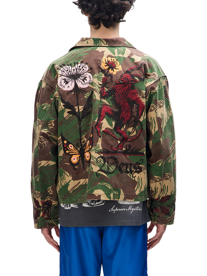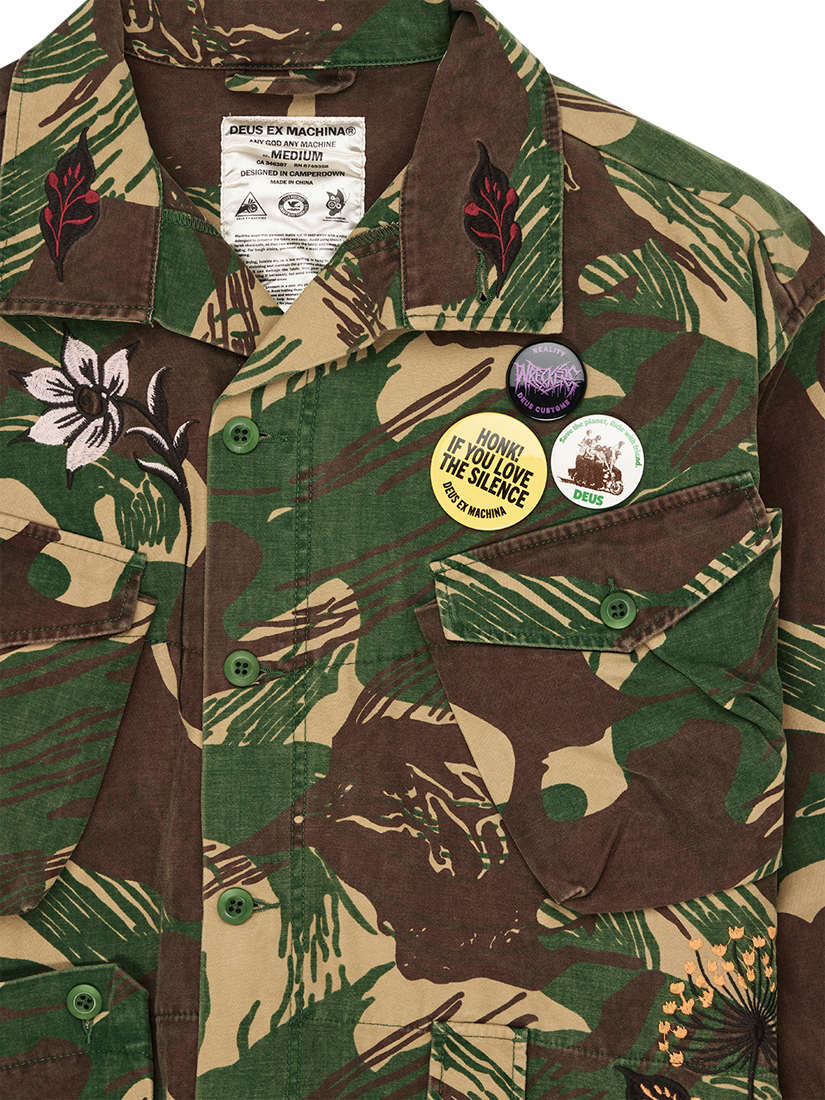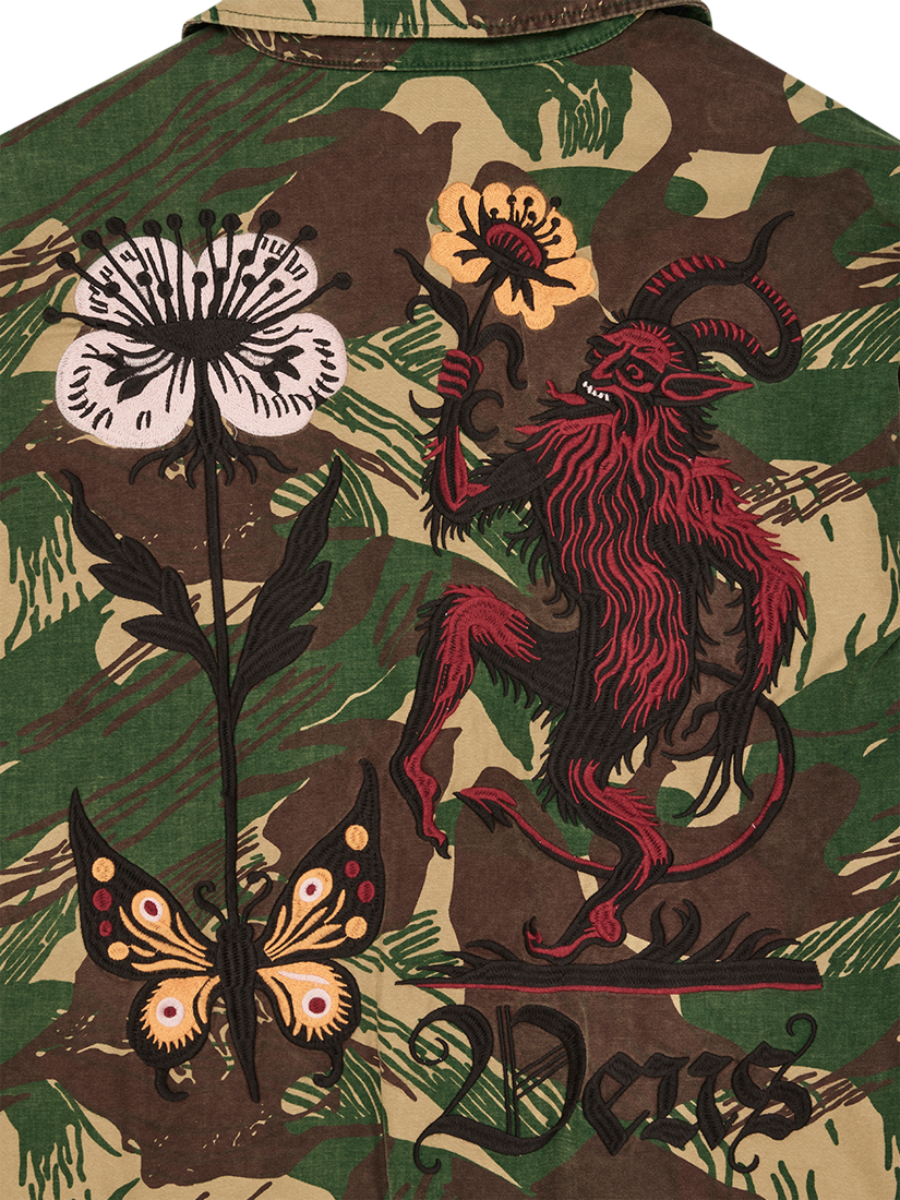 This oversized, utilitarian shirt is made from a heavy cotton sateen that has been heavily washed for a well-worn, aged look. It's detailed with low-sheen embroidery on the front and back, patch pockets on the chest and hips, and a button-front closure. It also includes bespoke Deus Records labels, a high-buttoned collar, and velcro waist adjusters.