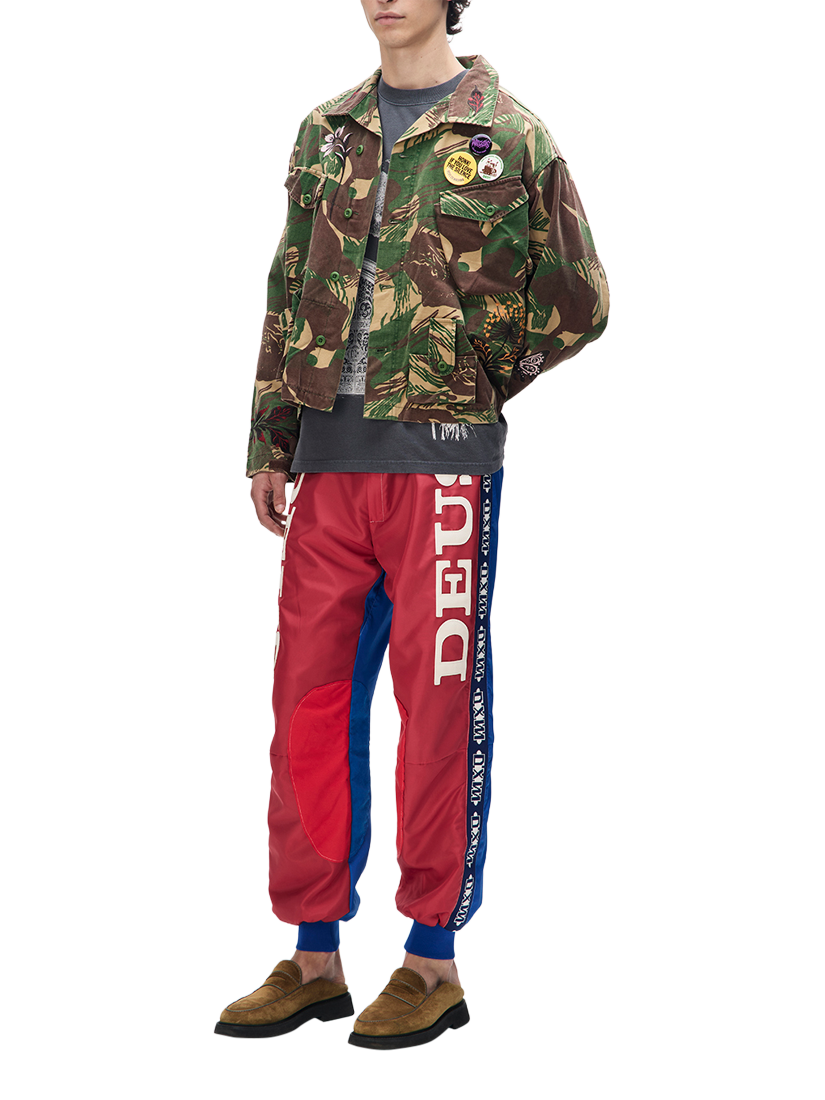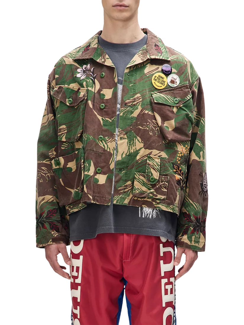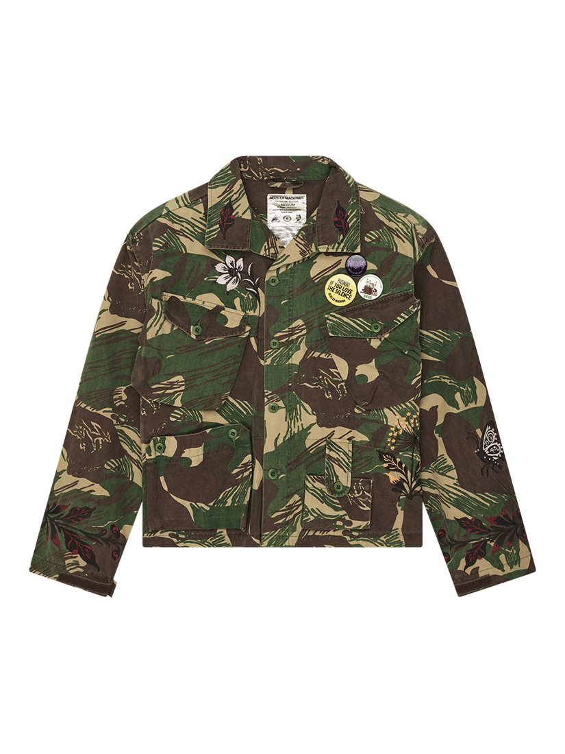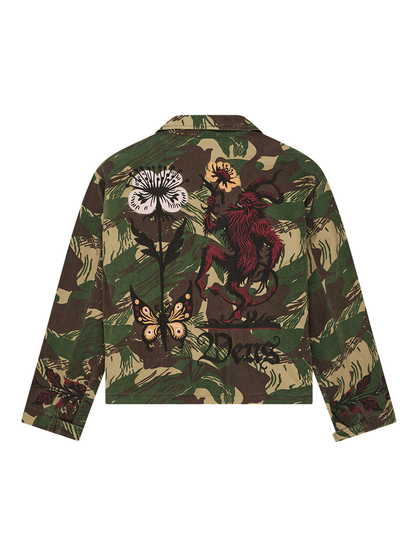 This oversized, utilitarian shirt is made from a heavy cotton sateen that has been heavily washed for a well-worn, aged look. It's detailed with low-sheen embroidery on the front and back, patch pockets on the chest and hips, and a button-front closure. It also includes bespoke Deus Records labels, a high-buttoned collar, and velcro waist adjusters.