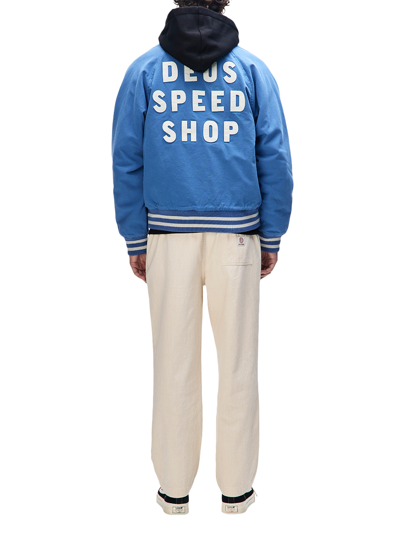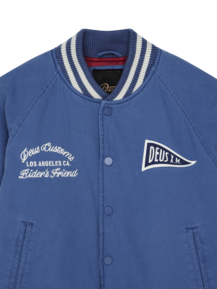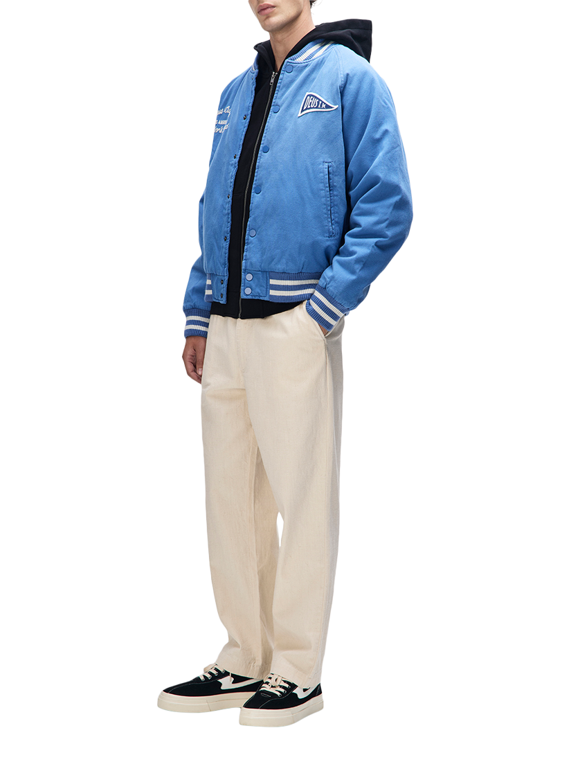 A relaxed fit bomber jacket with chest and back applique, and embroidered art. Designed with lower jet and internal pockets, snap button centre front closure and a ribbed hem and cuffs. The outer shell is made from cotton twill outer shell and is lined with polyester.
