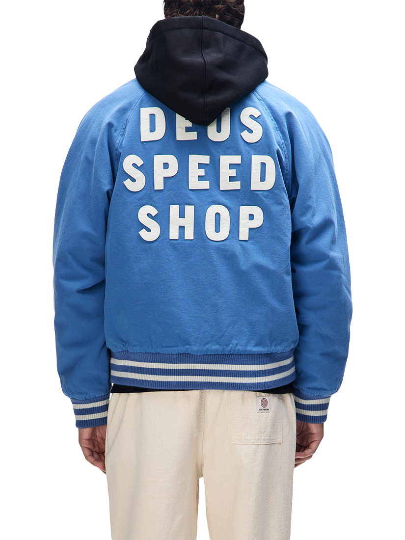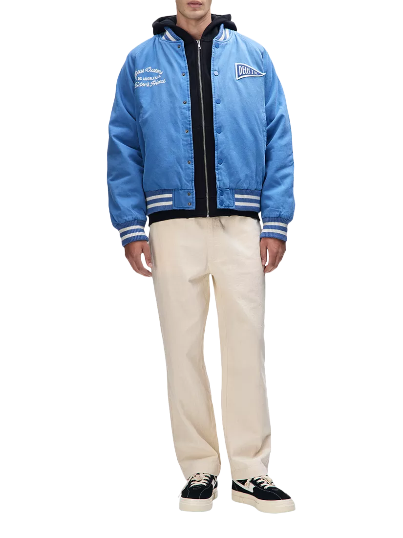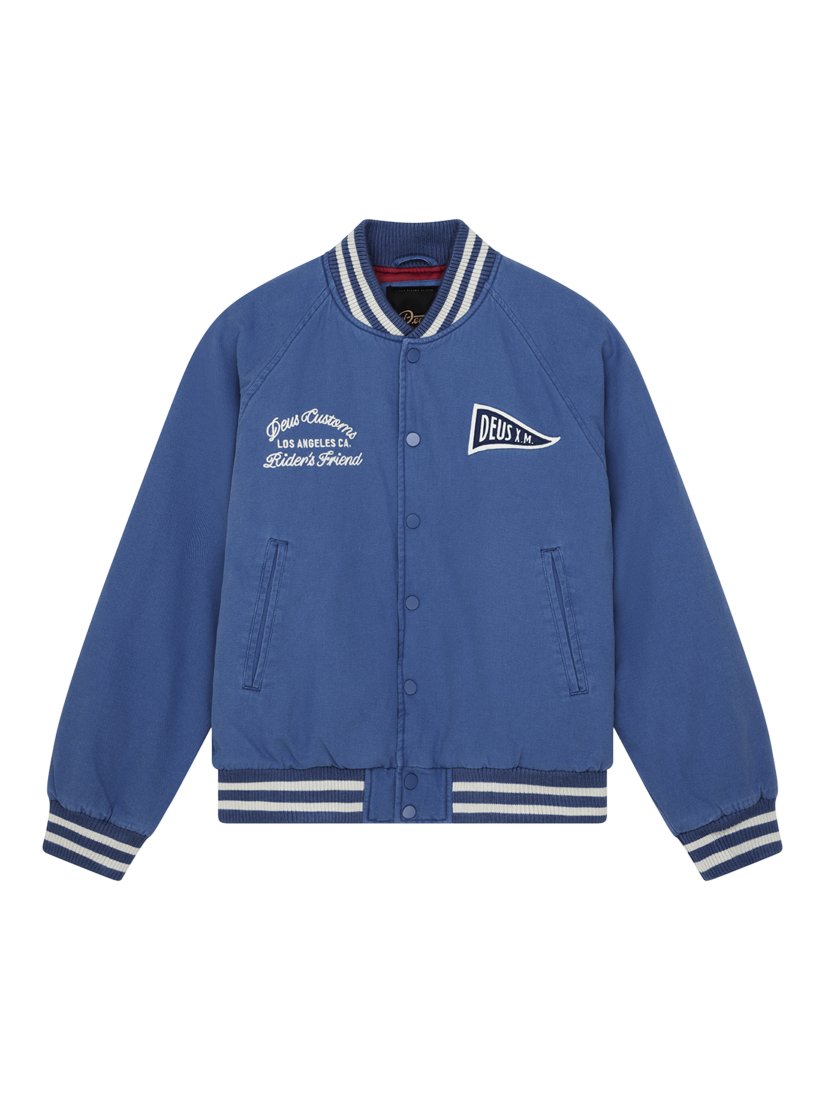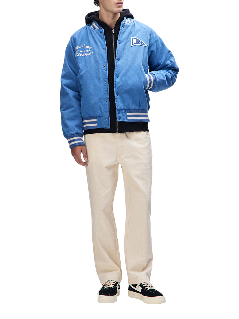 A relaxed fit bomber jacket with chest and back applique, and embroidered art. Designed with lower jet and internal pockets, snap button centre front closure and a ribbed hem and cuffs. The outer shell is made from cotton twill outer shell and is lined with polyester.