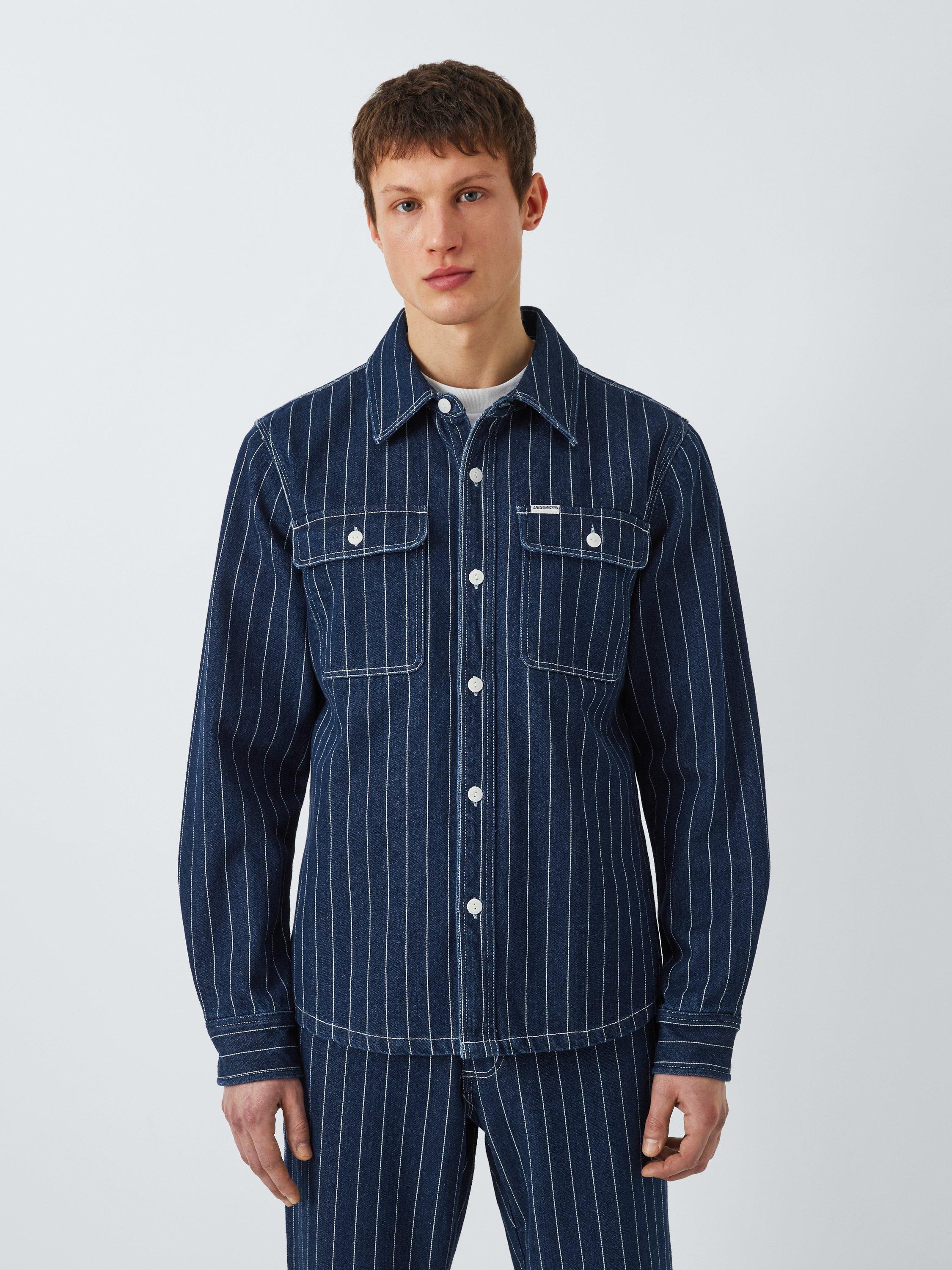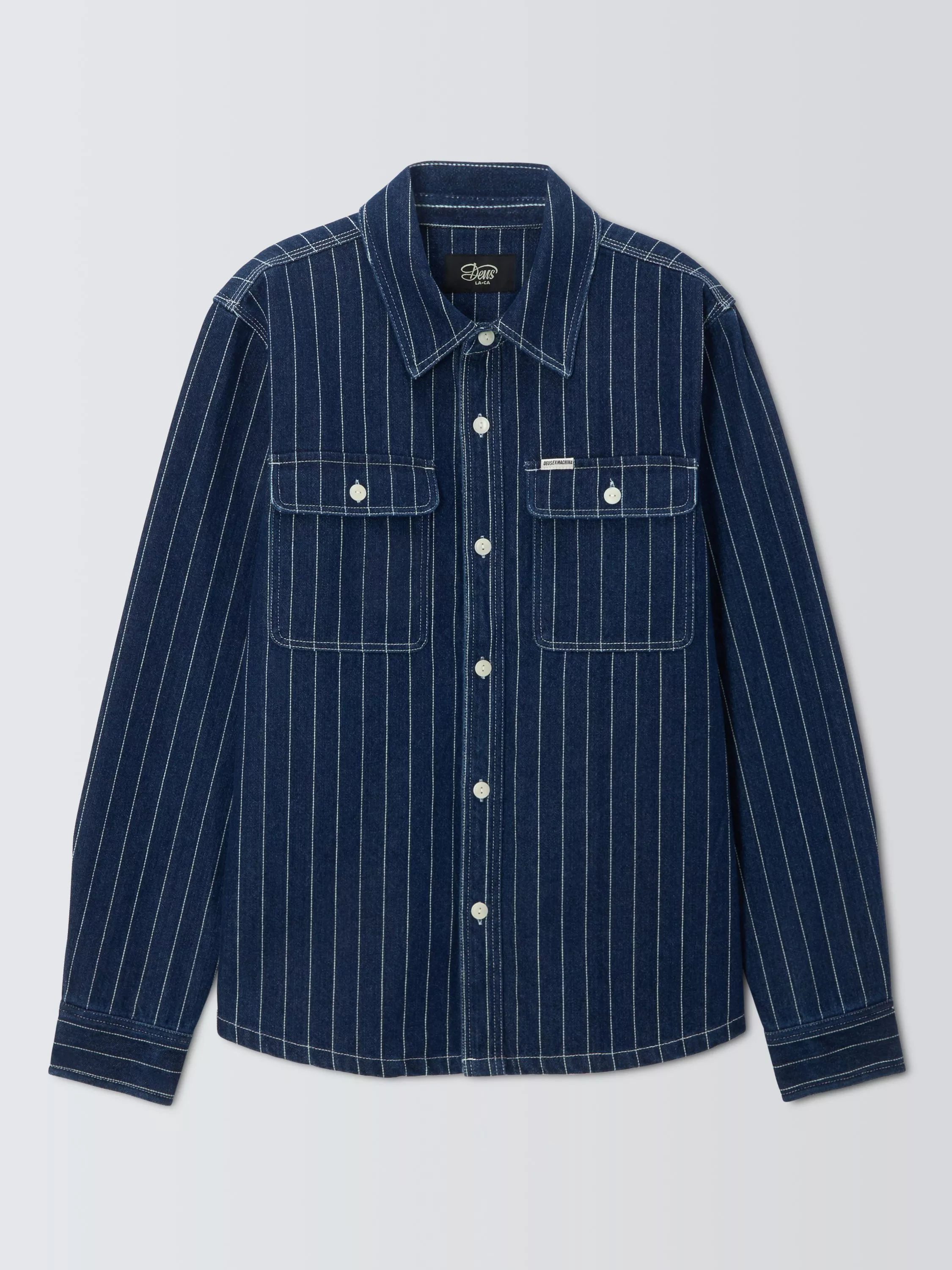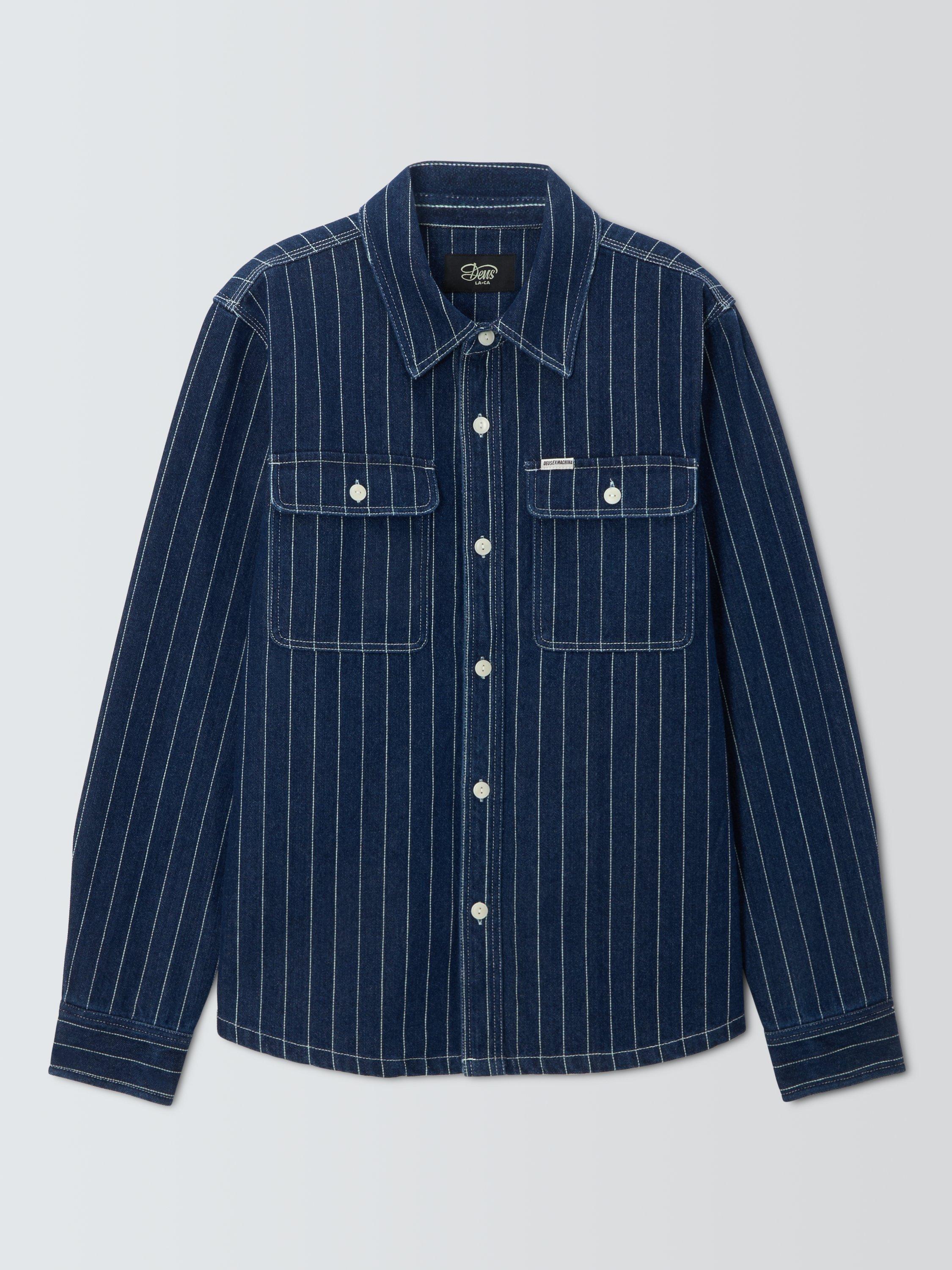Regular fit over shirt with branded clip label on chest pocket, front patch chest pockets, corozo nut button centre front closure, in a cotton twill dobby stripe fabrication with a heavy enzyme stone wash.