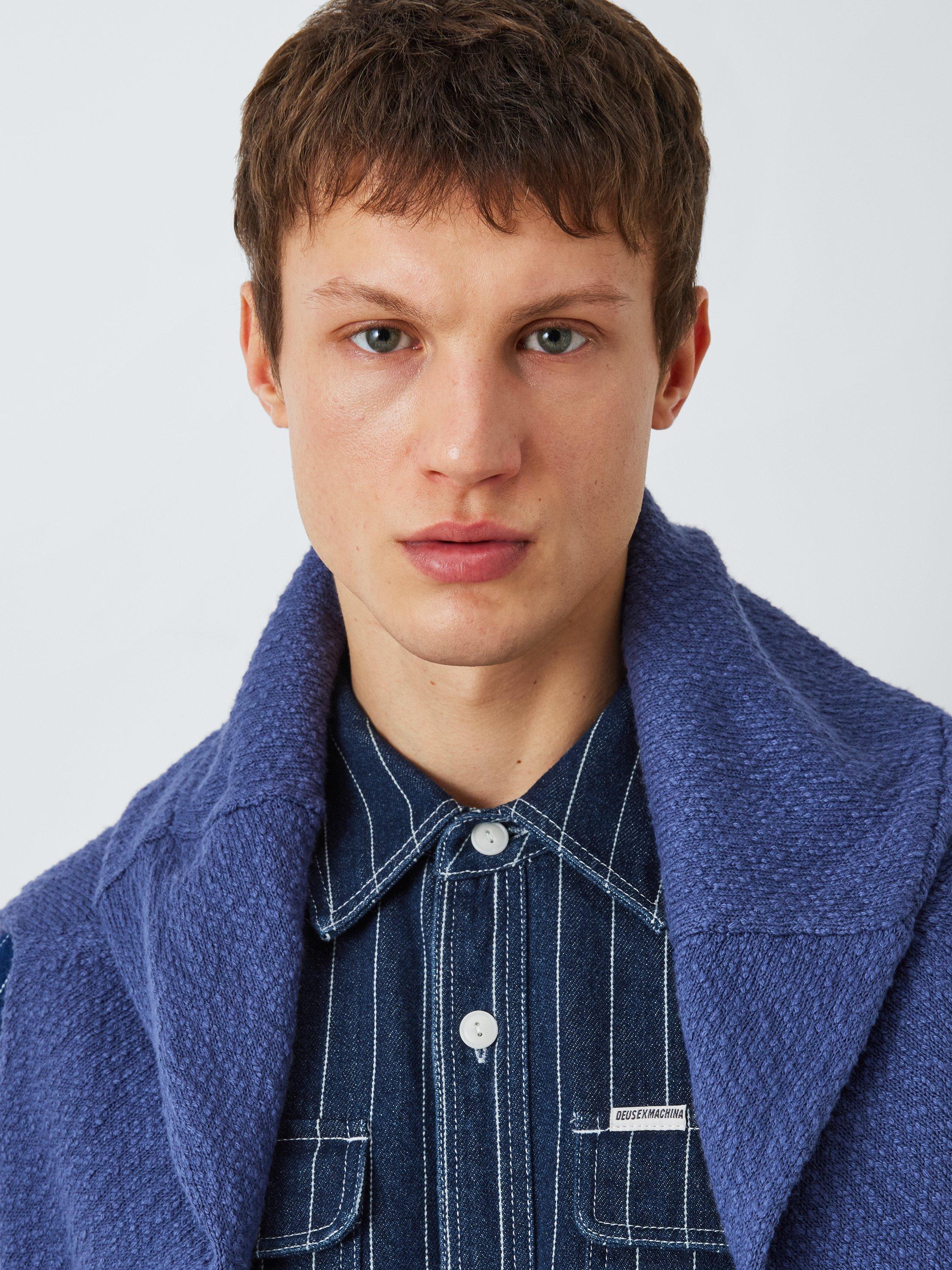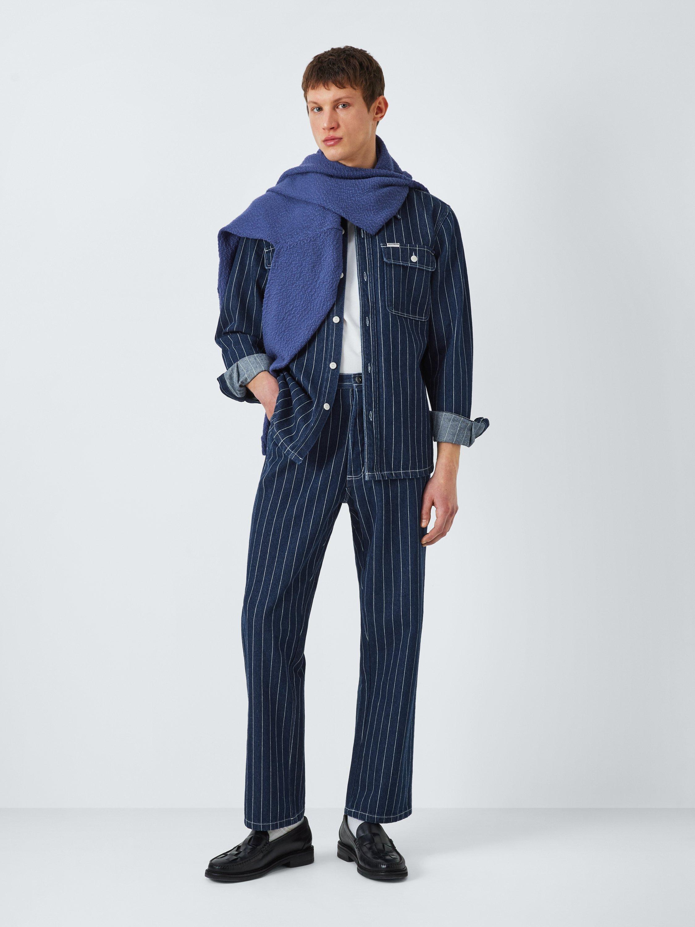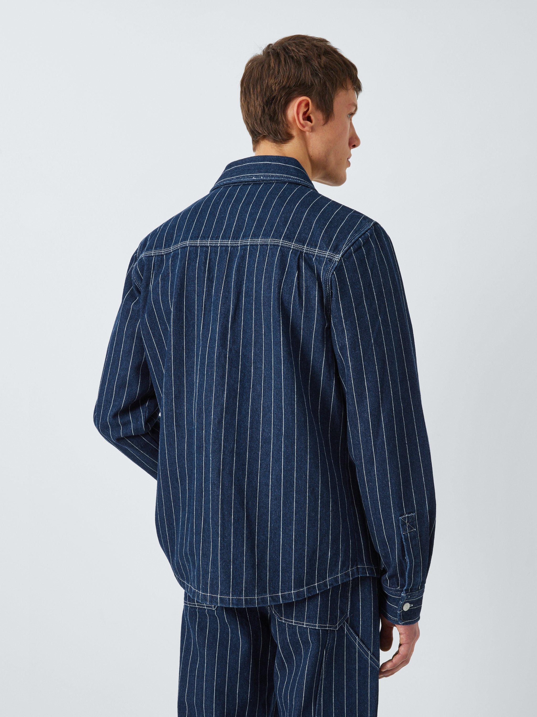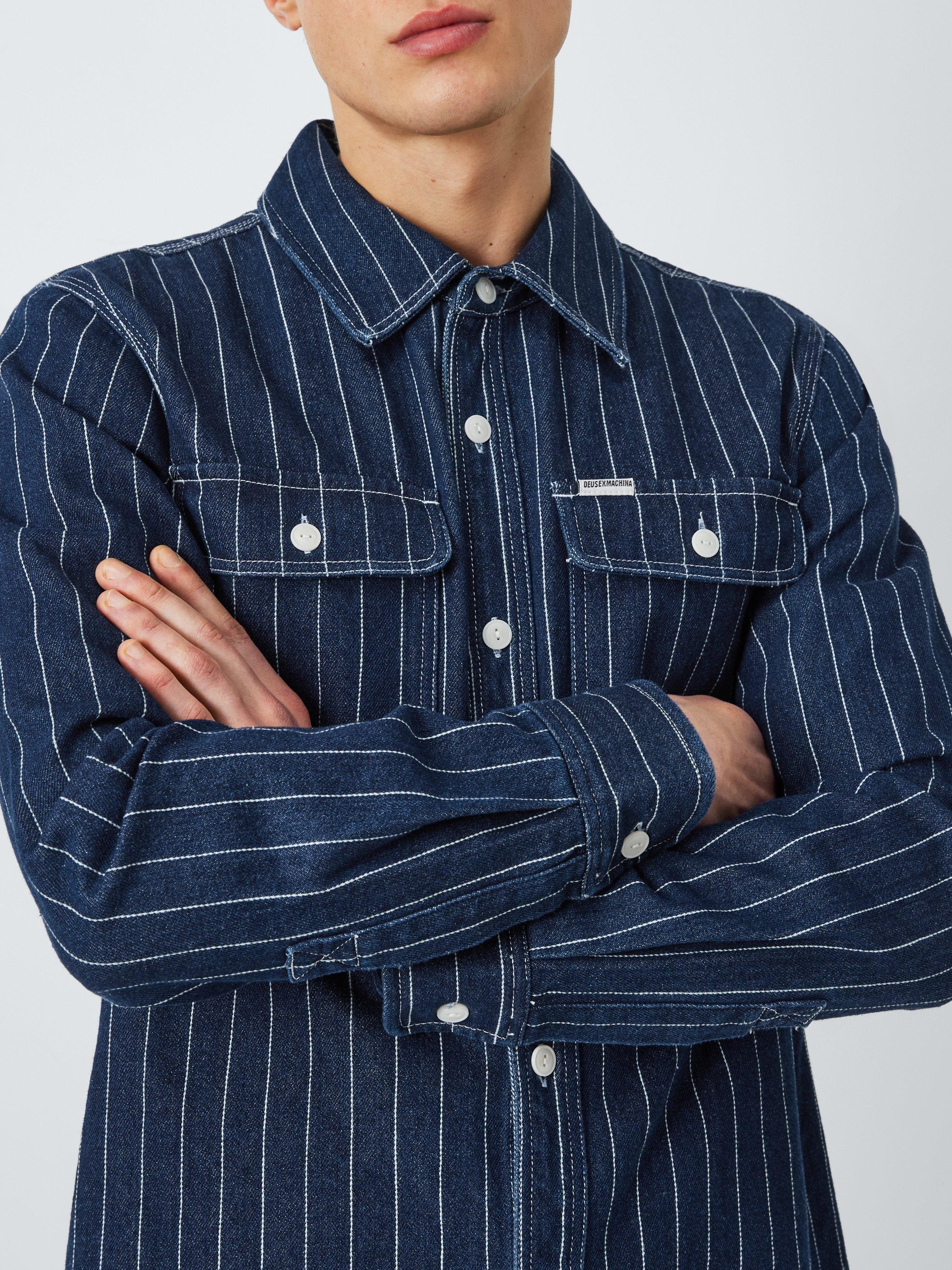 Regular fit over shirt with branded clip label on chest pocket, front patch chest pockets, corozo nut button centre front closure, in a cotton twill dobby stripe fabrication with a heavy enzyme stone wash.