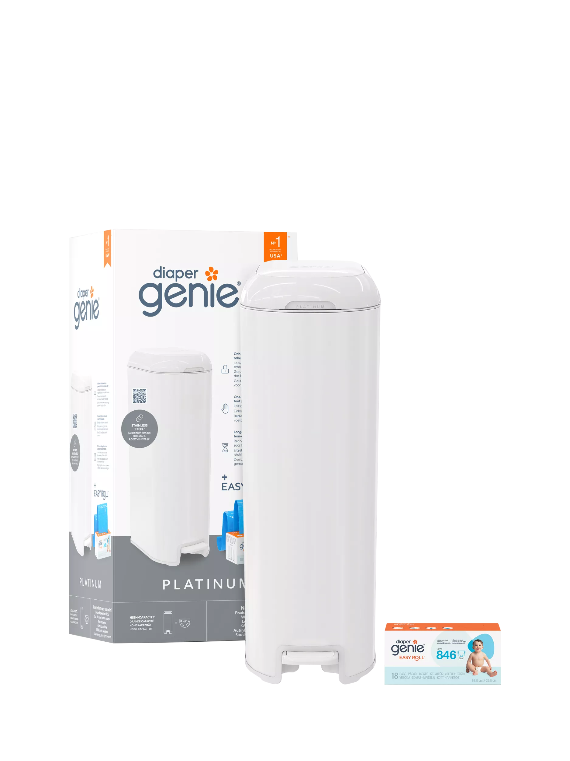 Keep your nursery fresh! The new Diaper Genie Platinum Bin is made of durable stainless steel and has odour-locking clamps that help prevent odours of messy nappies from escaping.