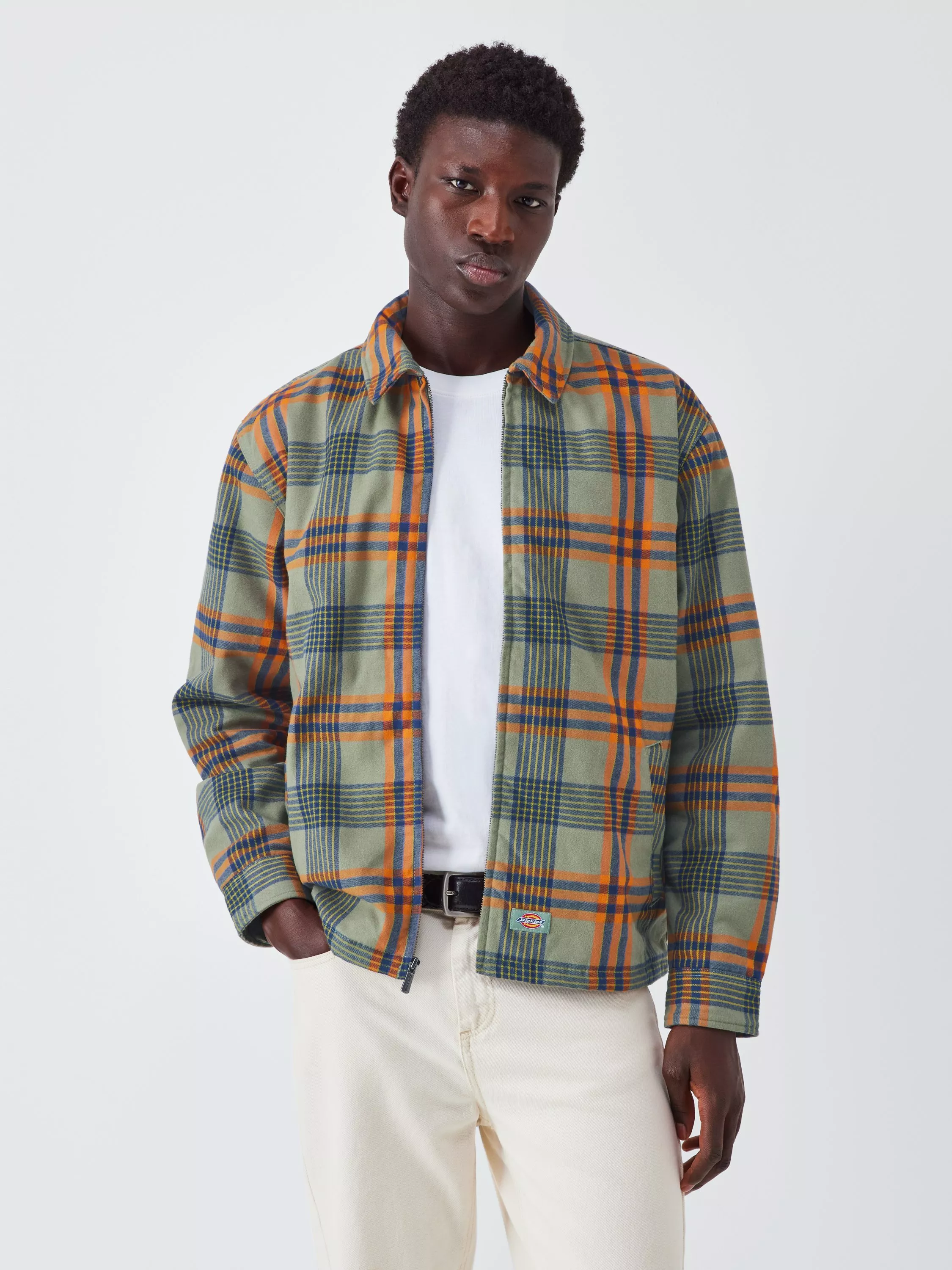 The Petersburg Shacket is a boxy fit, straight hem, plaid shacket for men that's made out of a soft sustainable BCI Cotton and recycled polyester. This extra brushed shacket features a painter zip chest pocket, full double zip closure, metal snap closures on the cuffs, and woven the iconic Dickies label above the hem. A cosy shacket with classic winter styling.