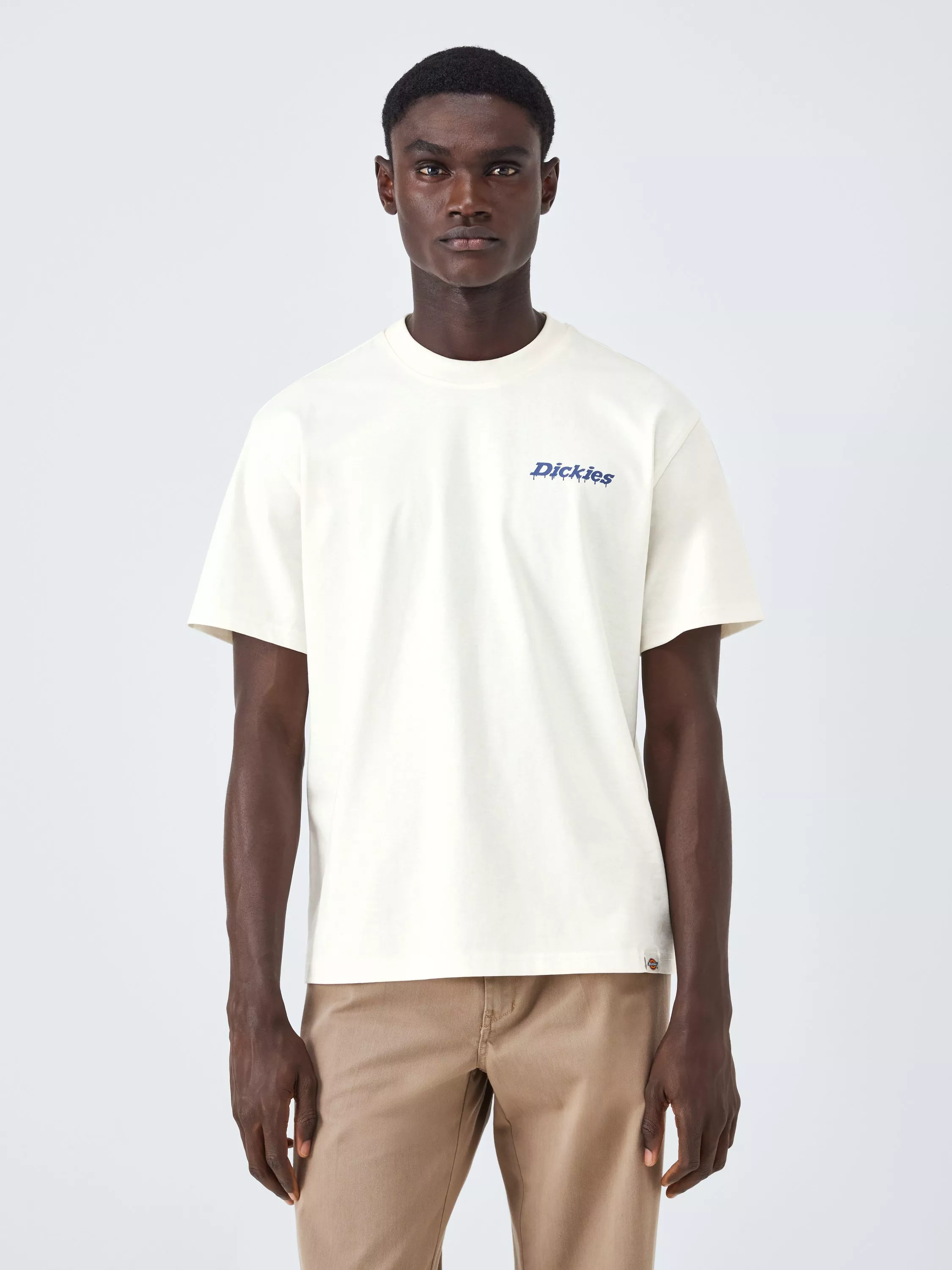 A relaxed fit T-shirt for men made with a sturdy 200GSM cotton jersey. It features a screen-printed dripping paint Dickies logo on the left chest, a large expanded painter illustration on the back, and a woven Dickies hem loop label.