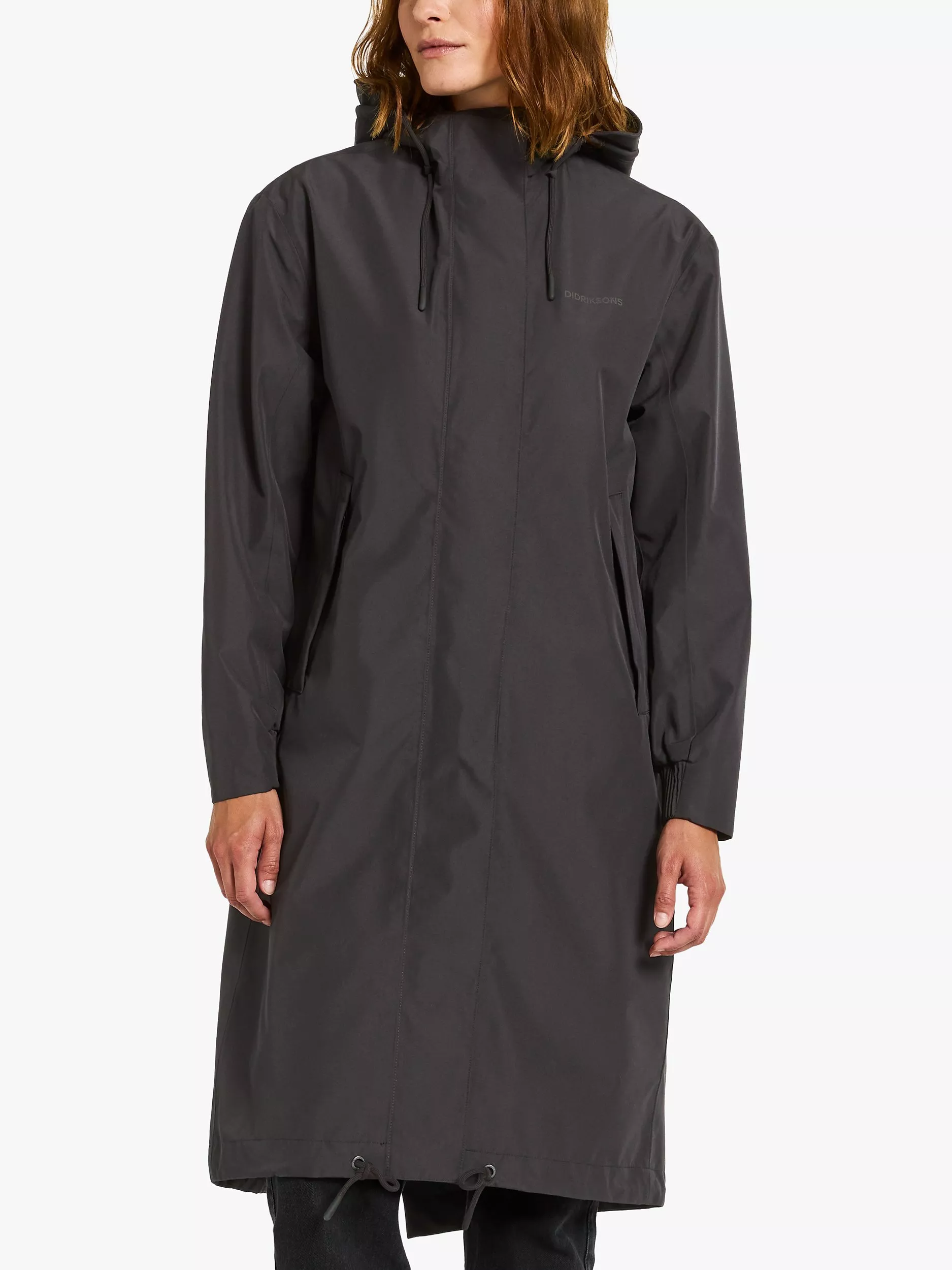 With an adjustable hood and lower zip pockets, it is made from a woven fabric with a matte cotton handfeel.