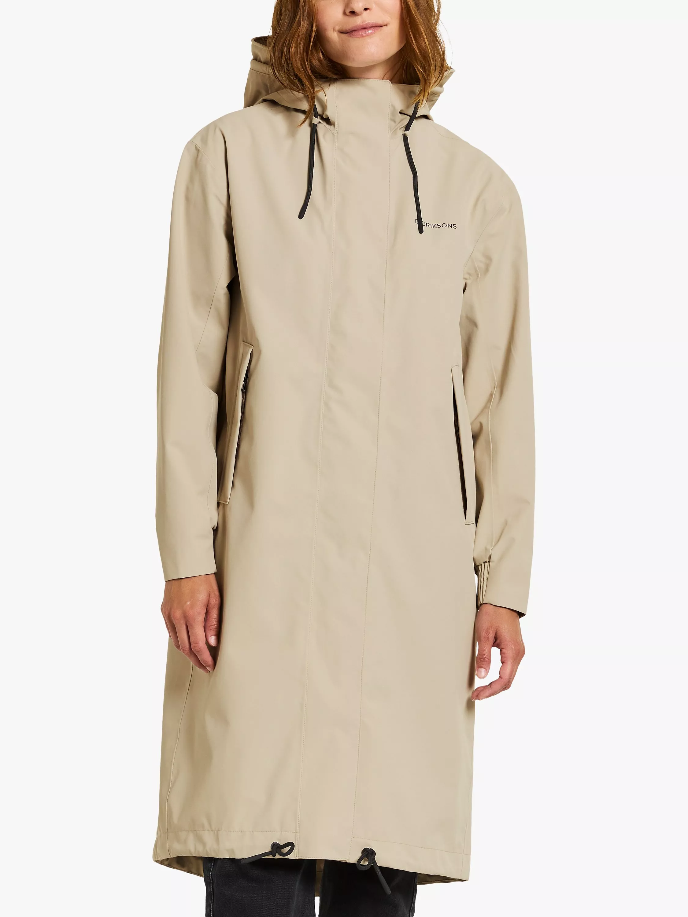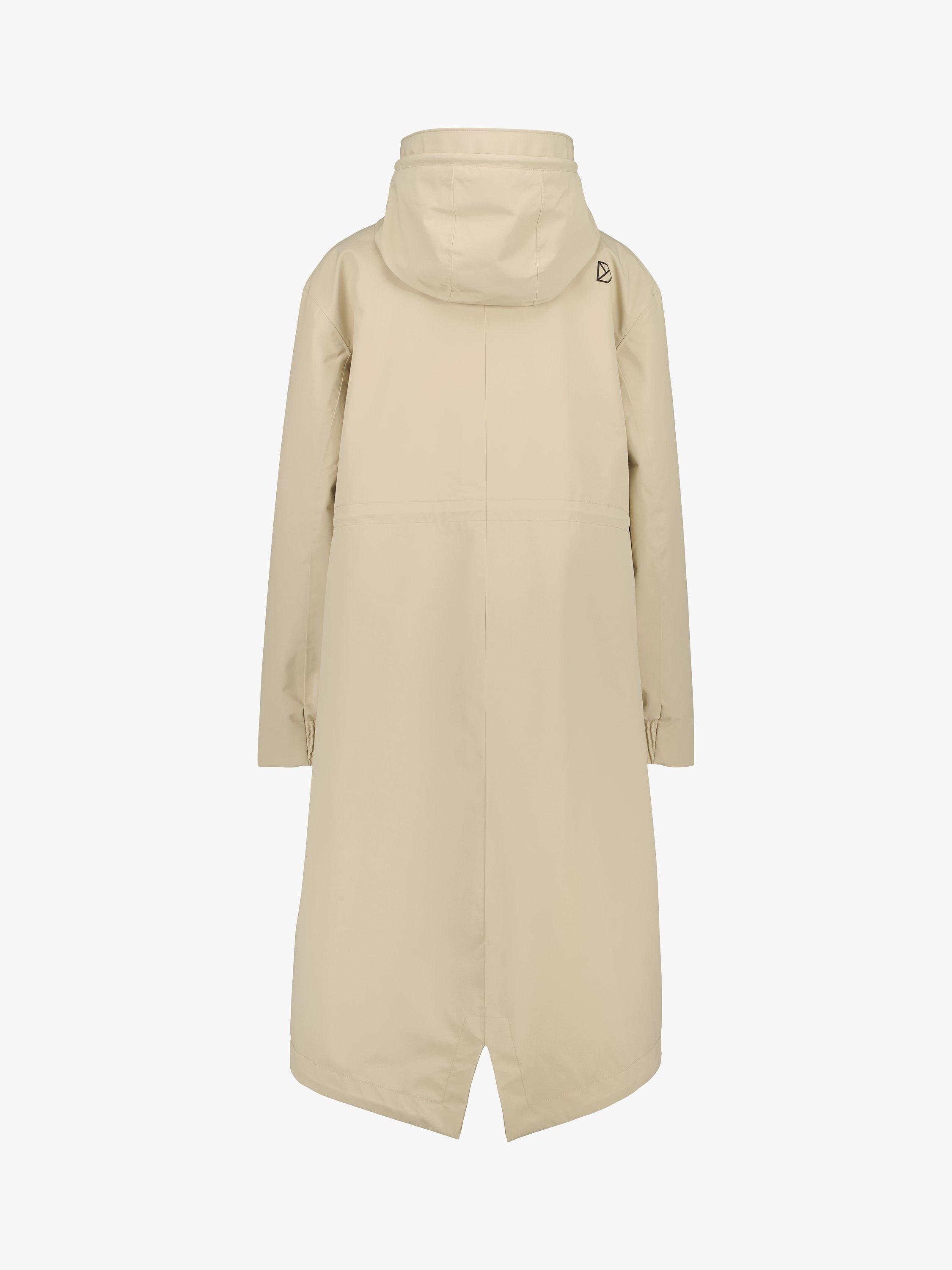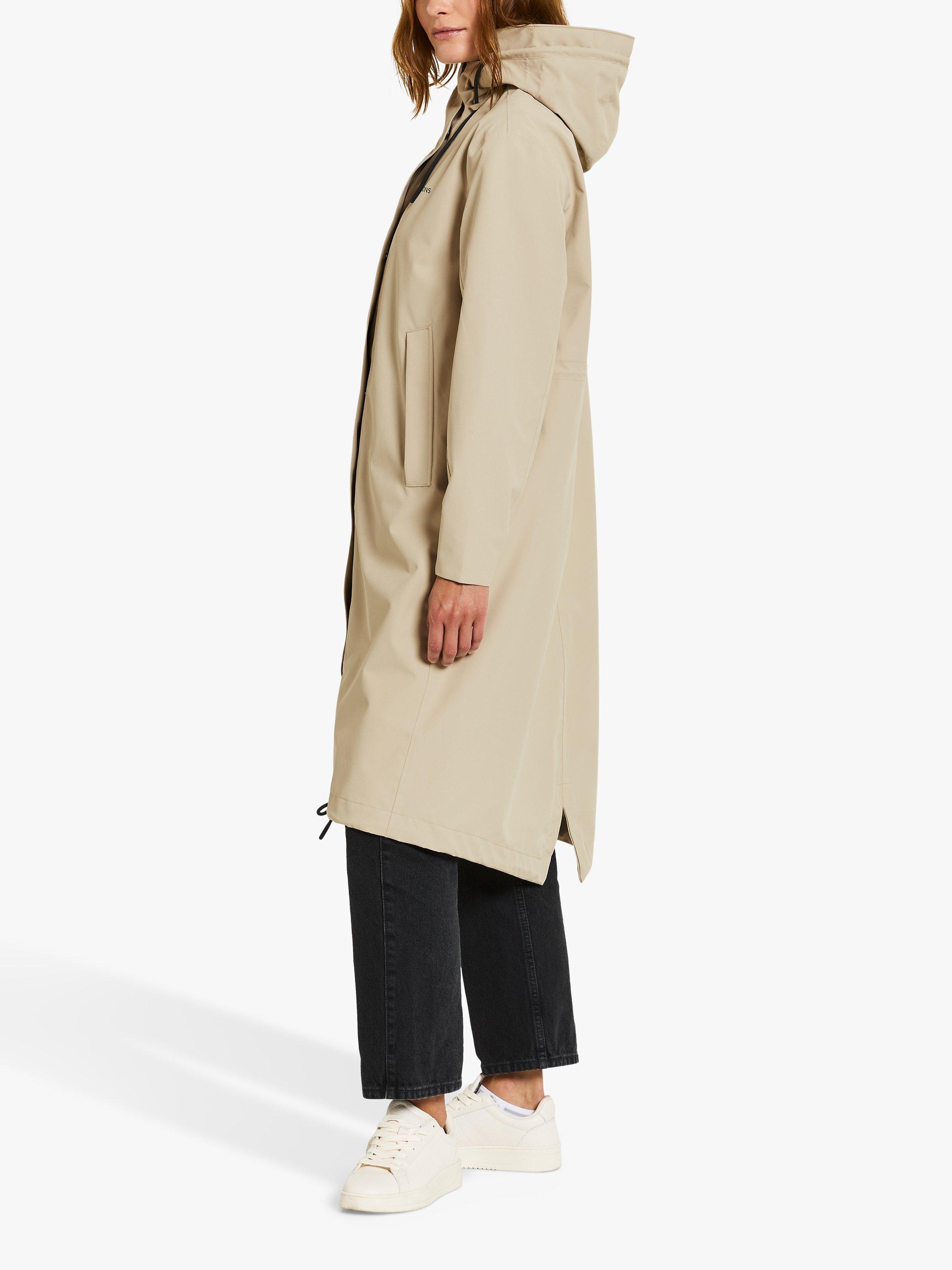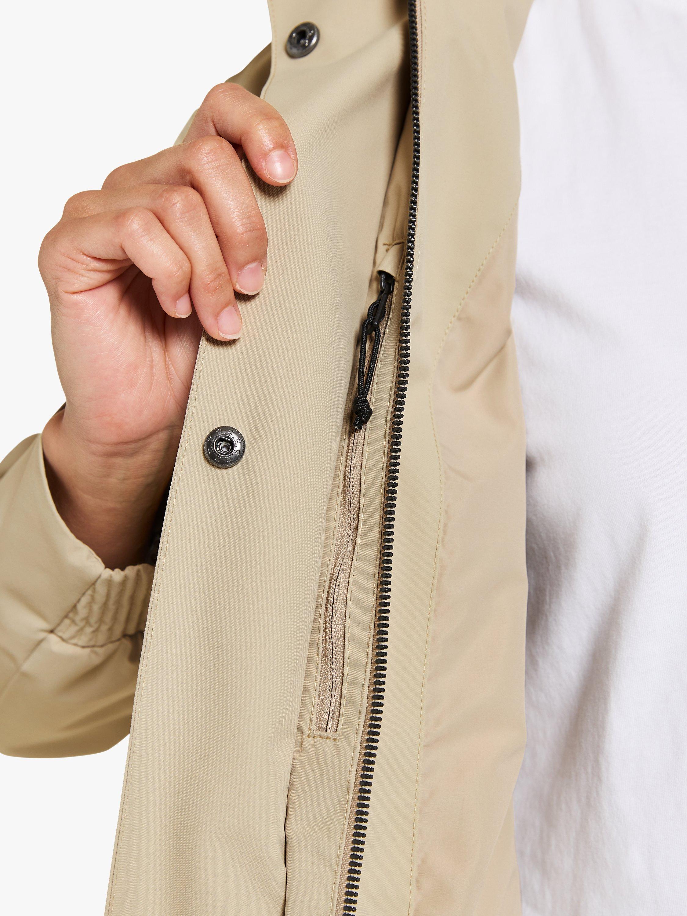 With an adjustable hood and lower zip pockets, it is made from a woven fabric with a matte cotton handfeel.