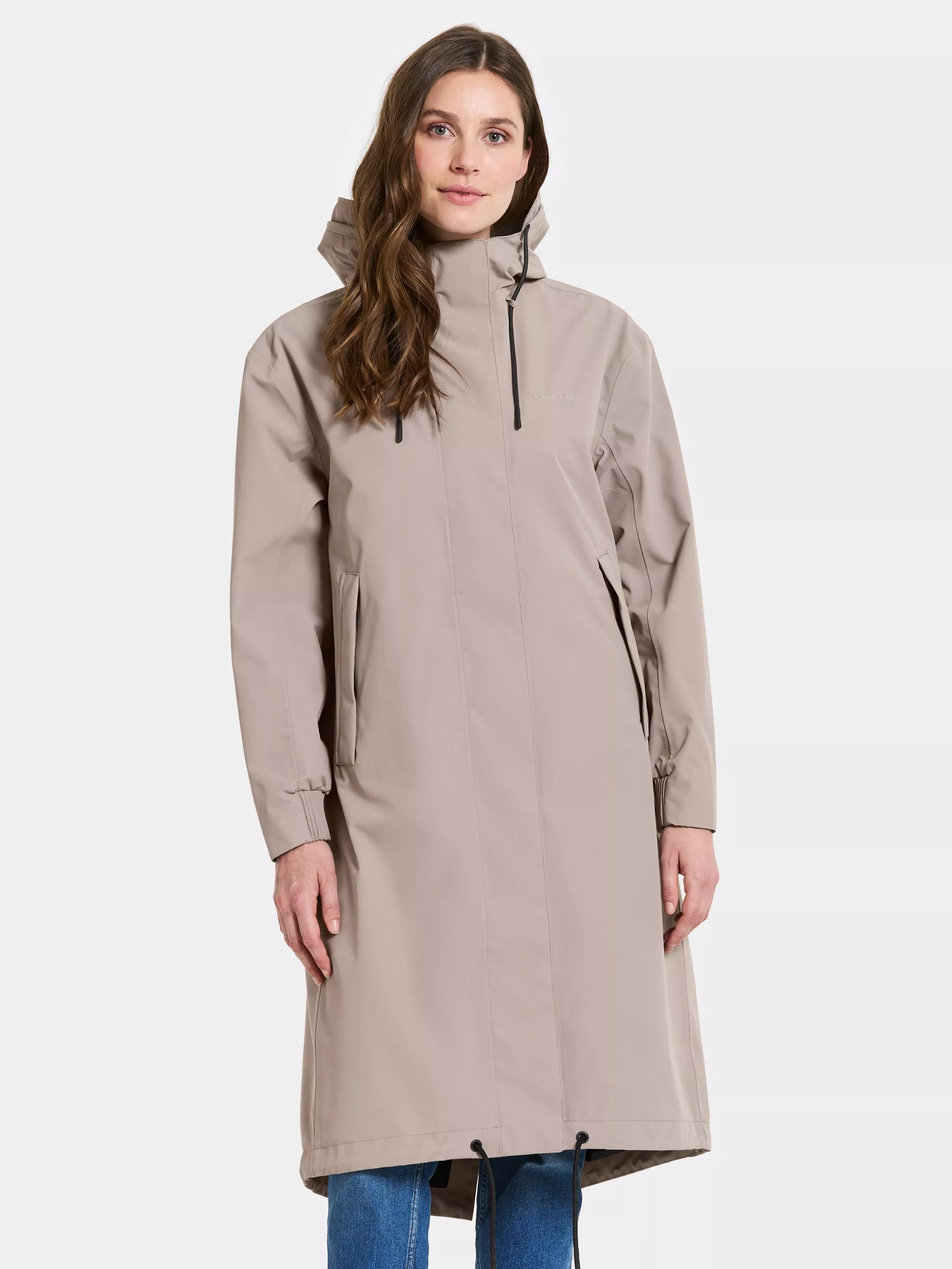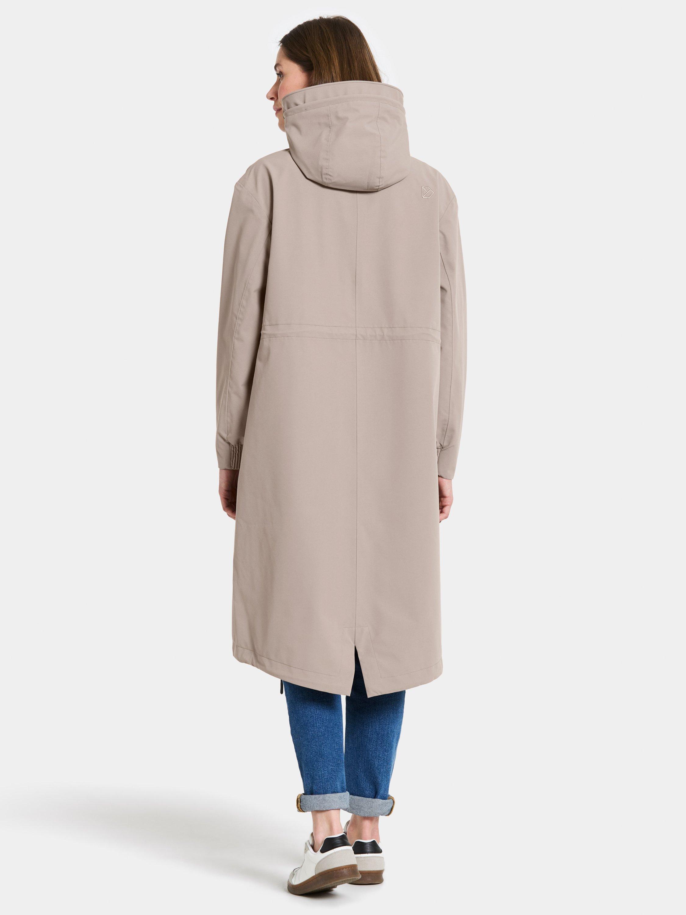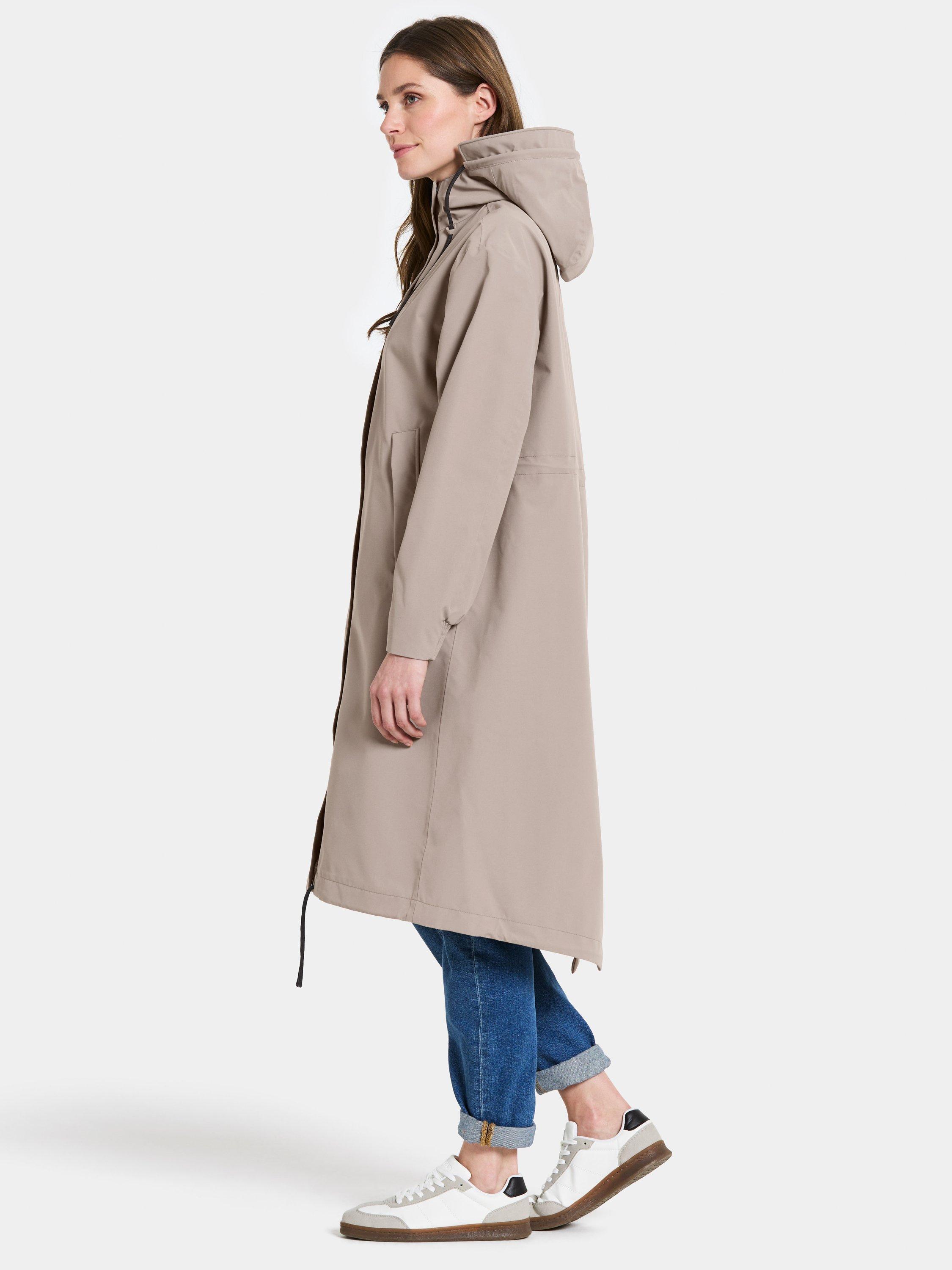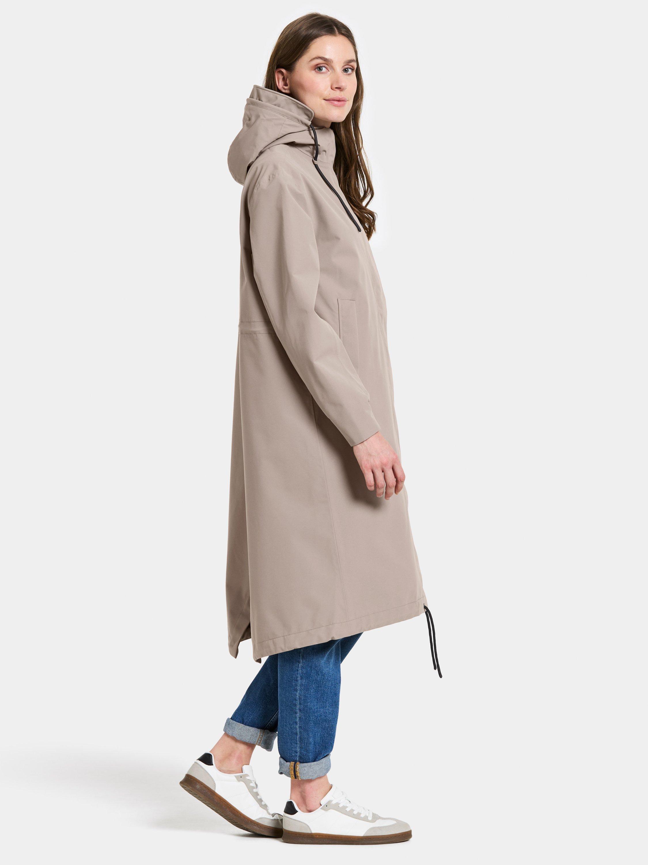 Astrid is a long parka. It's designed to protect against the weather with its waterproof, windproof and breathable fabric. The parka has a relaxed fit and adjustable waist. The fixed hood has an extra protective brim and can be adjusted in two directions for an optimal fit. The parka has practical details such as a zip with chin guard, a placket with buttons and a zip closure at the front. The side pockets and inner zipped pocket offer secure storage. The adjustable drawstring hem and elastic cuffs provide extra comfort. The parka has a PFC-free water-repellent finish.
