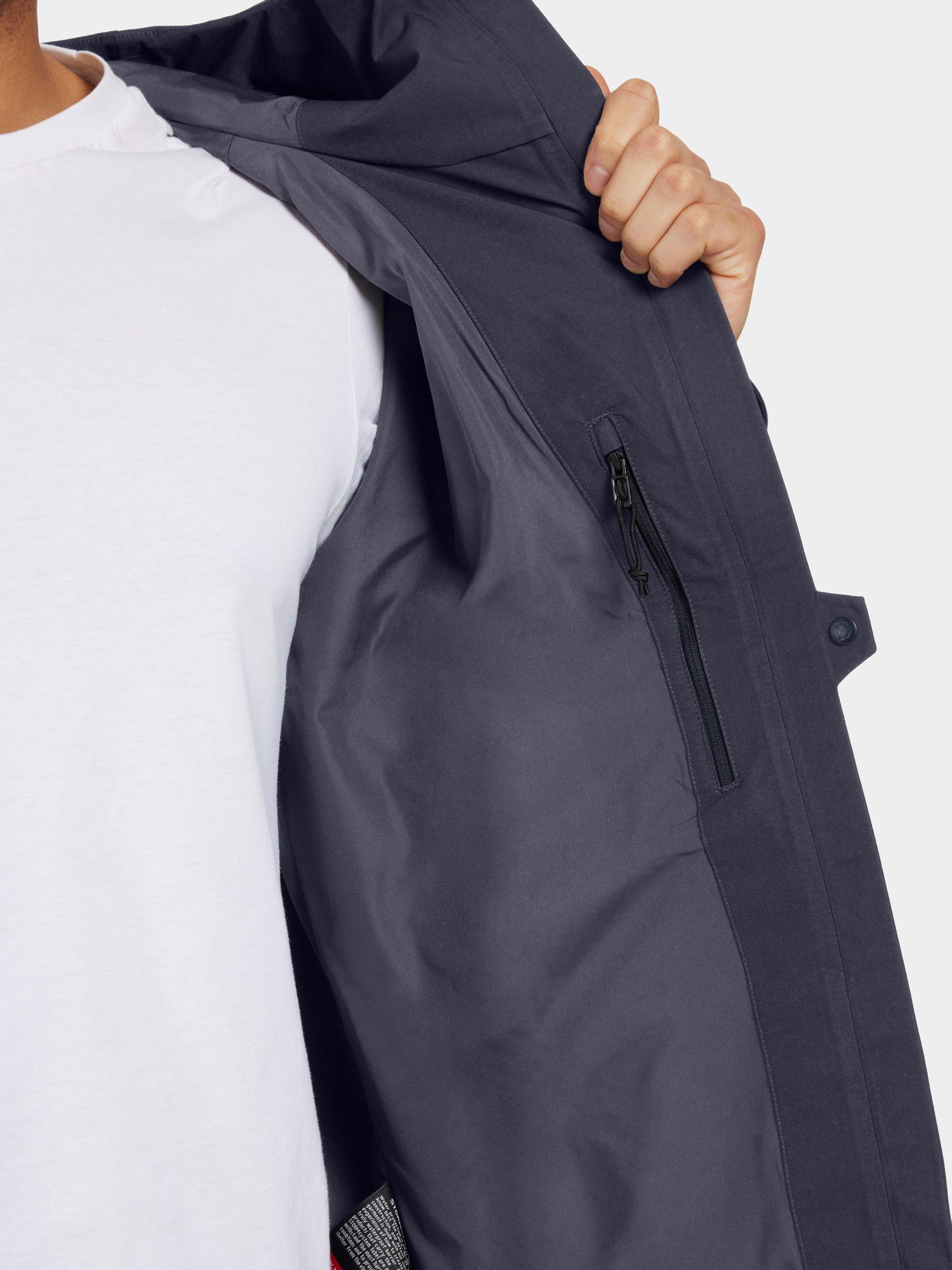 The jacket is windproof and waterproof with taped seams and made from a breathable material. It has a straight fit and is equipped with a two-way zip. The jacket has a fixed hood with a shaped brim that can be adjusted in two directions. The cuffs can be adjusted with Velcro and the hem can be adjusted with a drawstring. Practical pockets include an inner zipped pocket and two outer zipped pockets for secure storage. Reflective details, including a logo and zip details. The jacket has a PFC-free water-repellent finish.