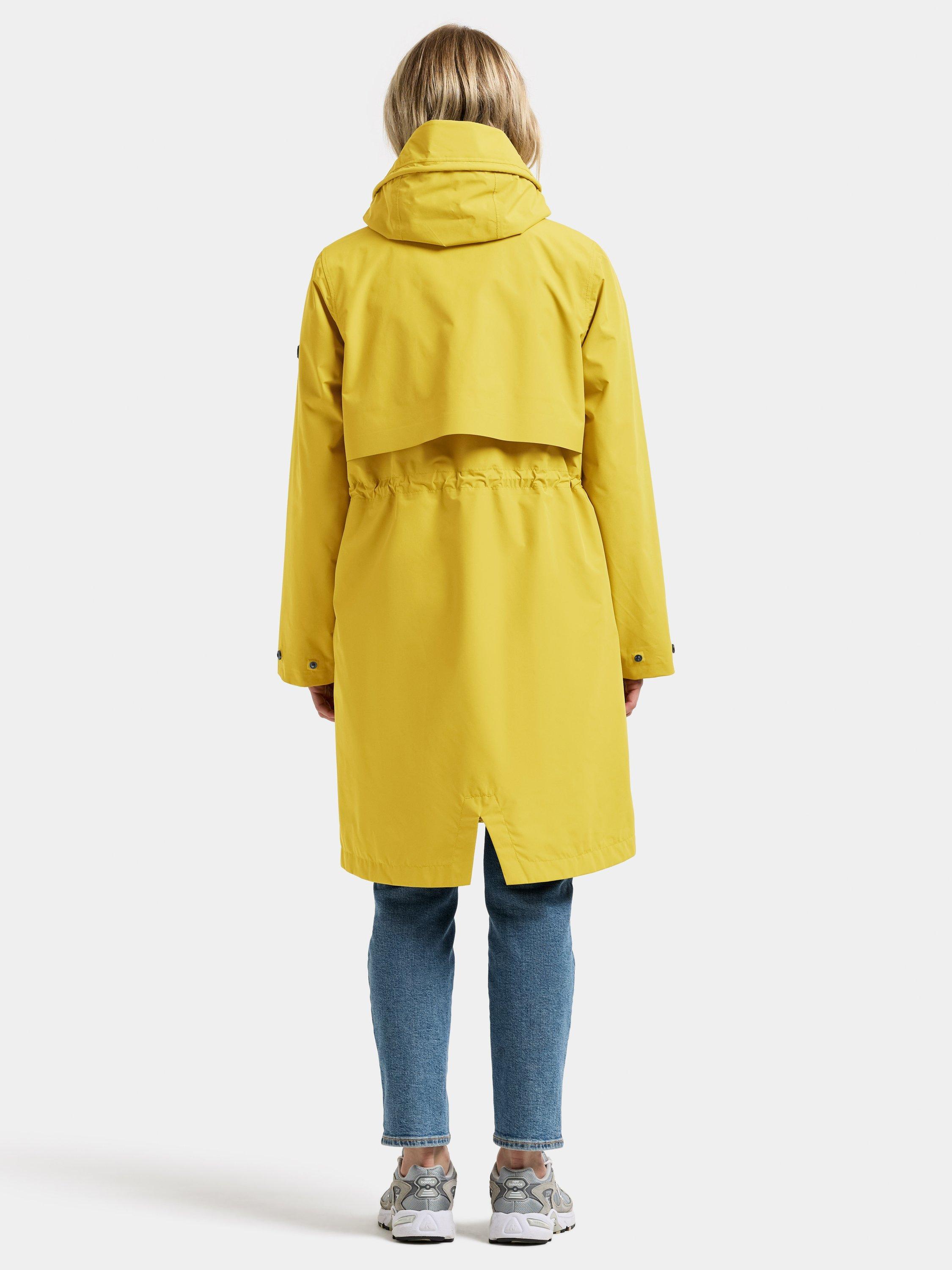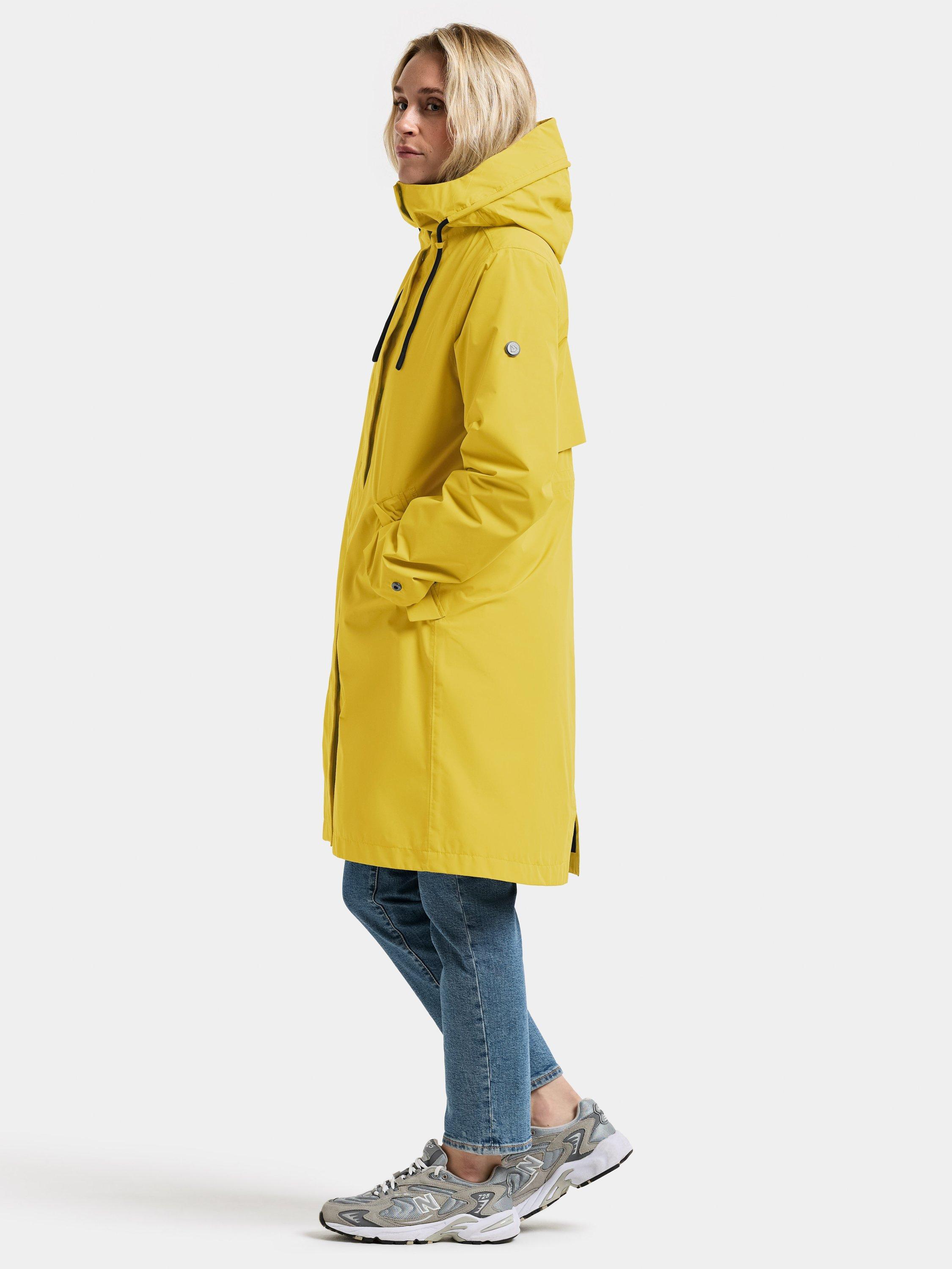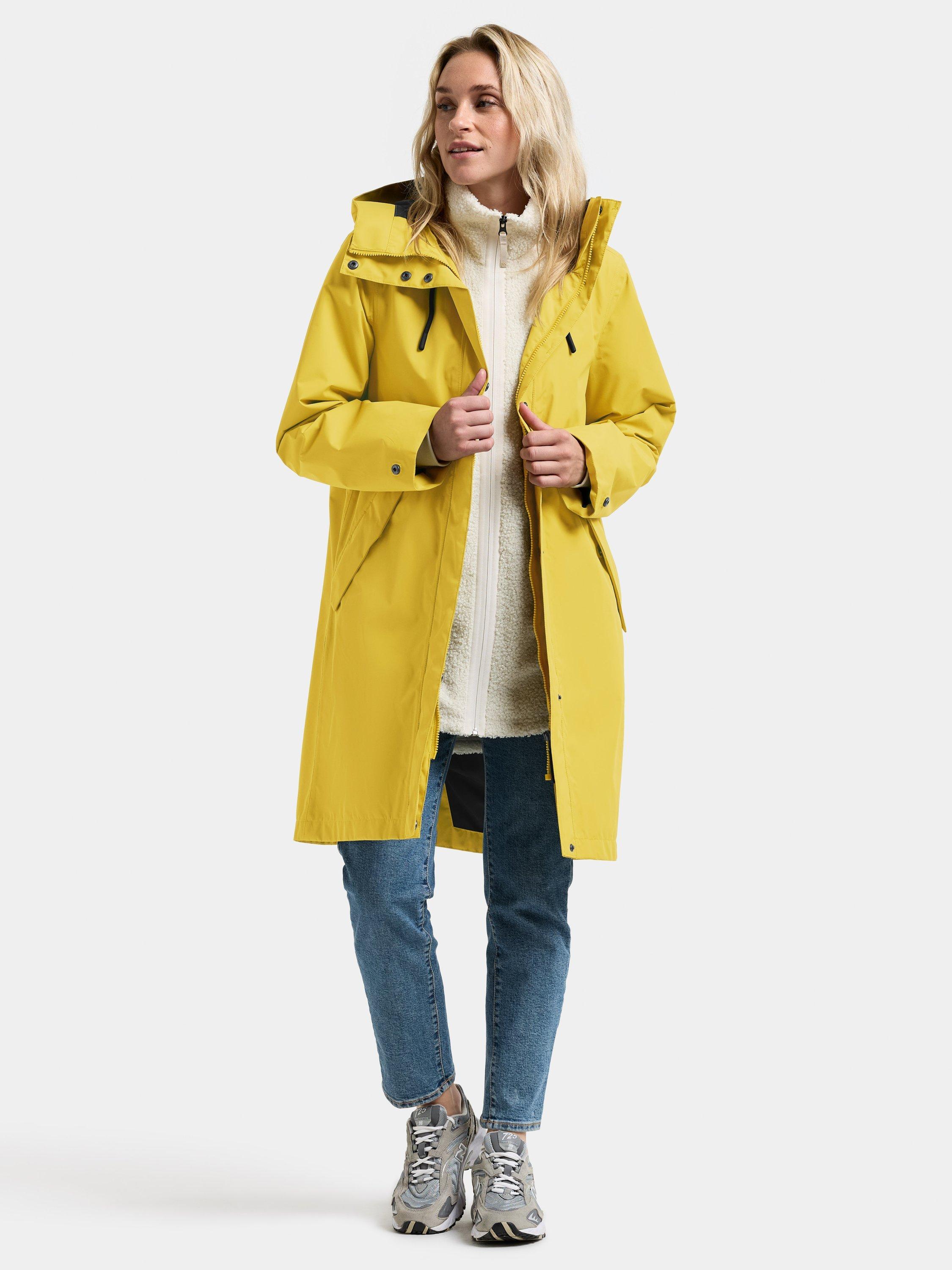 Elina is a waterproof everyday parka that combines style and function. It is designed to suit both urban environments and outdoor activities. The parka features an adjustable hood with a drawstring and a front zip protected by a buttoned placket. The waist can be adjusted from the inside with a drawstring for a personalised fit. The cuffs are easily adjusted with buttons, and the side pockets close with buttons for secure storage. The parka is water and windproof with taped seams and made from a breathable material.