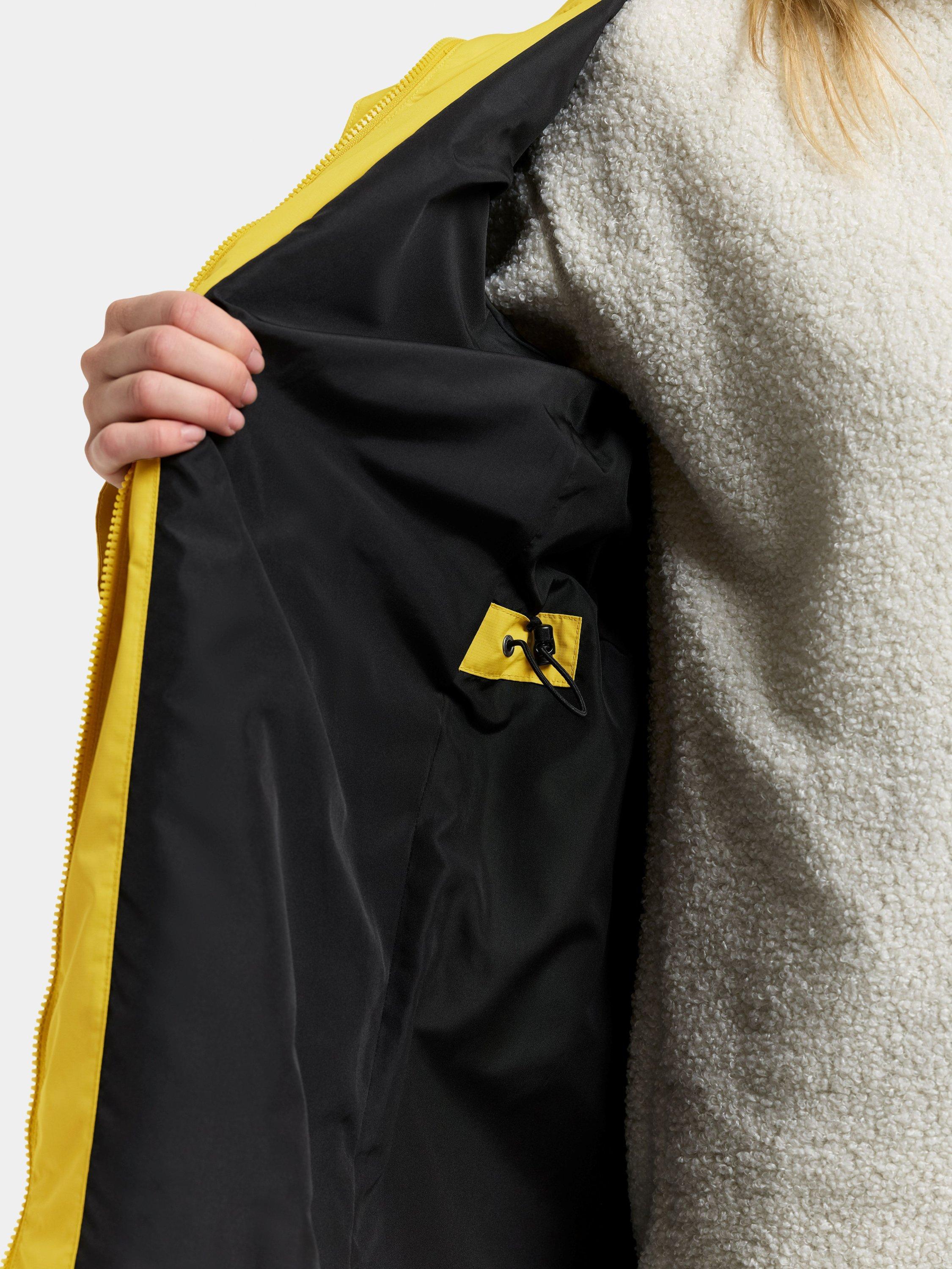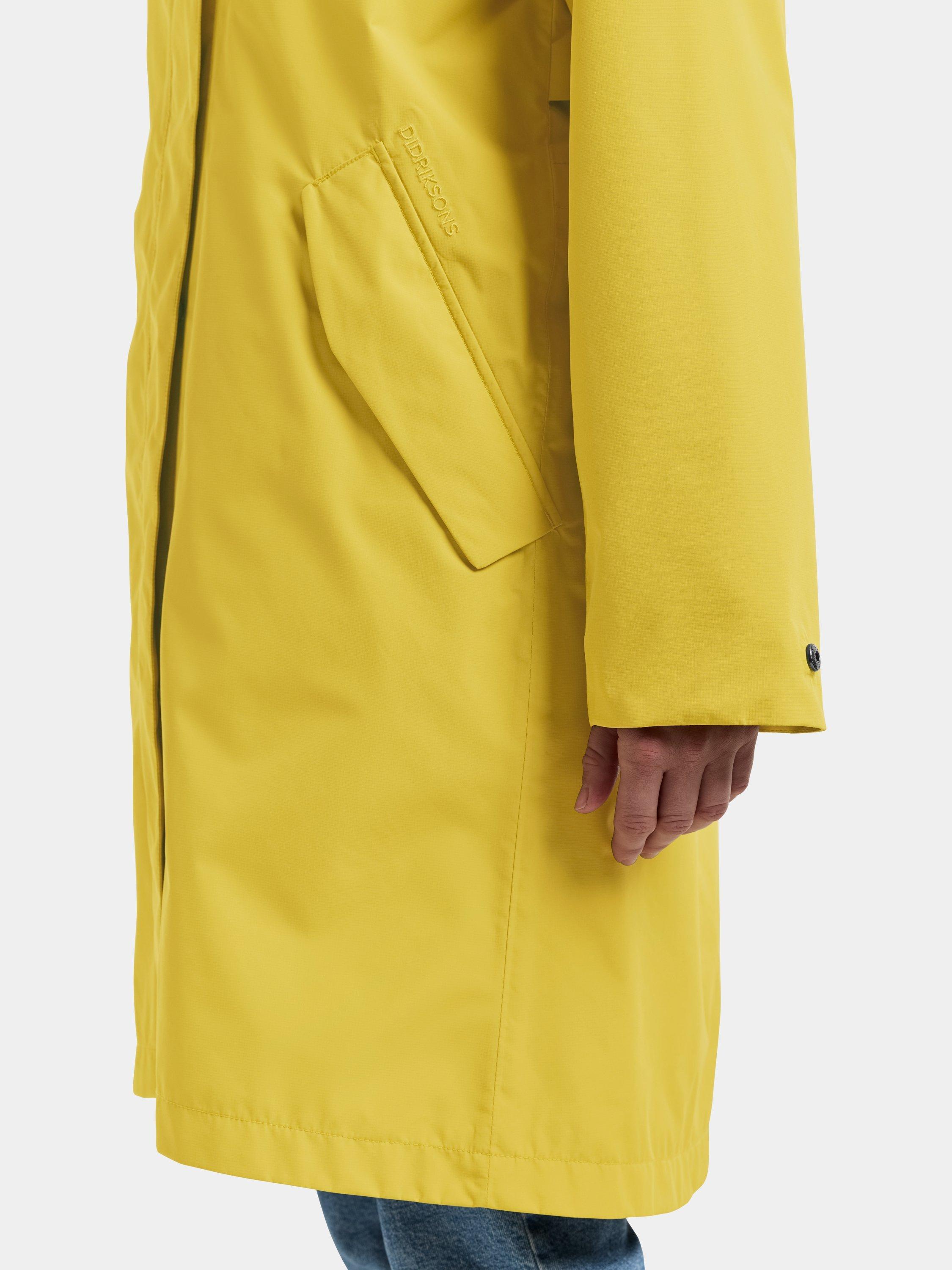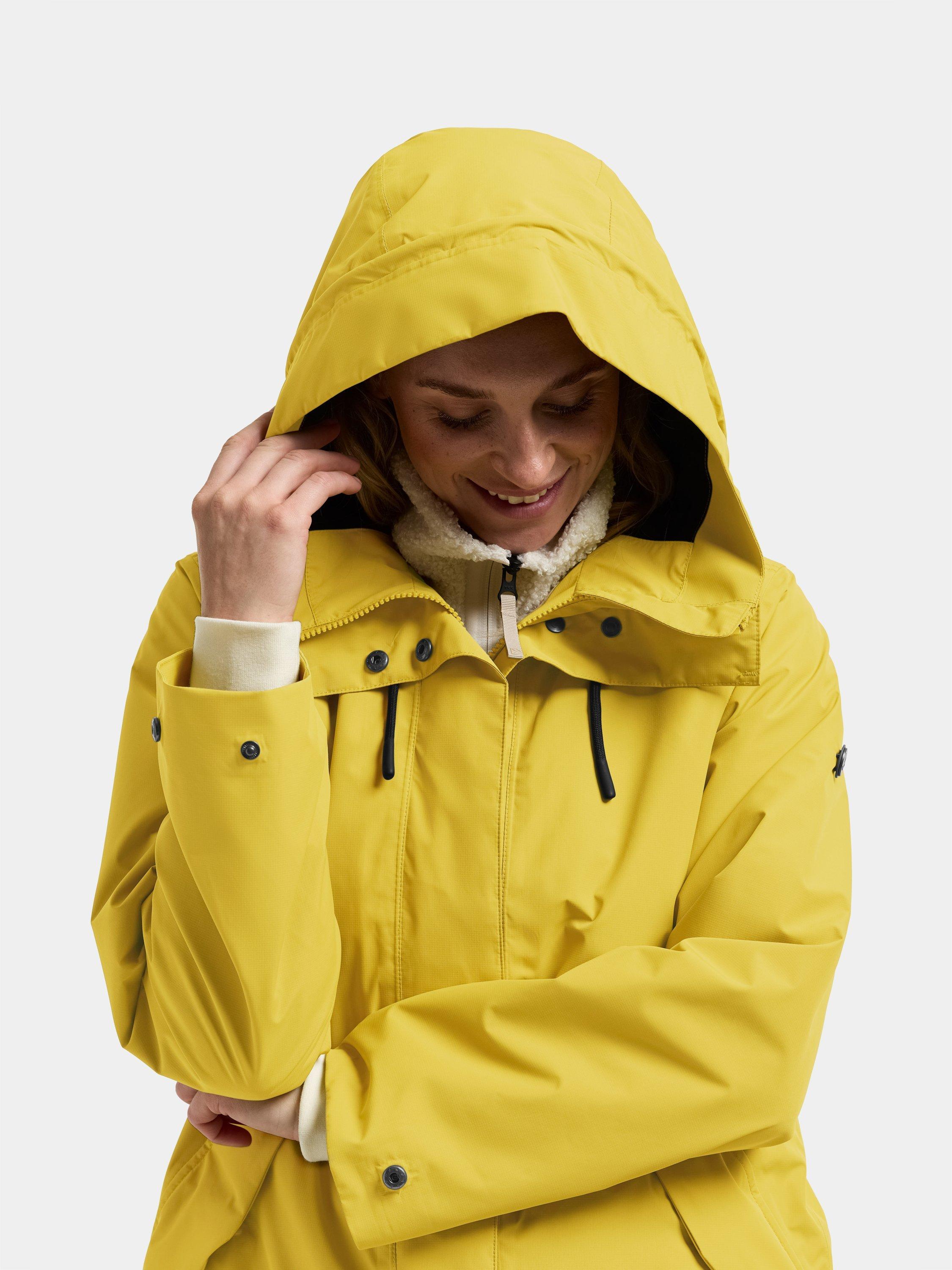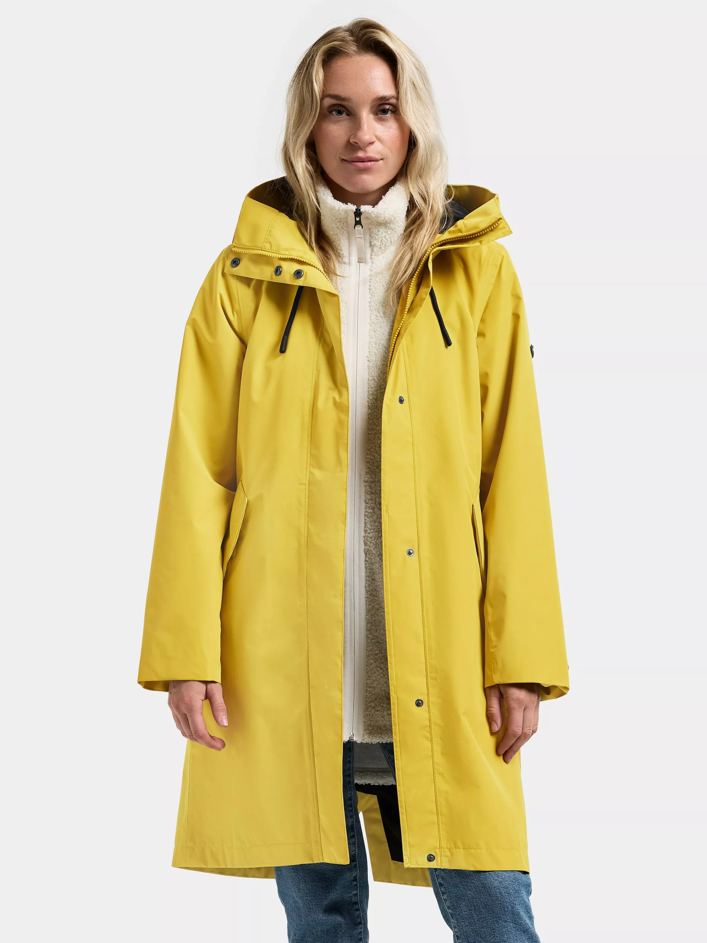 Elina is a waterproof everyday parka that combines style and function. It is designed to suit both urban environments and outdoor activities. The parka features an adjustable hood with a drawstring and a front zip protected by a buttoned placket. The waist can be adjusted from the inside with a drawstring for a personalised fit. The cuffs are easily adjusted with buttons, and the side pockets close with buttons for secure storage. The parka is water and windproof with taped seams and made from a breathable material.