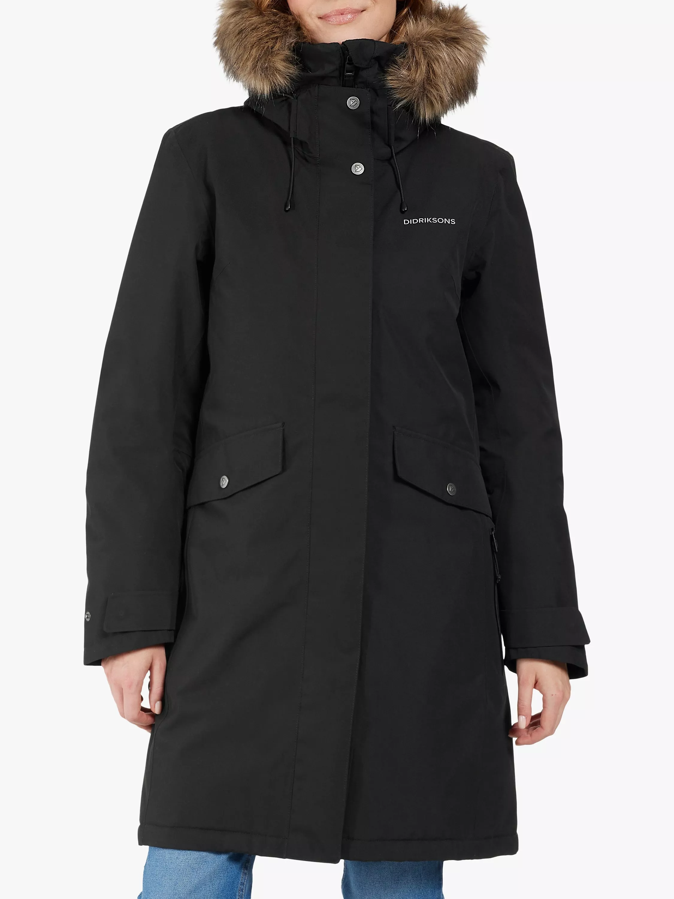 The Erika parka is one of Didriksons' most loved and classic parkas. It's windproof and waterproof with all seams taped, padded with 180g/m² of 100% recycled vegan padding, which makes it perfect for spending time outside during autumn and winter. The Erika parka has a 2-way zipper with a protective flap, an adjustable hood with detachable vegan fur, and a high collar to protect you against wind and rain. There are 4 pockets in the front and 2 on the inside of the parka. The hem, waist, cuffs, and hood can all be adjusted as needed. Reflective details include the Didriksons name and logo, and the zip pulls. PFC-free water-repellent finish.