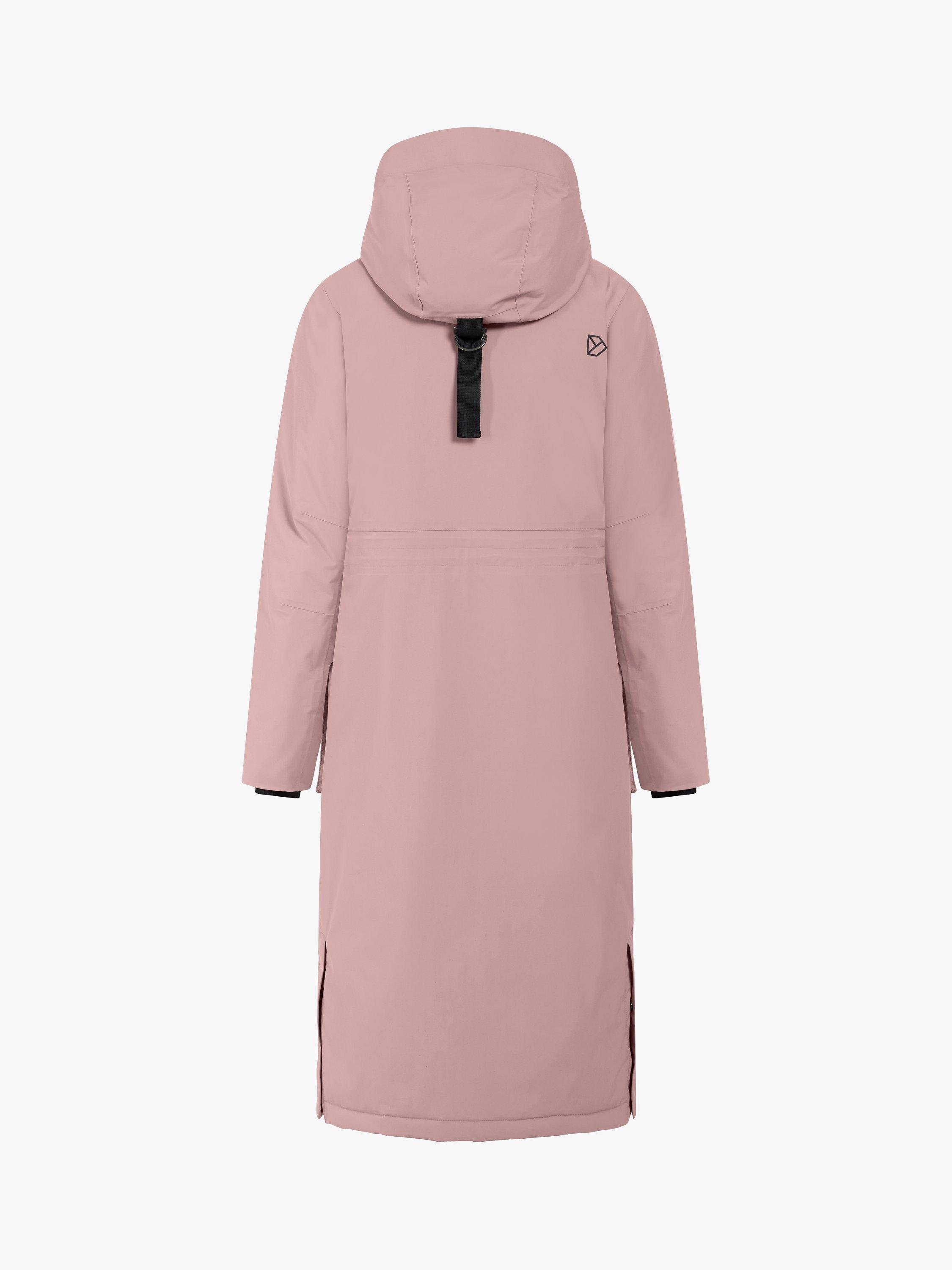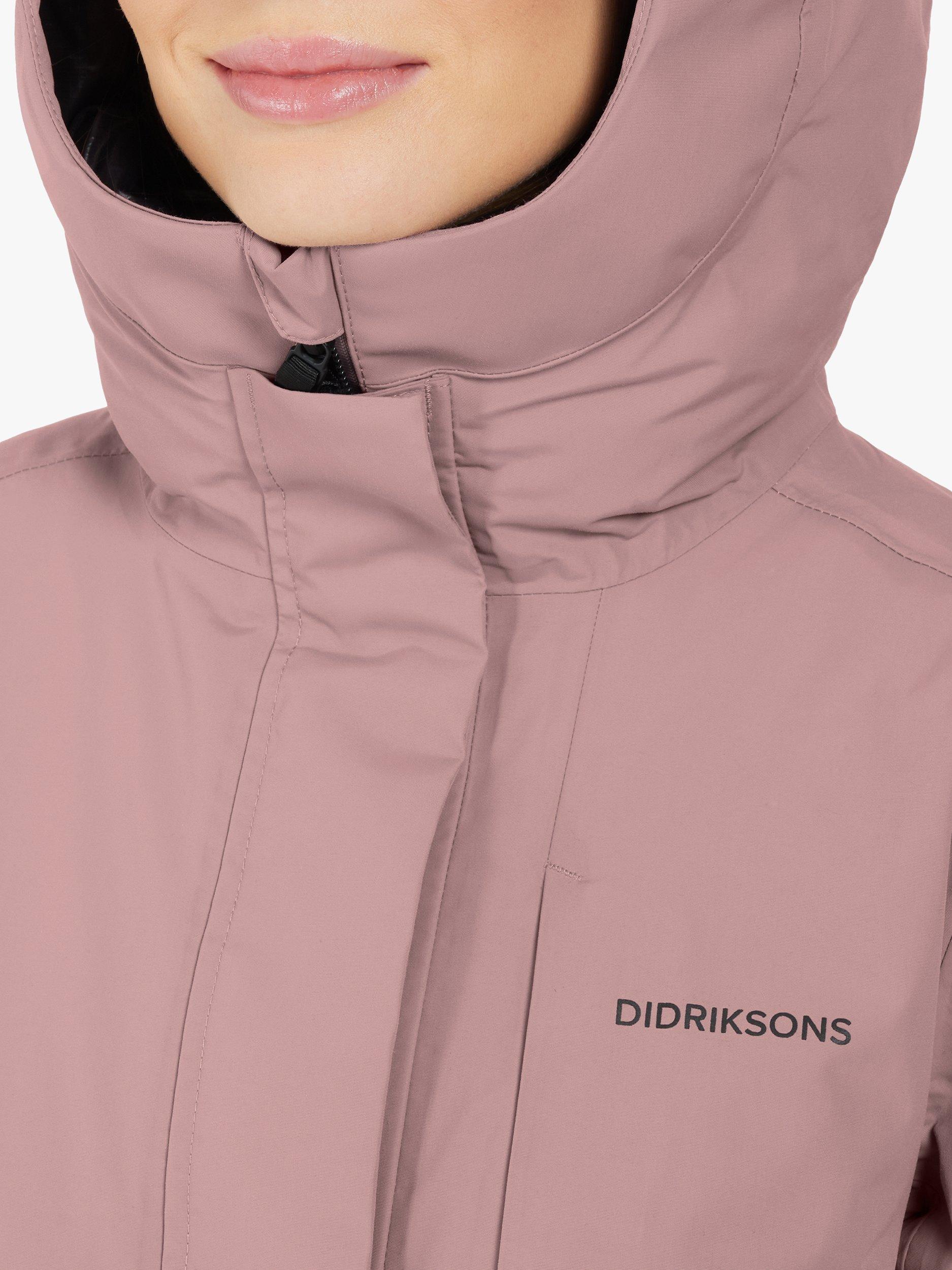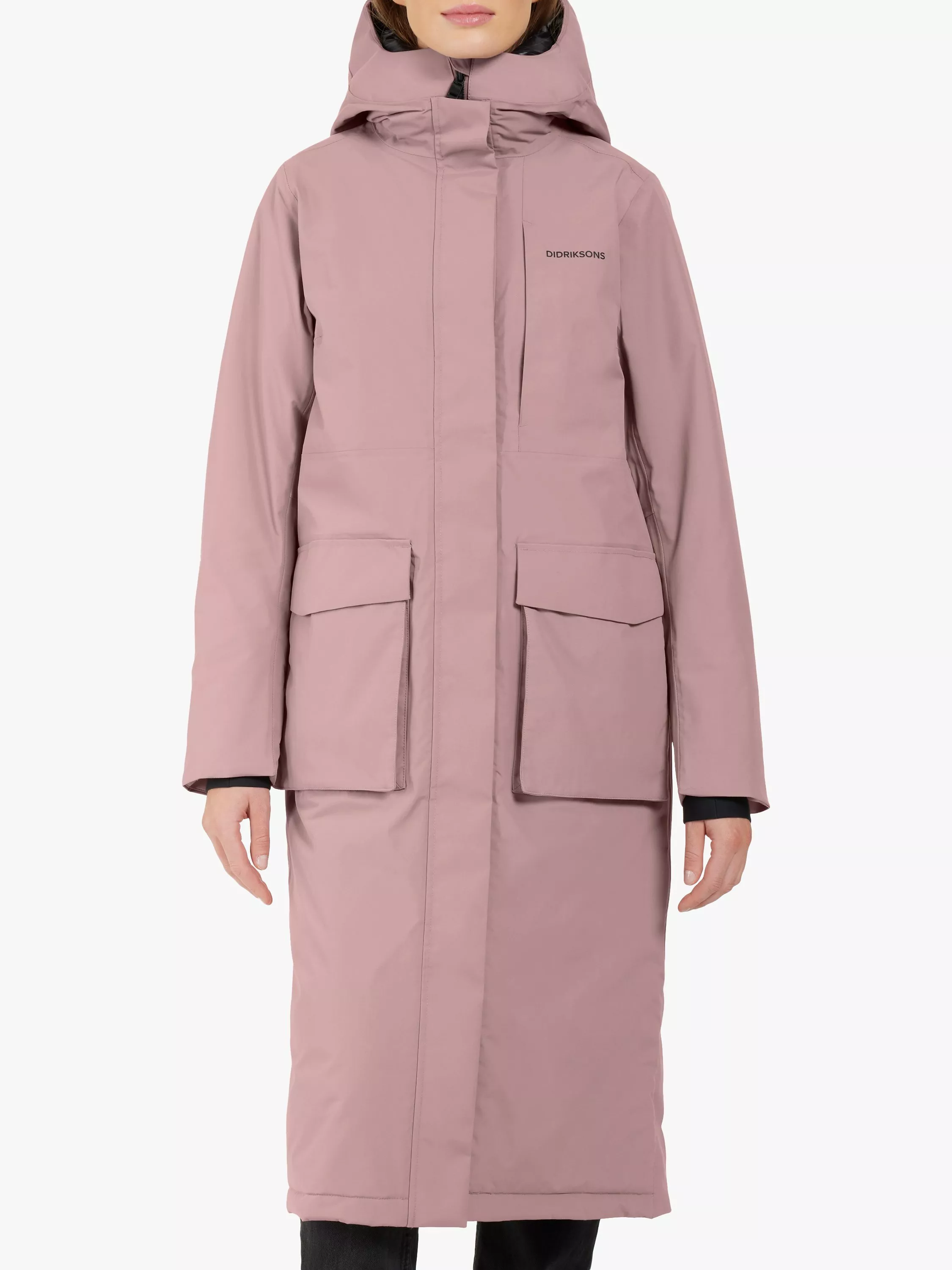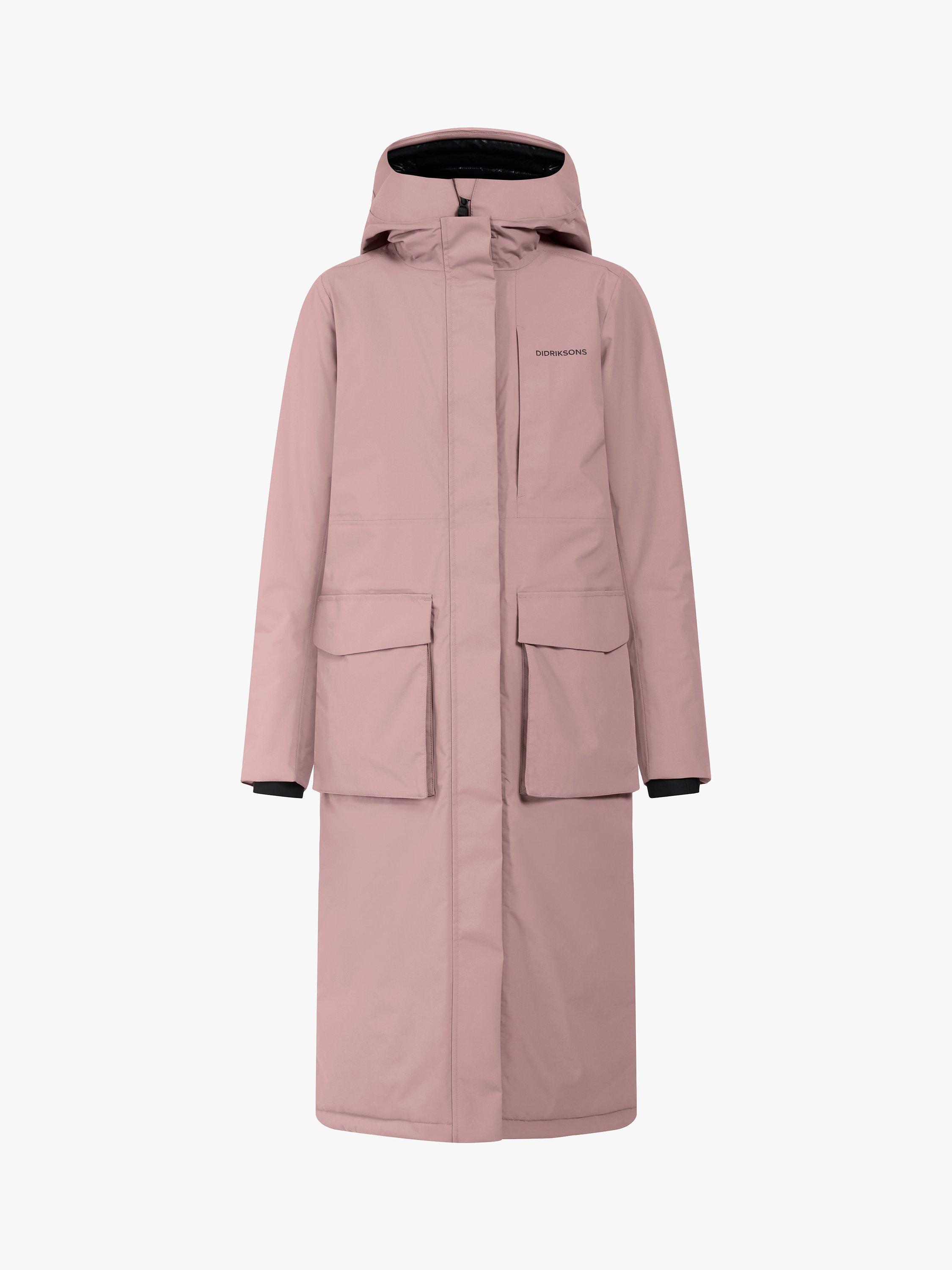 The Leya long parka has become a classic Didriksons parka. It's windproof and waterproof with all seams taped, padded with 180g/m² of 100% recycled vegan padding. The inside has warming padded panels for extra warmth and comfort and the padded collar is bringing that extra comfort and stylish detail. Leya long parka has a slit on both sides with buttons for extra movability and functionality, a 2-way zipper at the front with a protective flap, an fixed and adjustable hood and a high collar to protect you against wind and rain. 2 pockets in the front closes with buttons, and 1 pocket with zipper on chest and another one the inside of the parka. Adjustable waist and elastic cuffs provides extra comfort. PFC-free water-repellent finish.