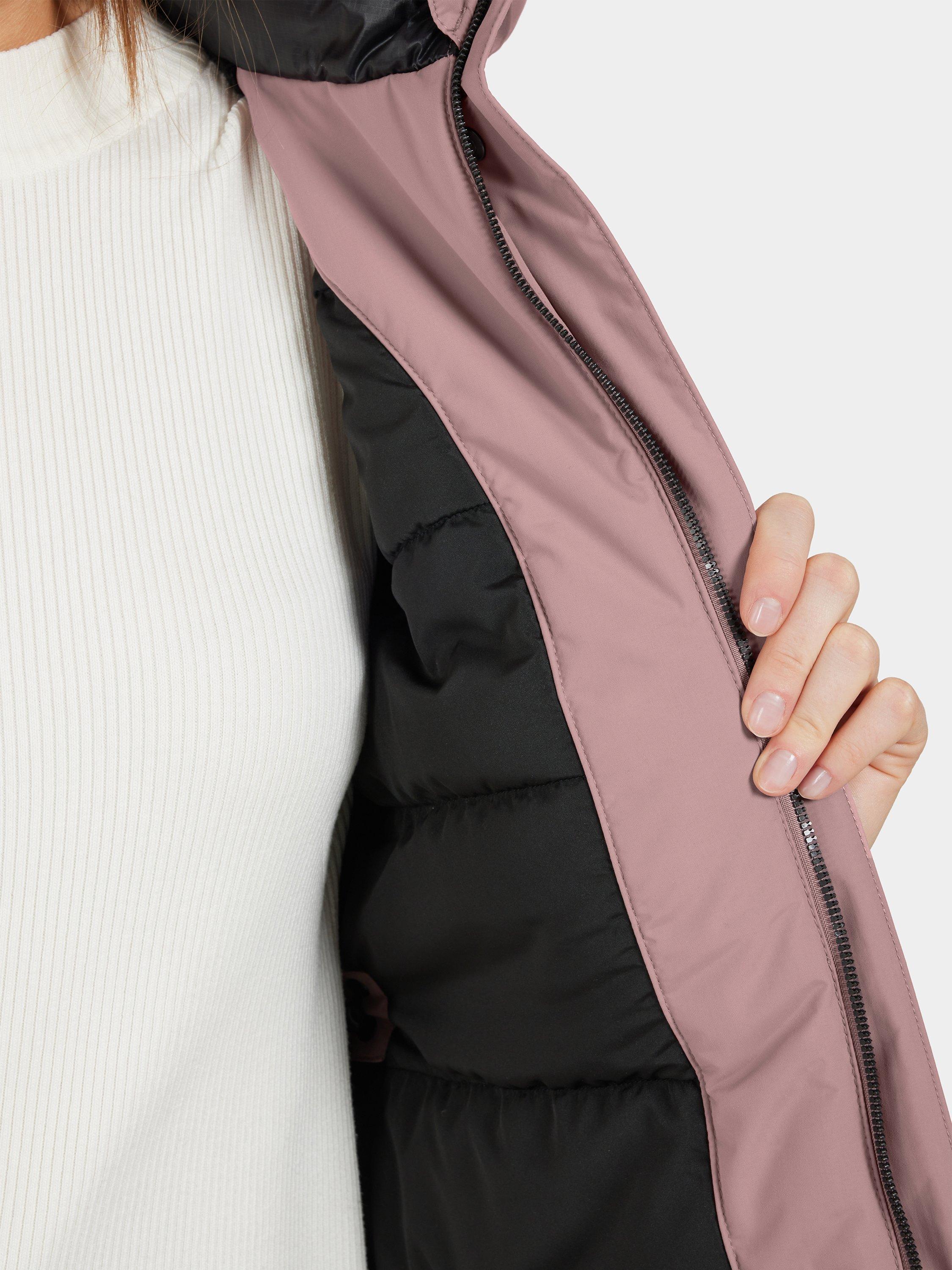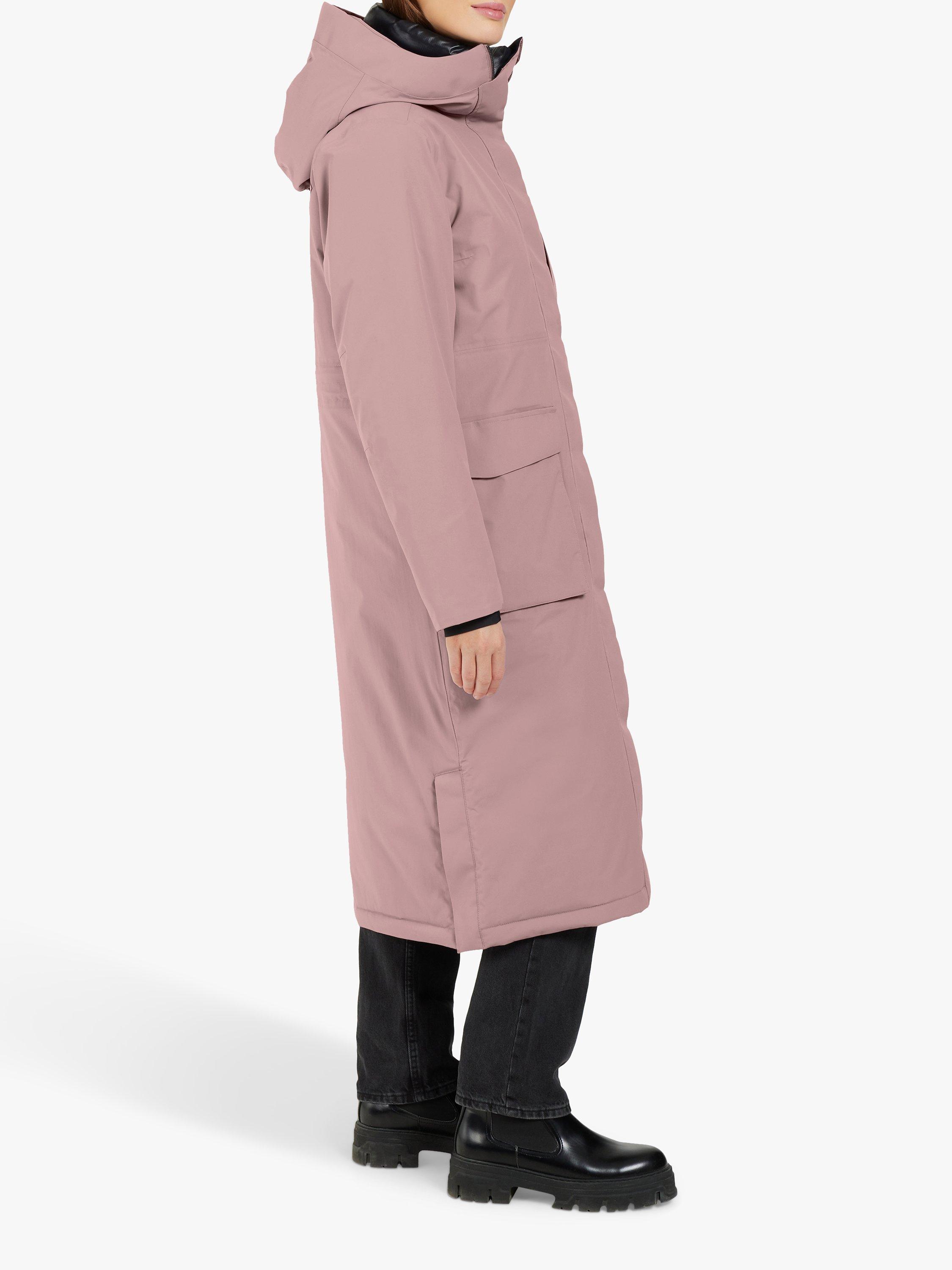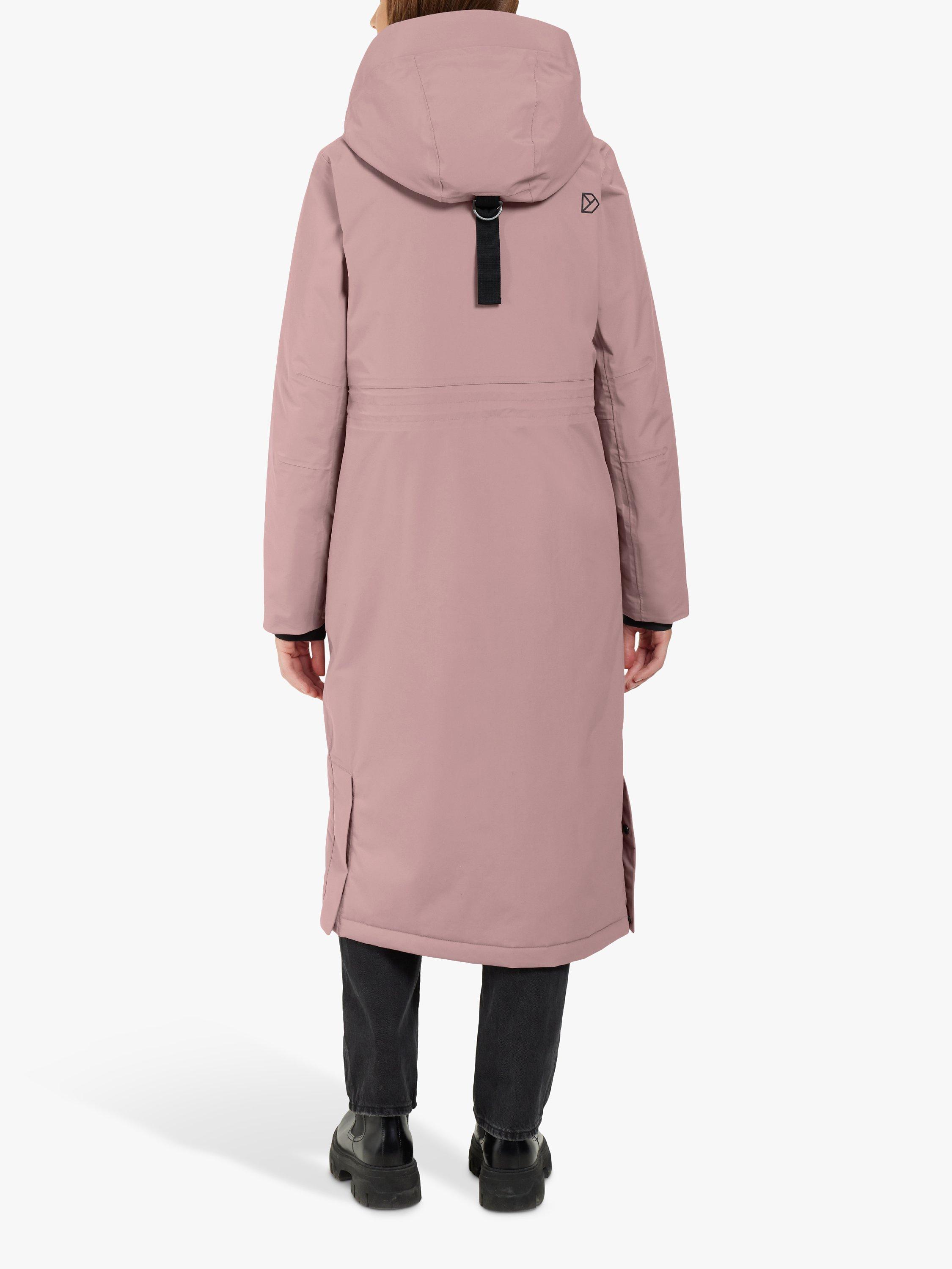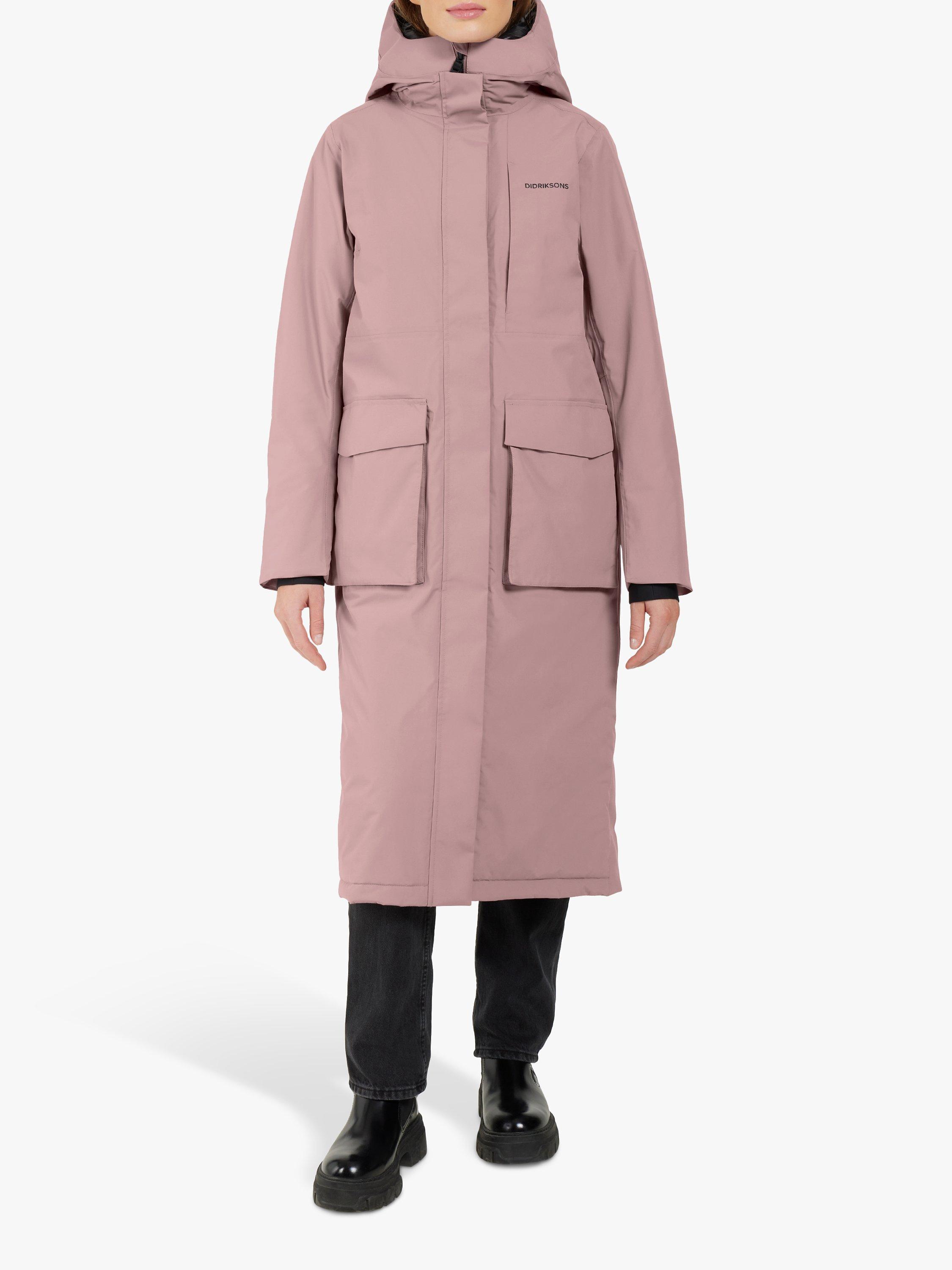 The Leya long parka has become a classic Didriksons parka. It's windproof and waterproof with all seams taped, padded with 180g/m² of 100% recycled vegan padding. The inside has warming padded panels for extra warmth and comfort and the padded collar is bringing that extra comfort and stylish detail. Leya long parka has a slit on both sides with buttons for extra movability and functionality, a 2-way zipper at the front with a protective flap, an fixed and adjustable hood and a high collar to protect you against wind and rain. 2 pockets in the front closes with buttons, and 1 pocket with zipper on chest and another one the inside of the parka. Adjustable waist and elastic cuffs provides extra comfort. PFC-free water-repellent finish.