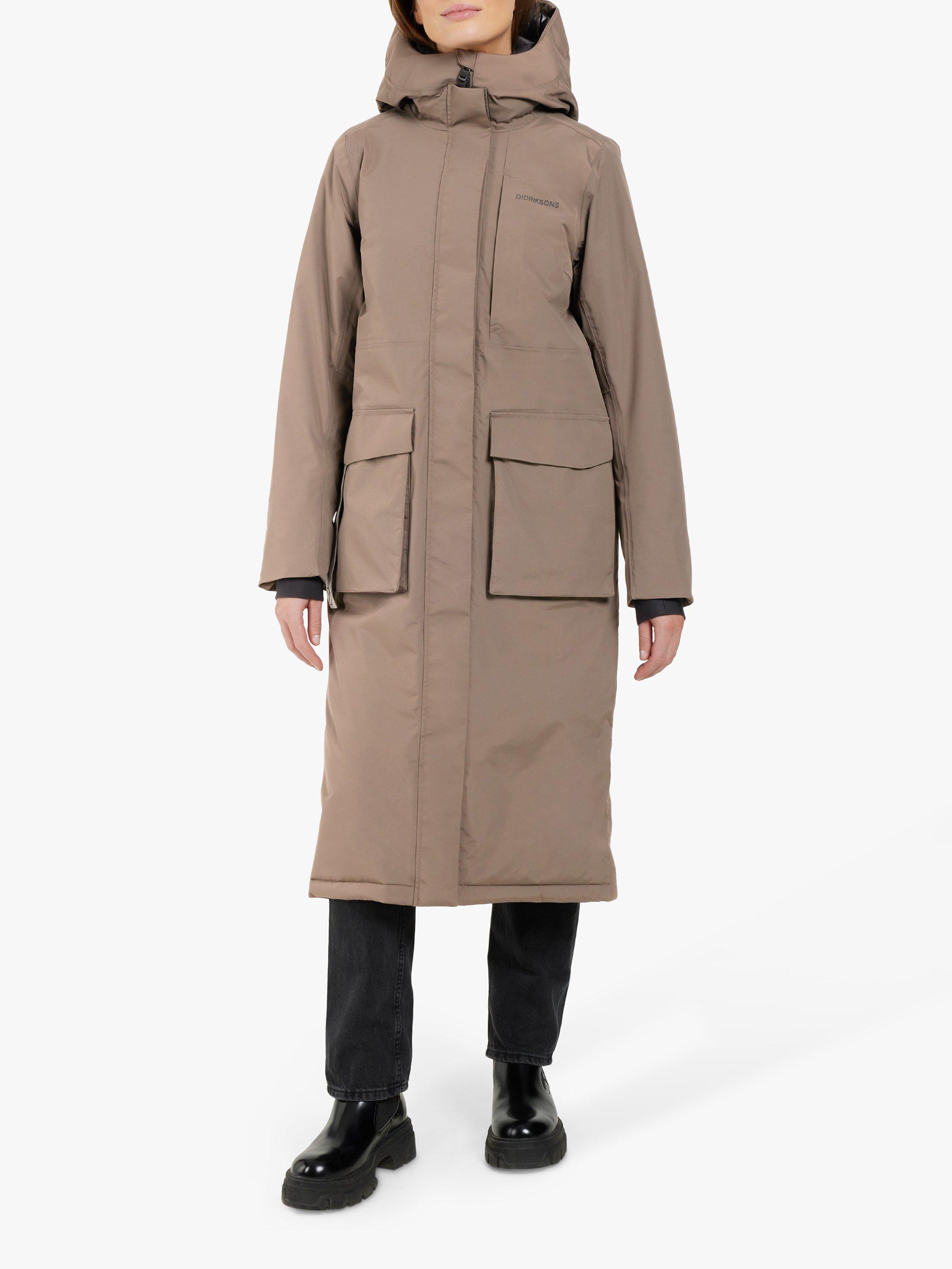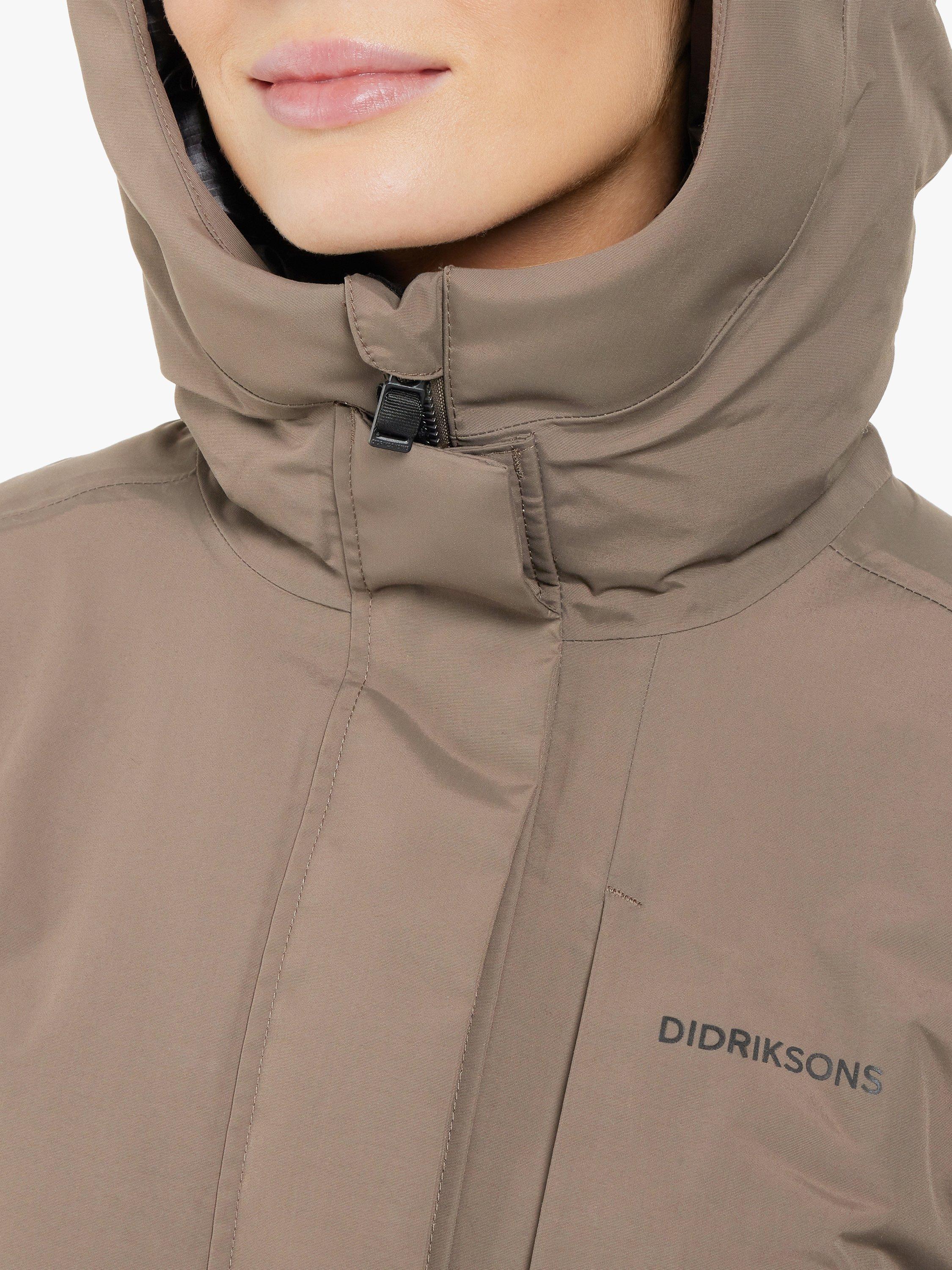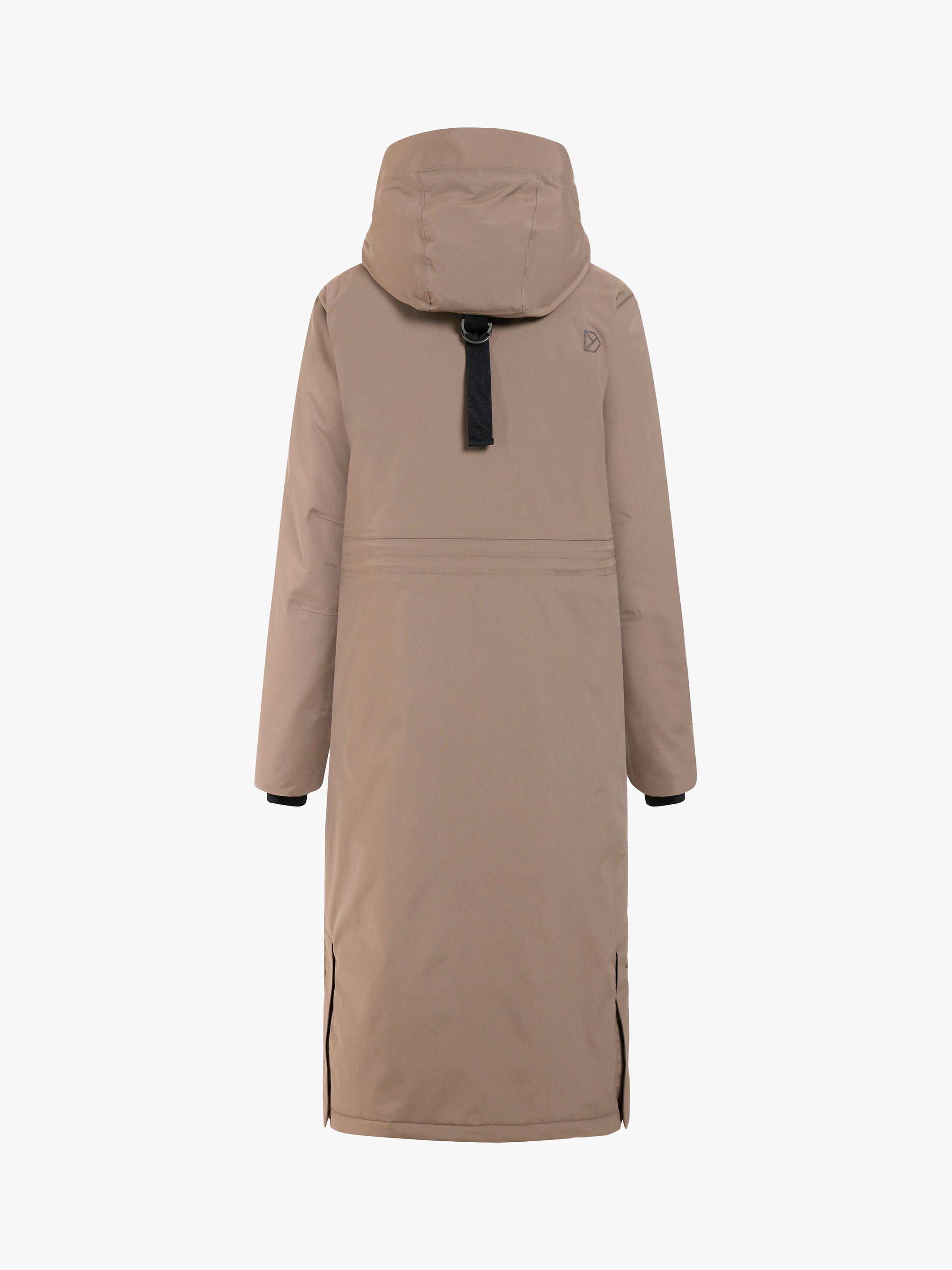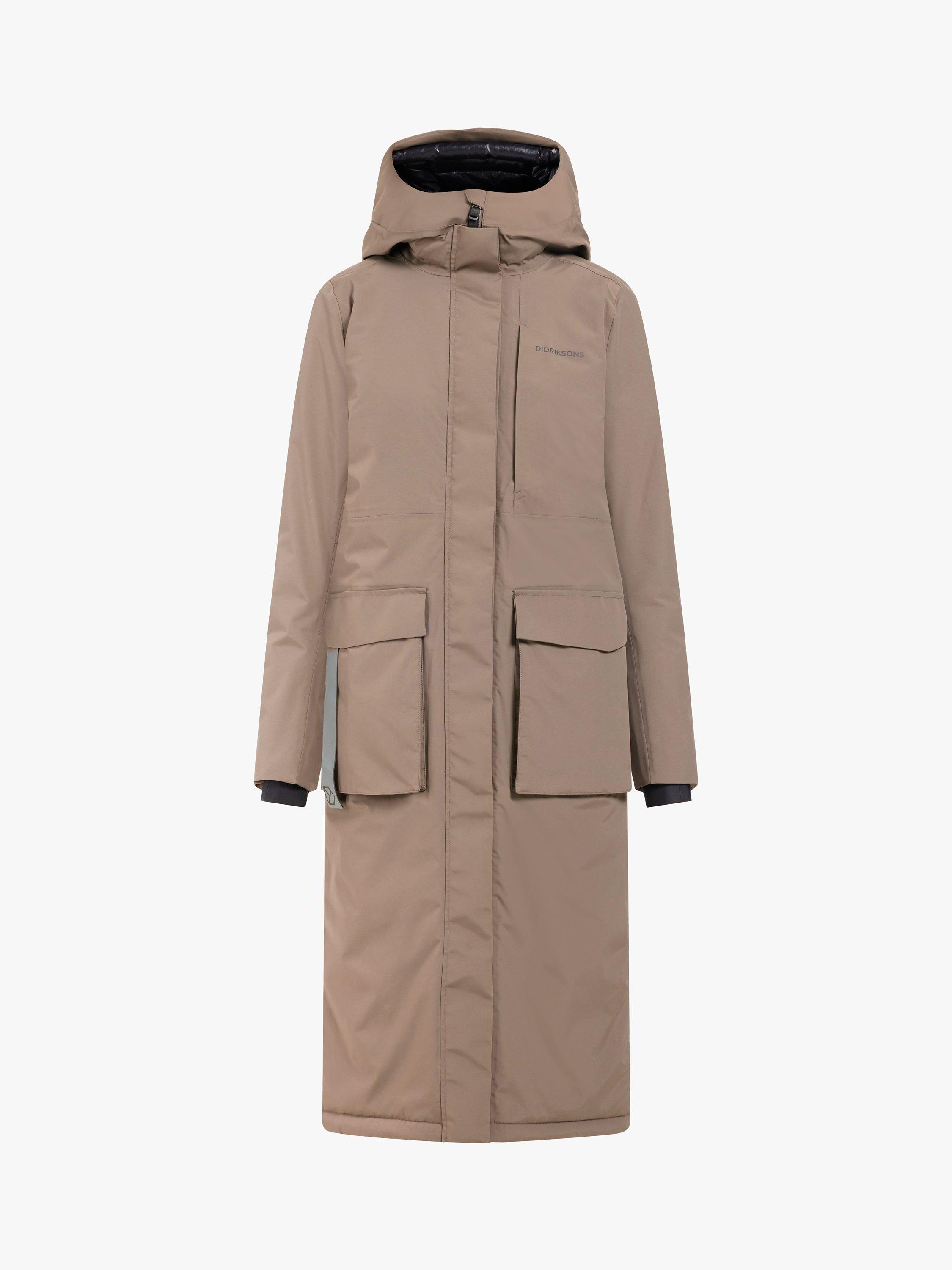 The Leya long parka has become a classic Didriksons parka. It's windproof and waterproof with all seams taped, padded with 180g/m² of 100% recycled vegan padding. The inside has warming padded panels for extra warmth and comfort and the padded collar is bringing that extra comfort and stylish detail. Leya long parka has a slit on both sides with buttons for extra movability and functionality, a 2-way zipper at the front with a protective flap, an fixed and adjustable hood and a high collar to protect you against wind and rain. 2 pockets in the front closes with buttons, and 1 pocket with zipper on chest and another one the inside of the parka. Adjustable waist and elastic cuffs provides extra comfort. PFC-free water-repellent finish.