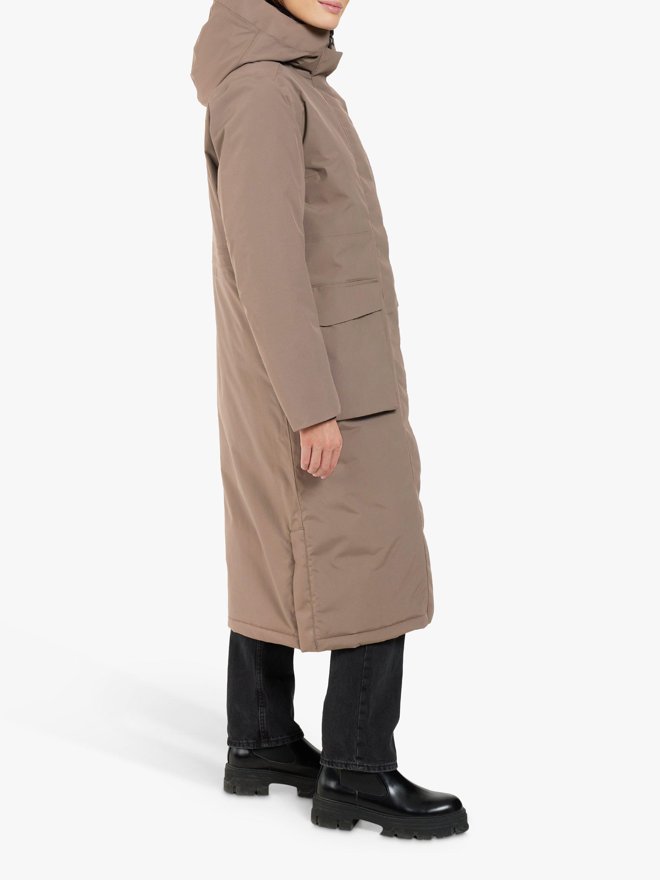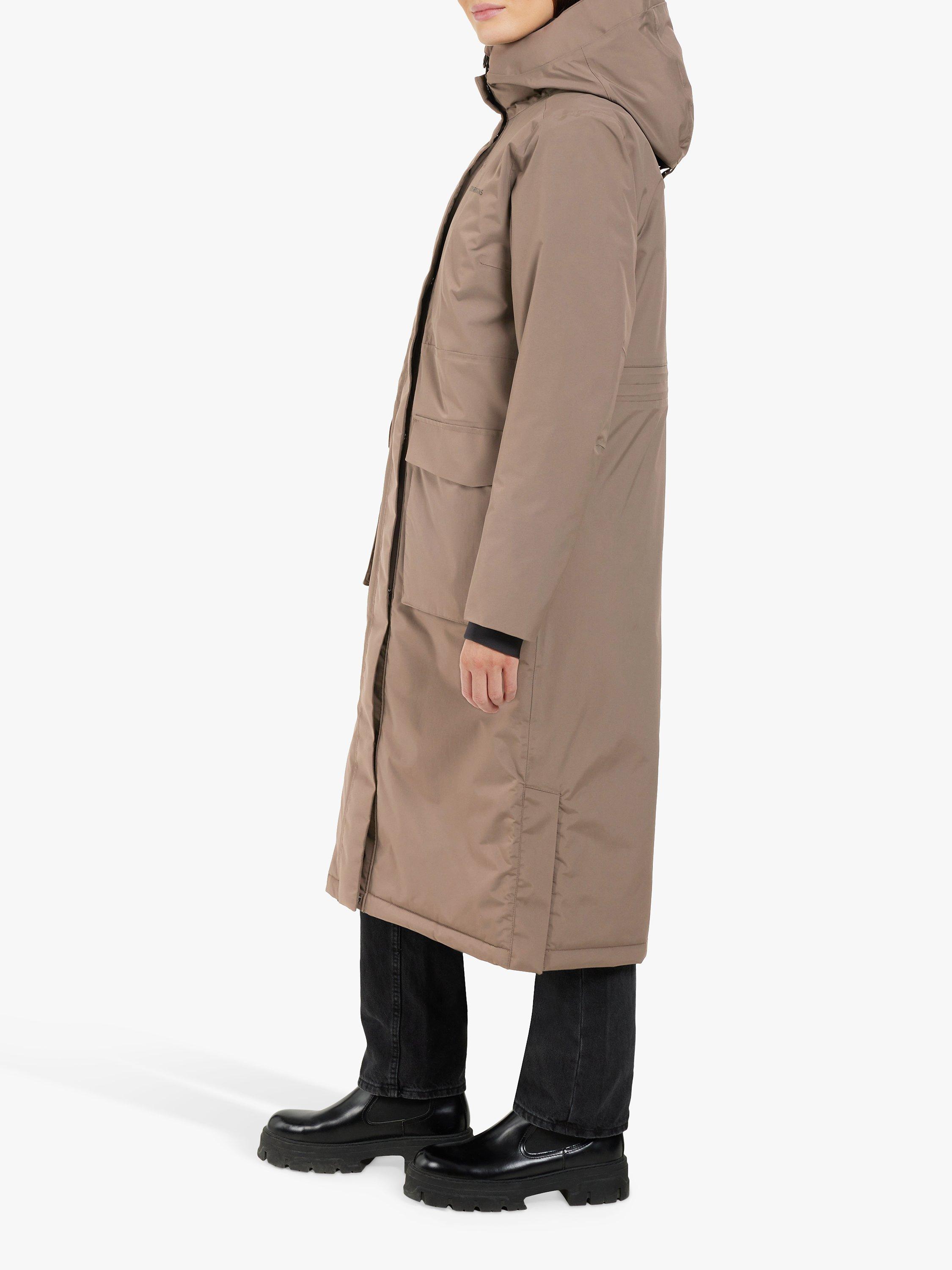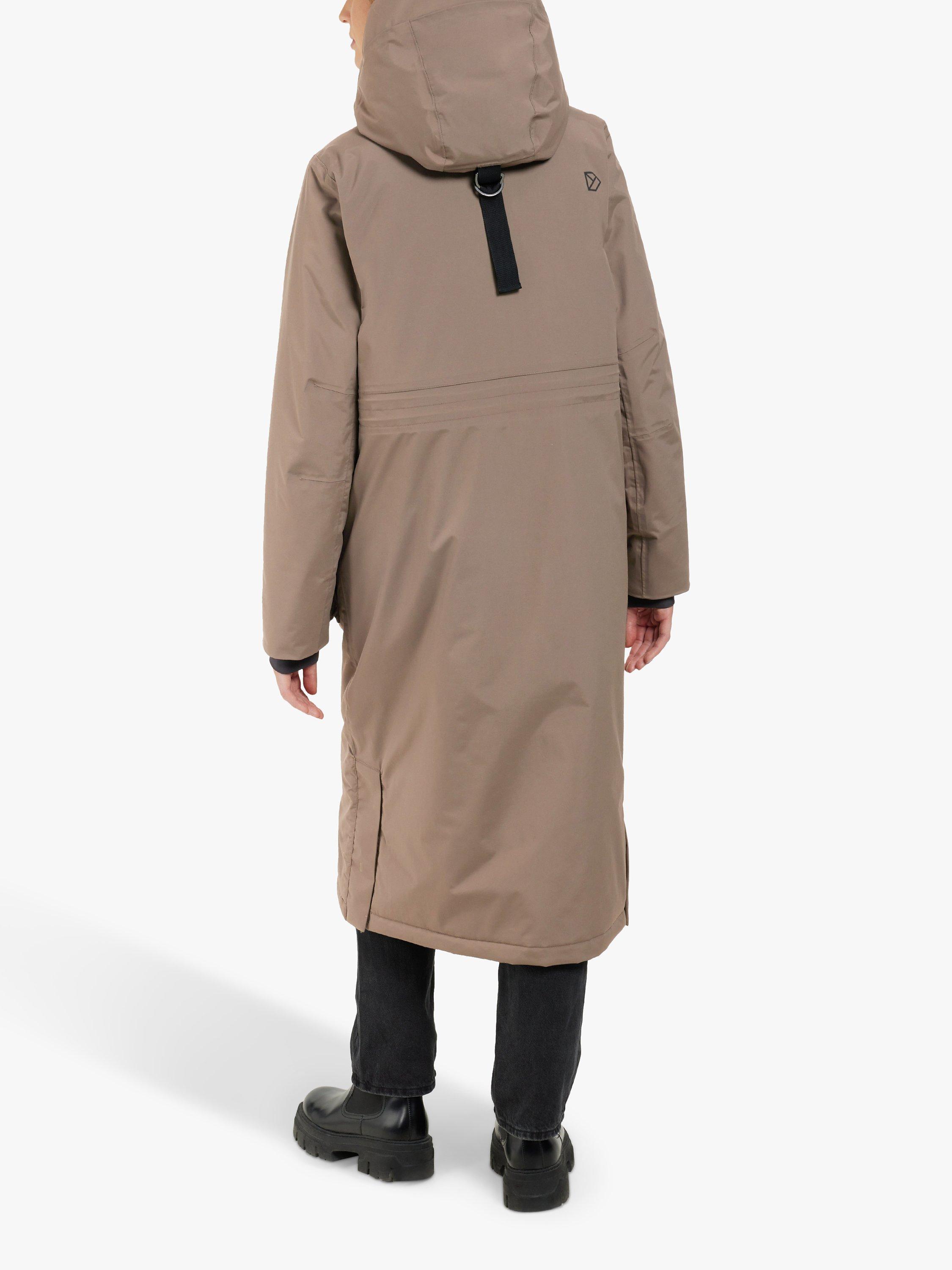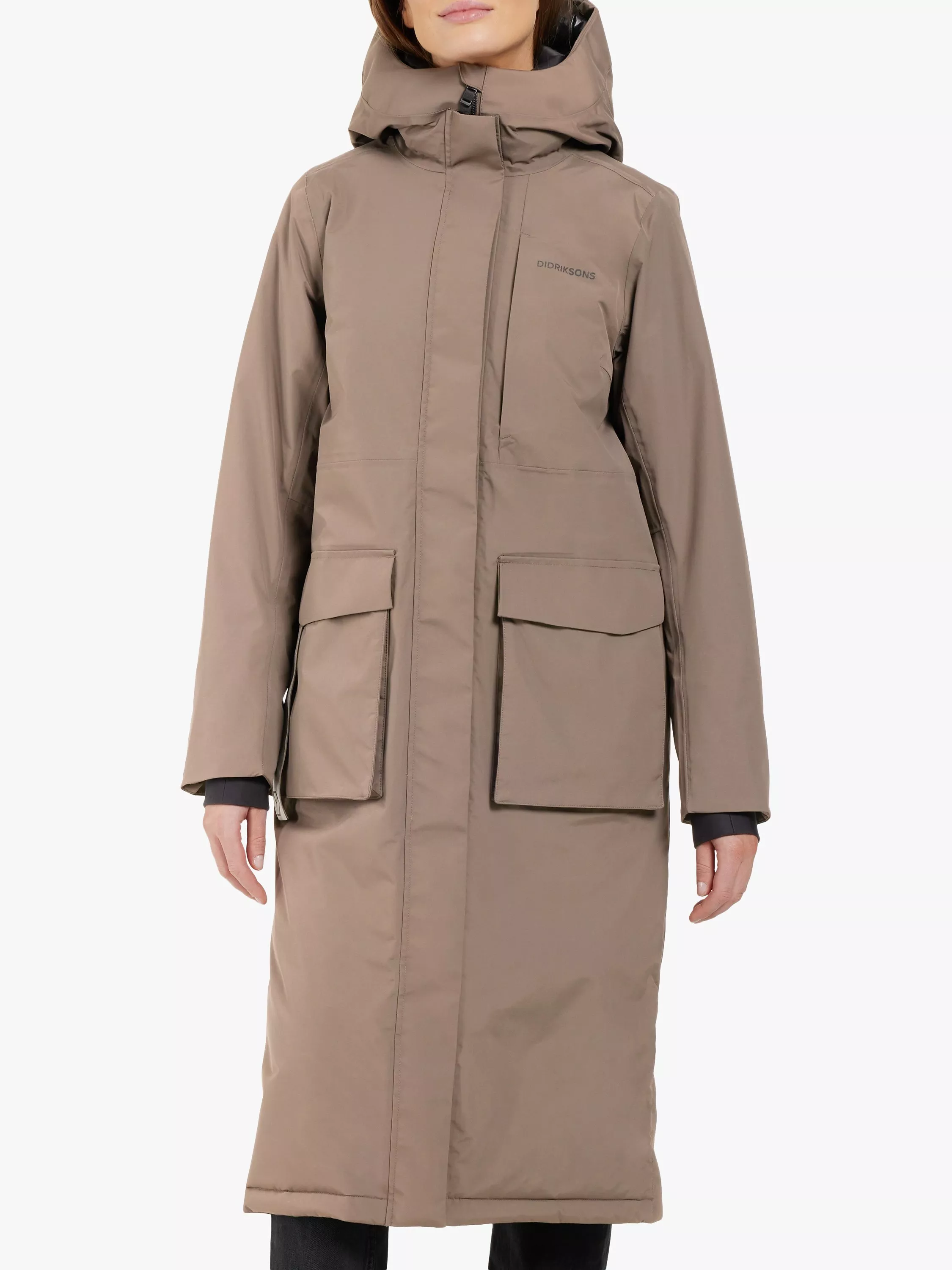 The Leya long parka has become a classic Didriksons parka. It's windproof and waterproof with all seams taped, padded with 180g/m² of 100% recycled vegan padding. The inside has warming padded panels for extra warmth and comfort and the padded collar is bringing that extra comfort and stylish detail. Leya long parka has a slit on both sides with buttons for extra movability and functionality, a 2-way zipper at the front with a protective flap, an fixed and adjustable hood and a high collar to protect you against wind and rain. 2 pockets in the front closes with buttons, and 1 pocket with zipper on chest and another one the inside of the parka. Adjustable waist and elastic cuffs provides extra comfort. PFC-free water-repellent finish.