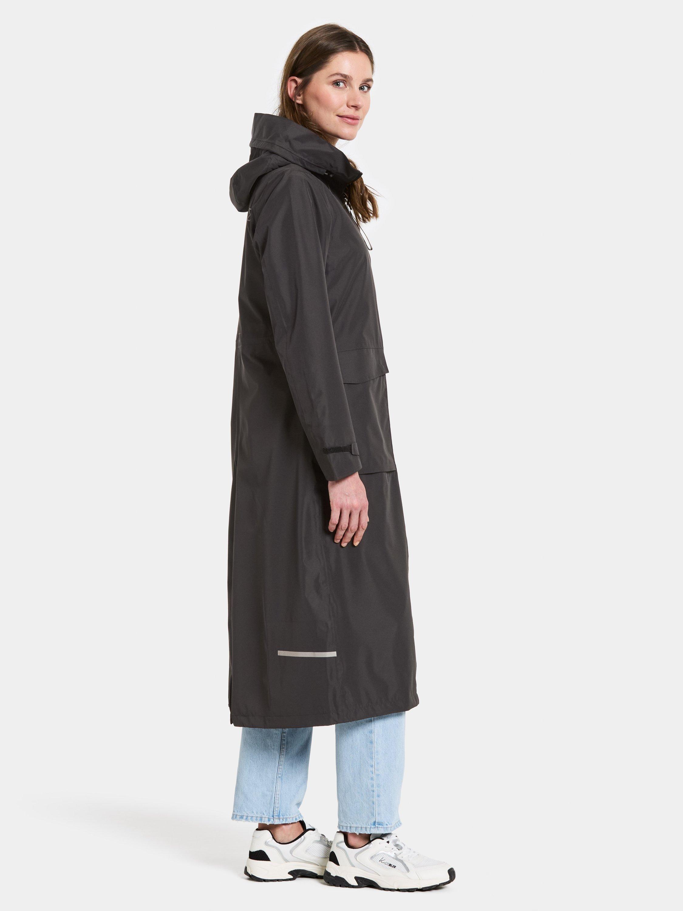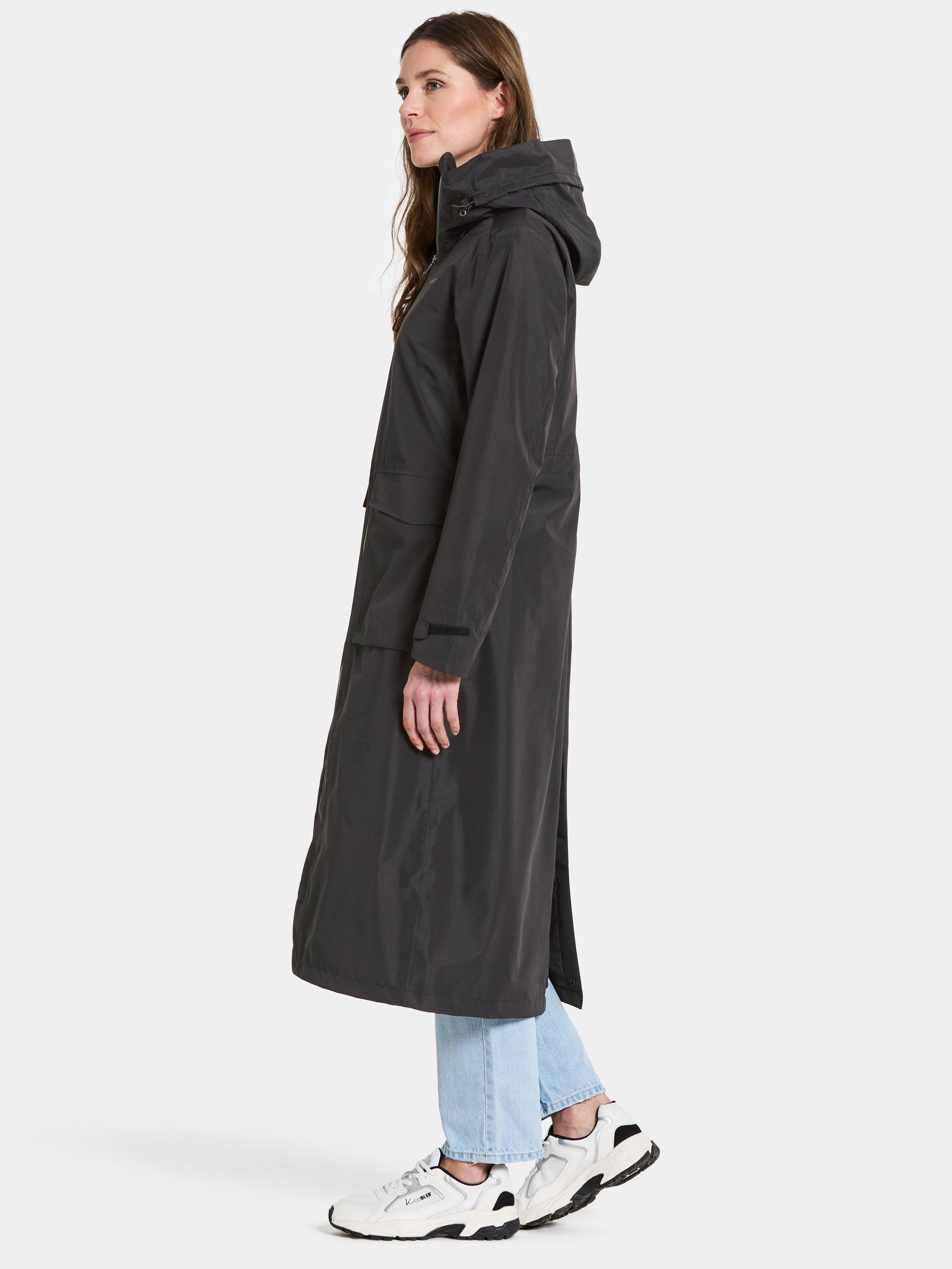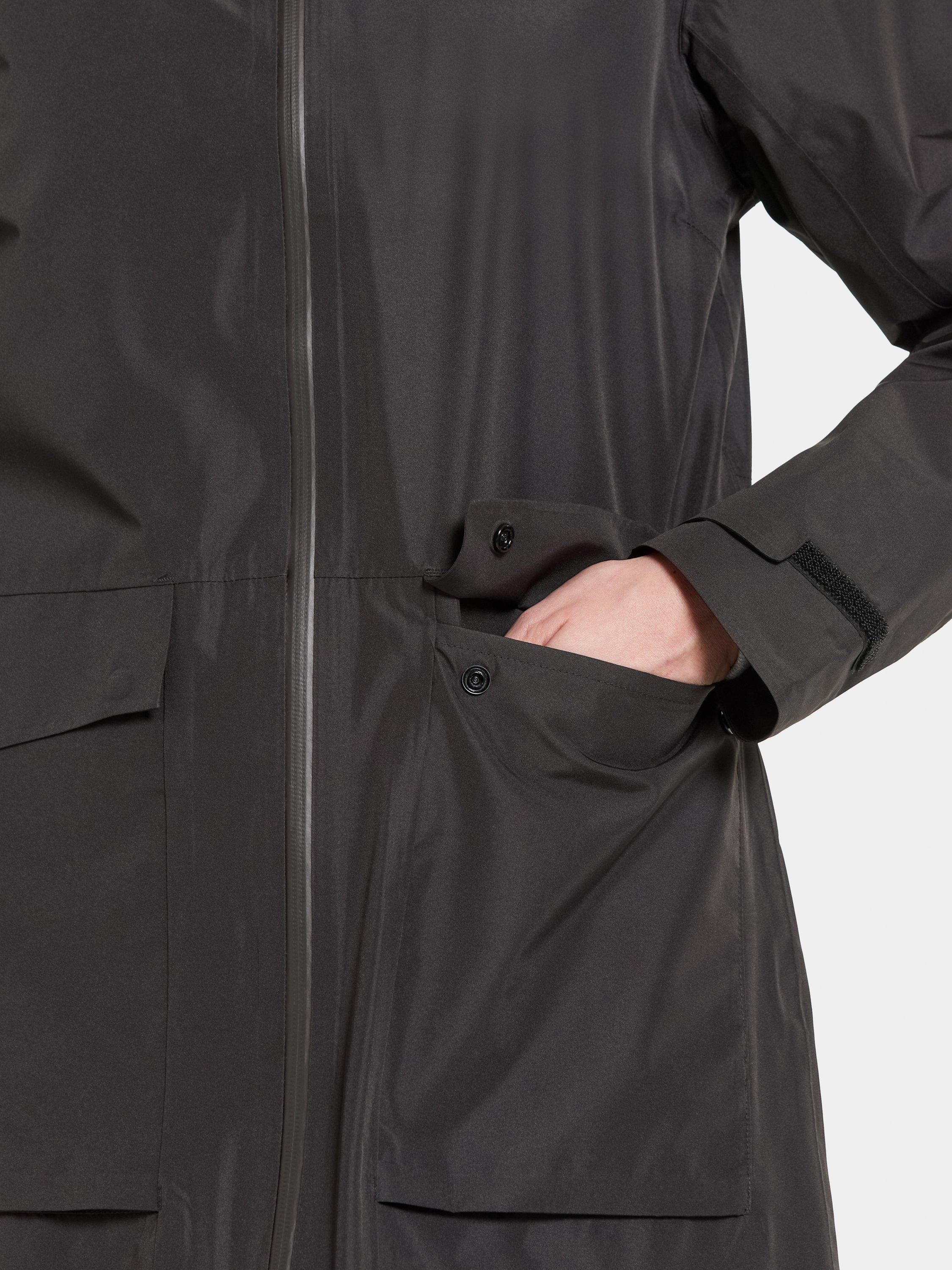Nadja is a long and protective parka. It is lightweight and has a straight fit, making it comfortable to wear in all weather conditions. The parka is water- and windproof with taped seams and made from a breathable material. It has a two-way front zip and a button placket for extra ventilation. The fixed hood is adjustable in two directions. The cuffs can be adjusted with hook-and-loop fasteners for a perfect fit, and the waist can be adjusted at the back. The parka has practical pockets, including an inner pocket and front pockets with buttons. The water-repellent finish is PFC-free.