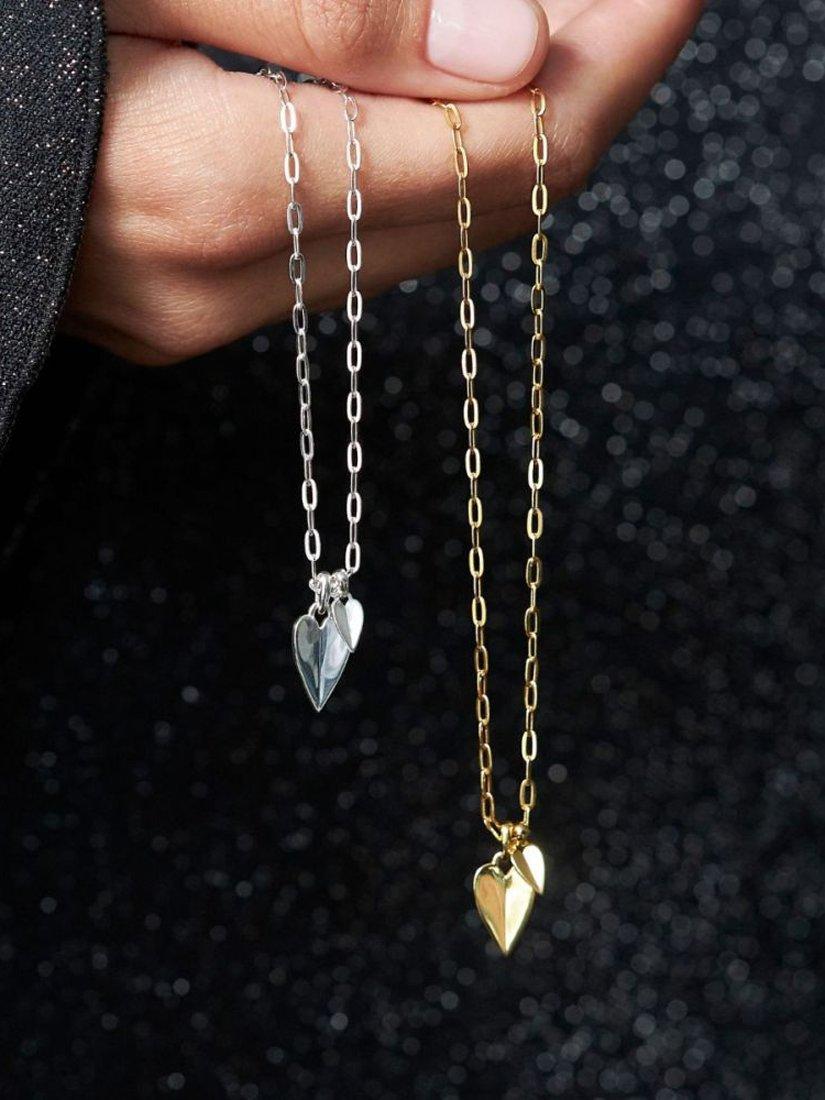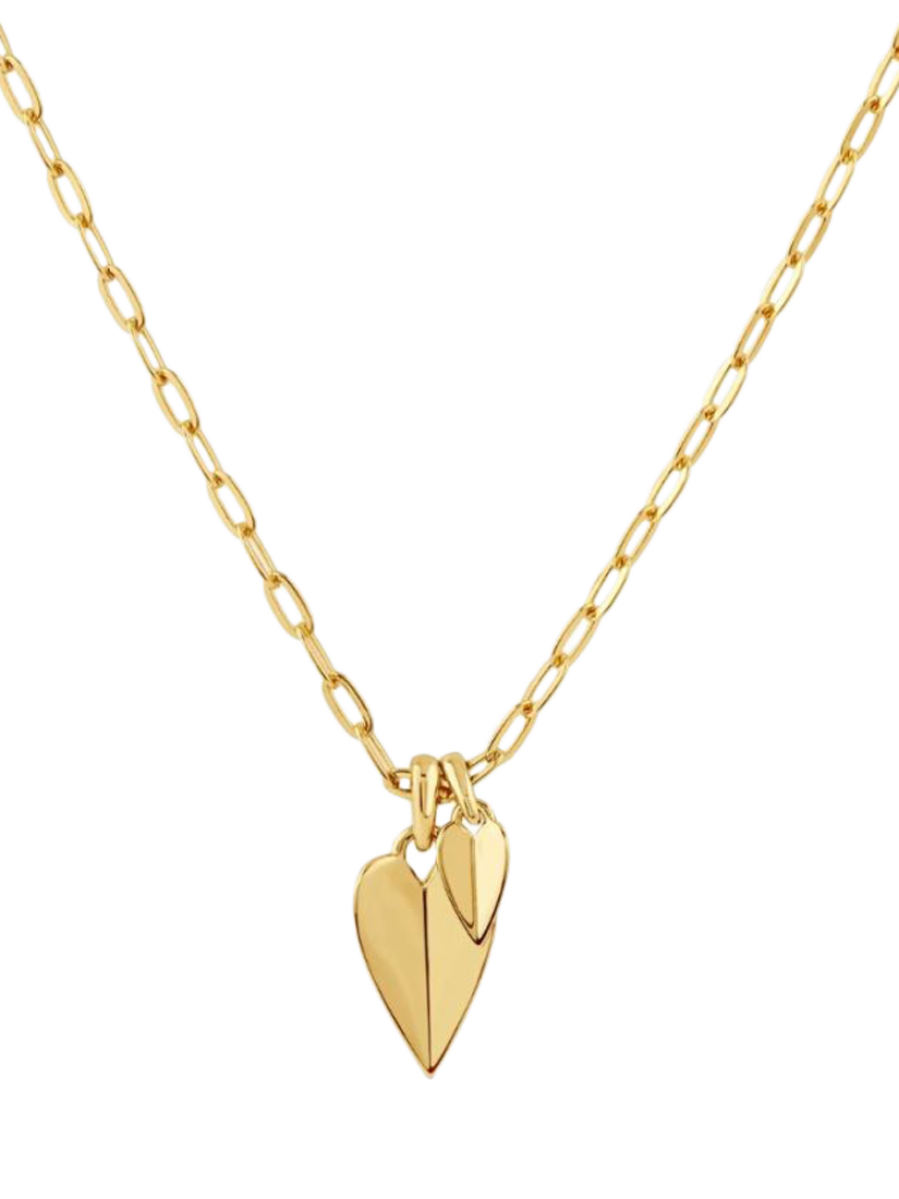 From Dinny Hall, this Folded Heart Duo charm pendant features two stunning heart charms. Suspended on a light-catching hammered chain, this pendant is perfect for layering.