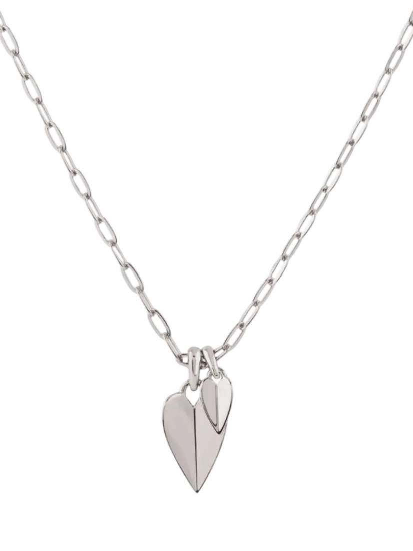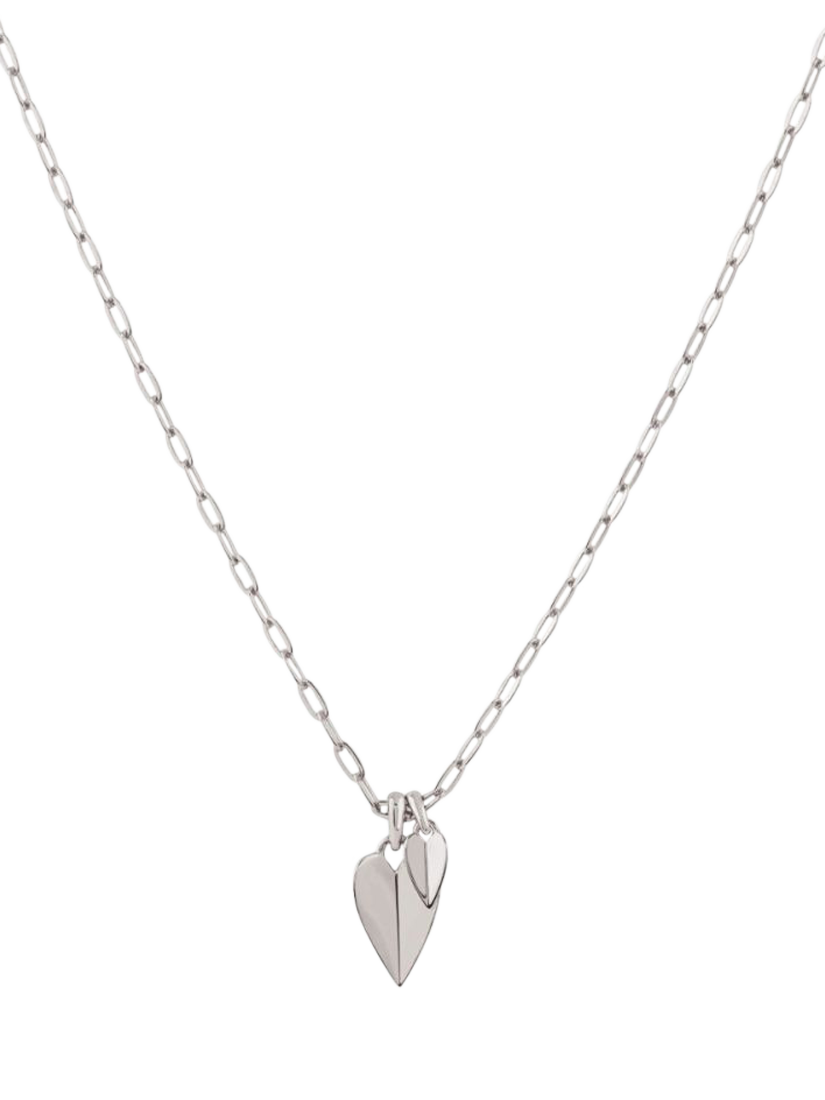 From Dinny Hall, this Folded Heart Duo charm pendant features two stunning heart charms. Suspended on a light-catching hammered chain, this pendant is perfect for layering.