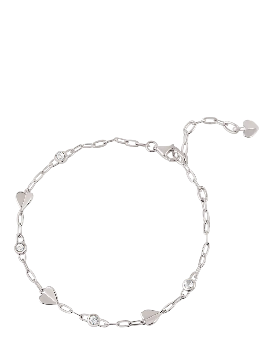 This heart bracelet from Dinny Hall is made of recycled sterling silver and features three heart charms and four round Swiss blue topaz gemstones.