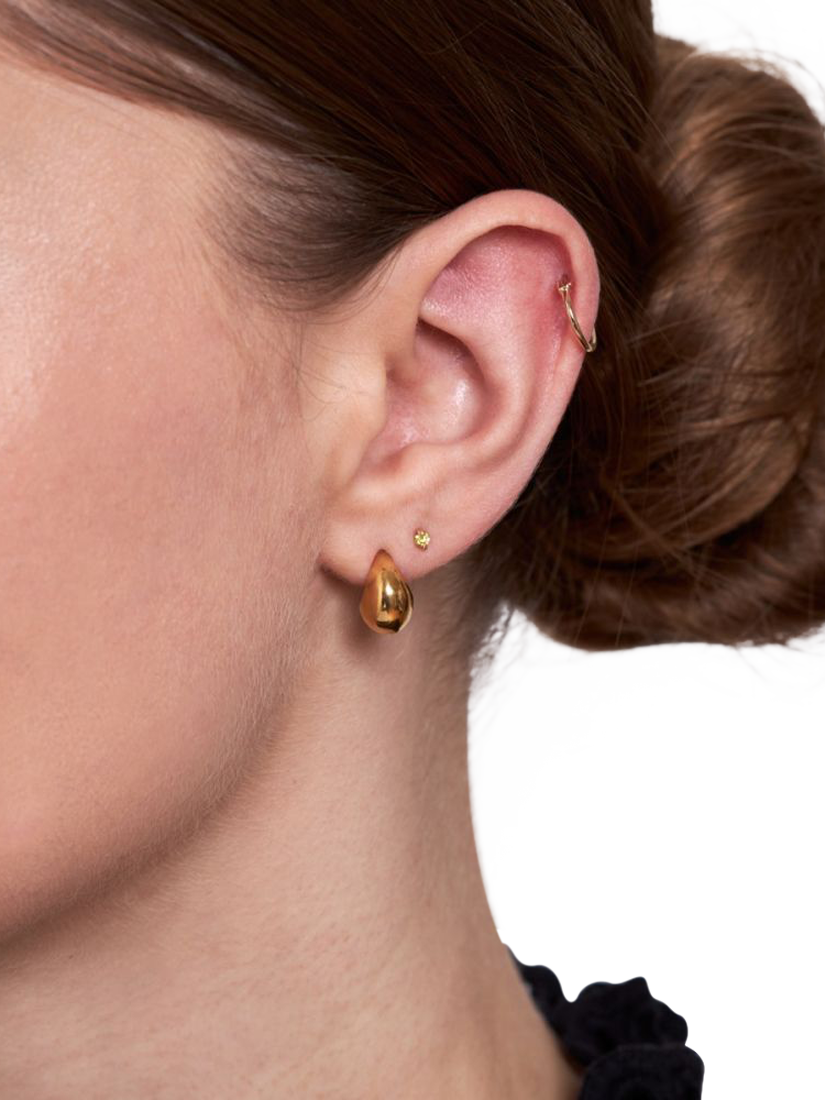Hand-carved in wax, where the centre is scooped out to create a three-dimensional and perfectly balanced shape, These mini hoops are cast in recycled 22k yellow gold vermeil.