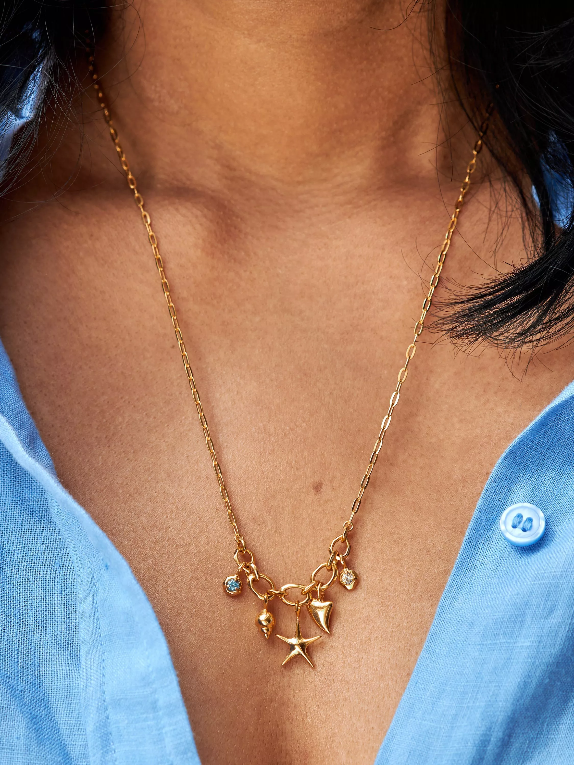 Handcrafted charm necklace including all five Thalassa Ocean Treasures charms. The starfish, shark's tooth, mini shell and brilliant cut white sapphire and blue topaz evoke a look and feel of unearthed hidden treasure.