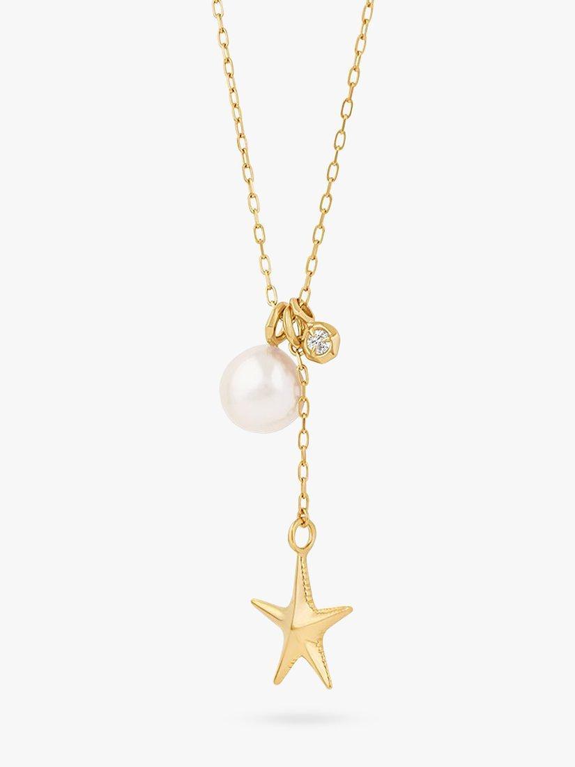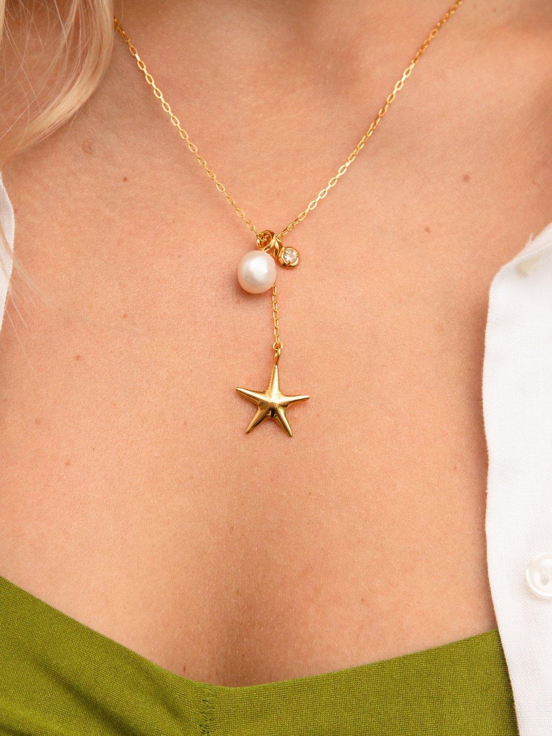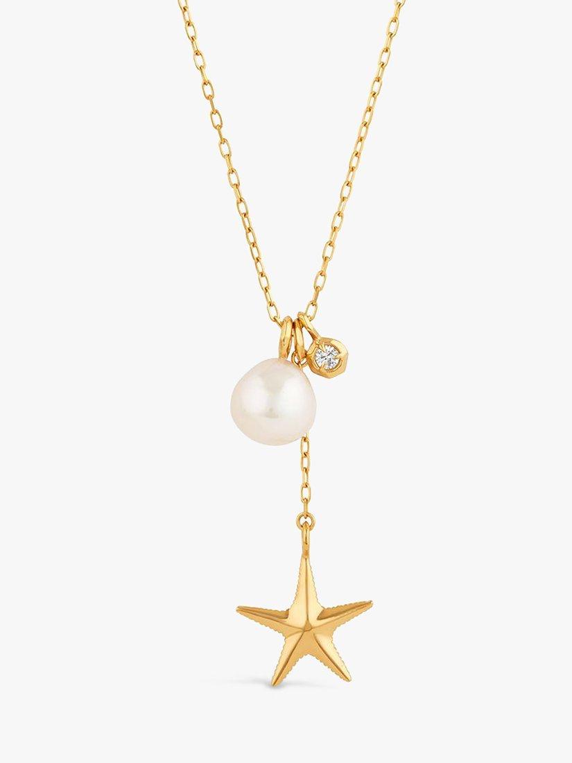 Handcrafted cluster pendant featuring a lustrous freshwater AAA Baroque pearl, charm and a chain-suspended medium starfish, from Thalassa Ocean Treasures.