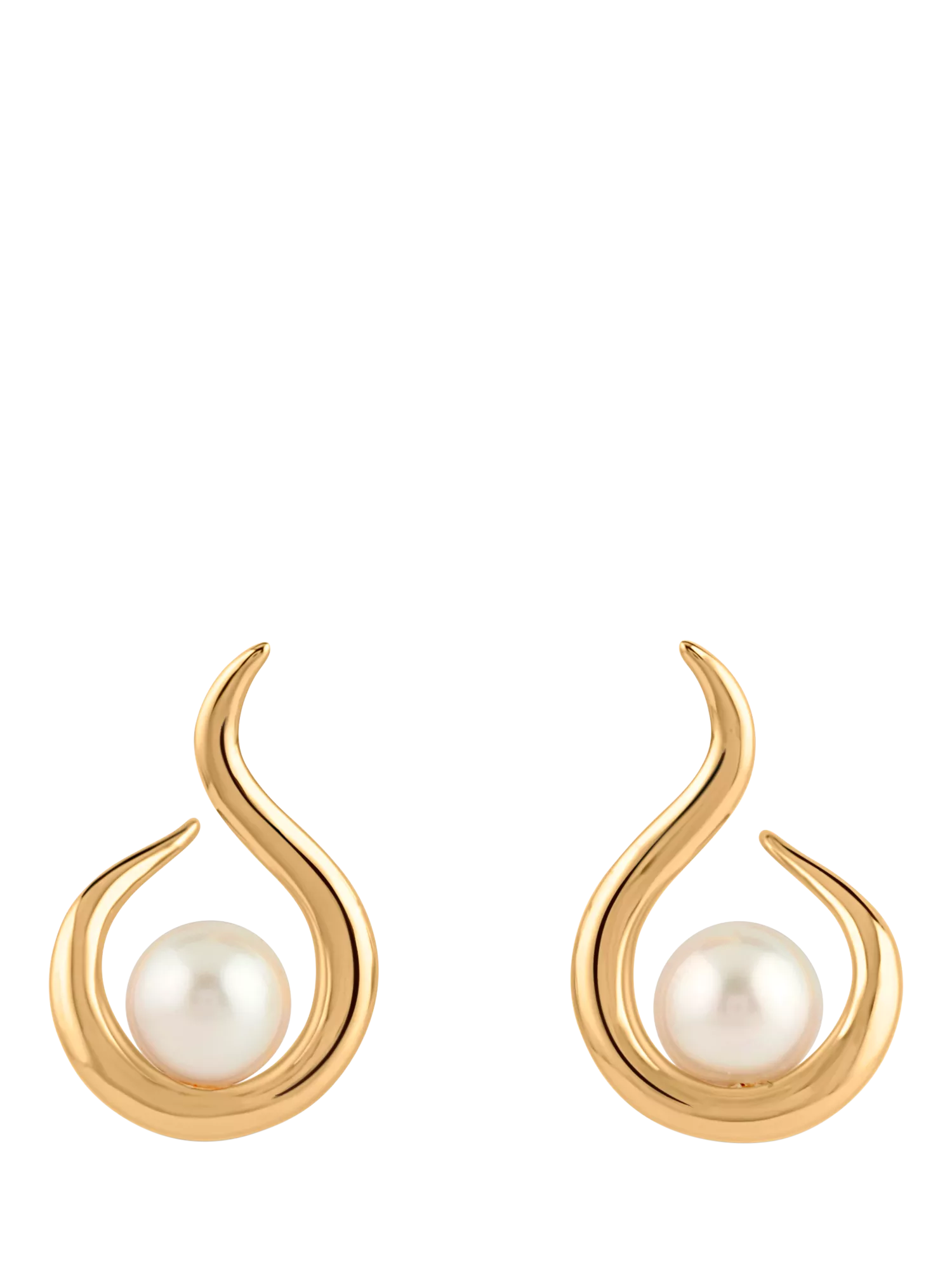 The Toro Pearl Twist Studs are by Dinny Hall are handcrafted in recycled 22ct gold vermeil and freshwater pearls. These sculptural earrings blend the softness and purity of the pearl with the sharp symbolism of the iconic bull horn.
