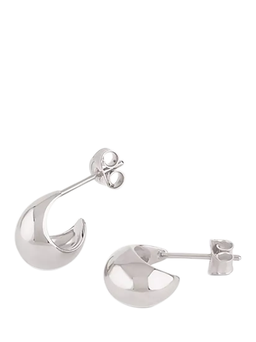 Hand-carved in wax where the centre is scooped out to create a three-dimensional and perfectly balanced shape. These mini hoops are cast in sterling silver. Suitable for pierced ears only.