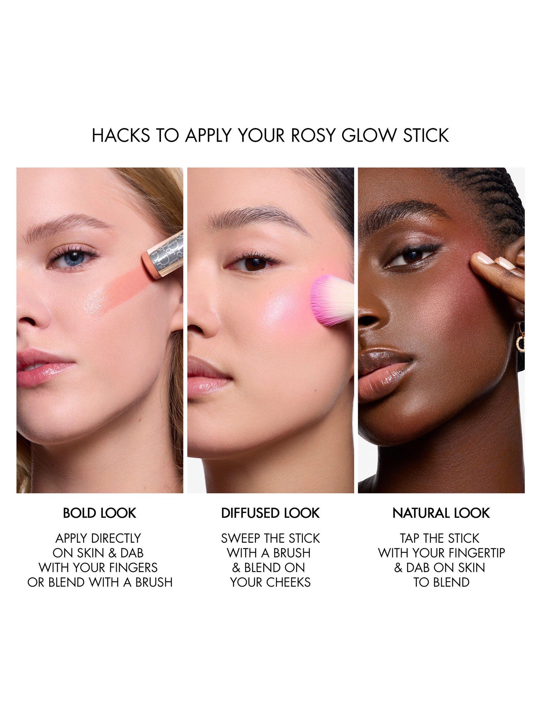 Apply the blush stick to your cheekbones, then blend toward your temples with your fingers, the Dior blender or the Dior Backstage No. 16 brush. For a more natural look, take a small amount of blush with the brush.