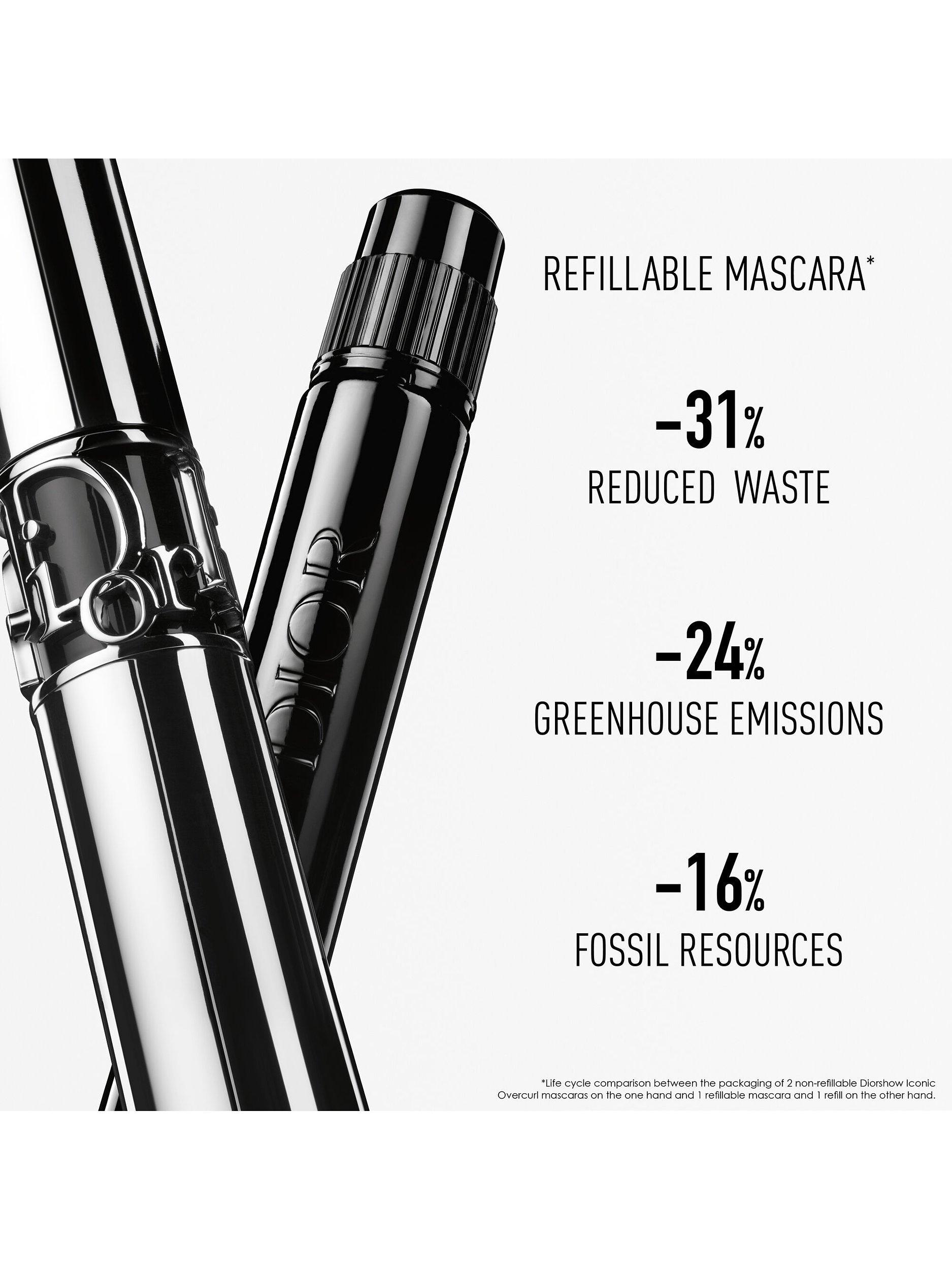 Diorshow Iconic Overcurl is the 1st refillable Dior mascara in its shade 090 Black, demonstrating the House of Dior's sustainable beauty initiative.