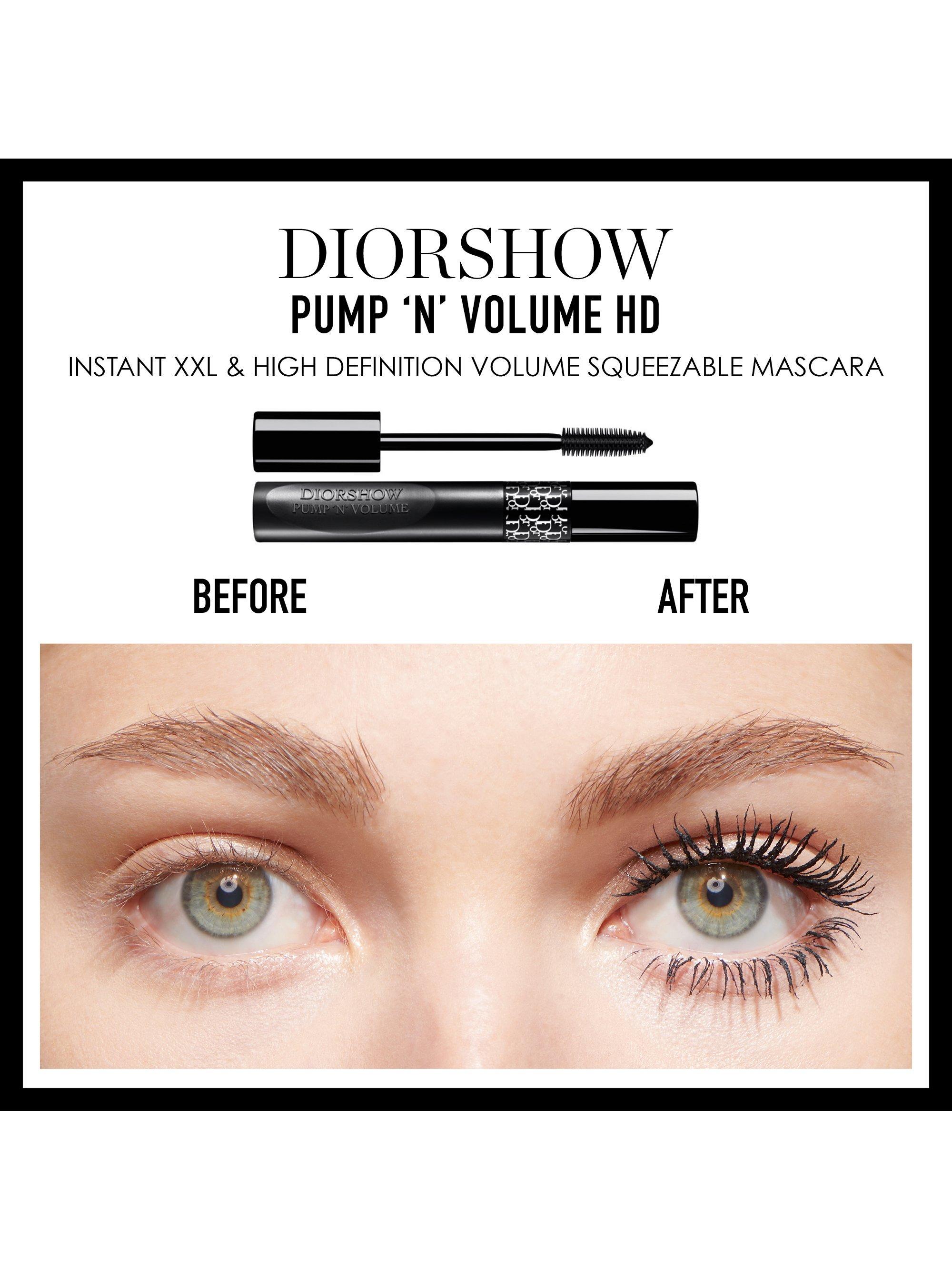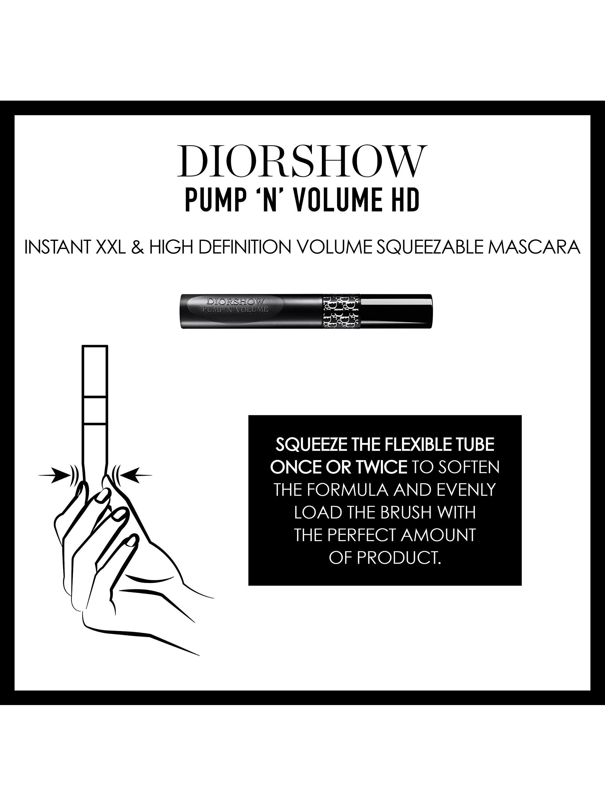 DIORshow Pump 'N' Volume HD combines its iconic XXL volume with a High Definition makeup finish. With a simple squeeze, obtain extreme volume on each lash and a fuller lashline with +94% high definition volume. A new dual-material wiper loads the brush with just the right amount of product for clump-free, excess-free lashes with extreme volume. 24-hour staying power.*