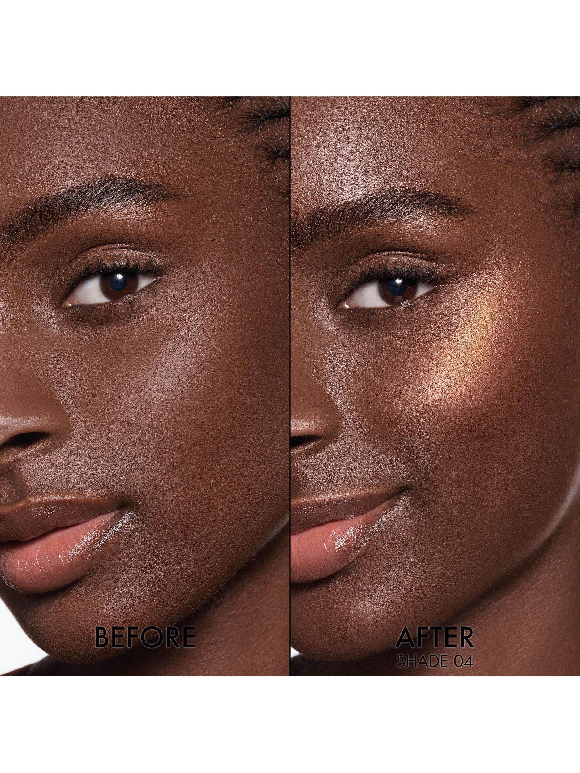 - Illuminate the face and body with a radiant glow: Apply the highlighter with a brush to the cheekbones, bridge of the nose, and décolleté for a luminous finish