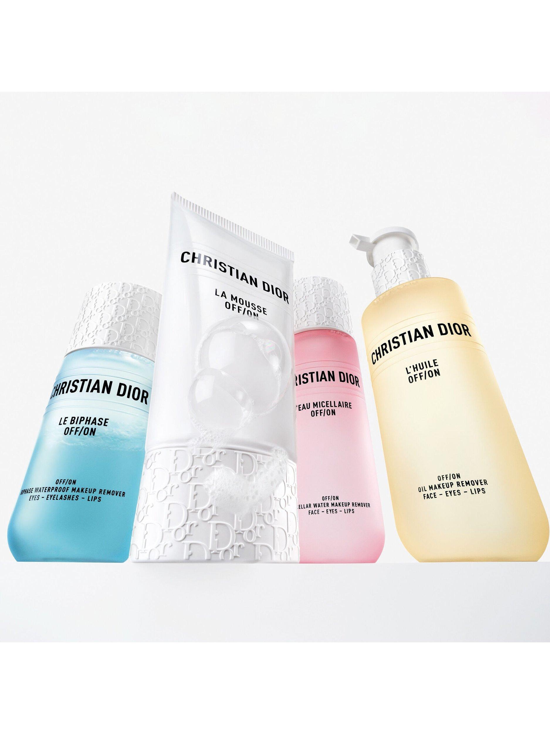 OFF: Removes waterproof and long-wear makeup: Its oily phase, composed of four complementary oils, and its watery phase, infused with Dior's purifying nymphea cryoextract, work together to effectively remove waterproof mascara, long-wear lipstick, and microparticles without leaving a greasy film on the skin.