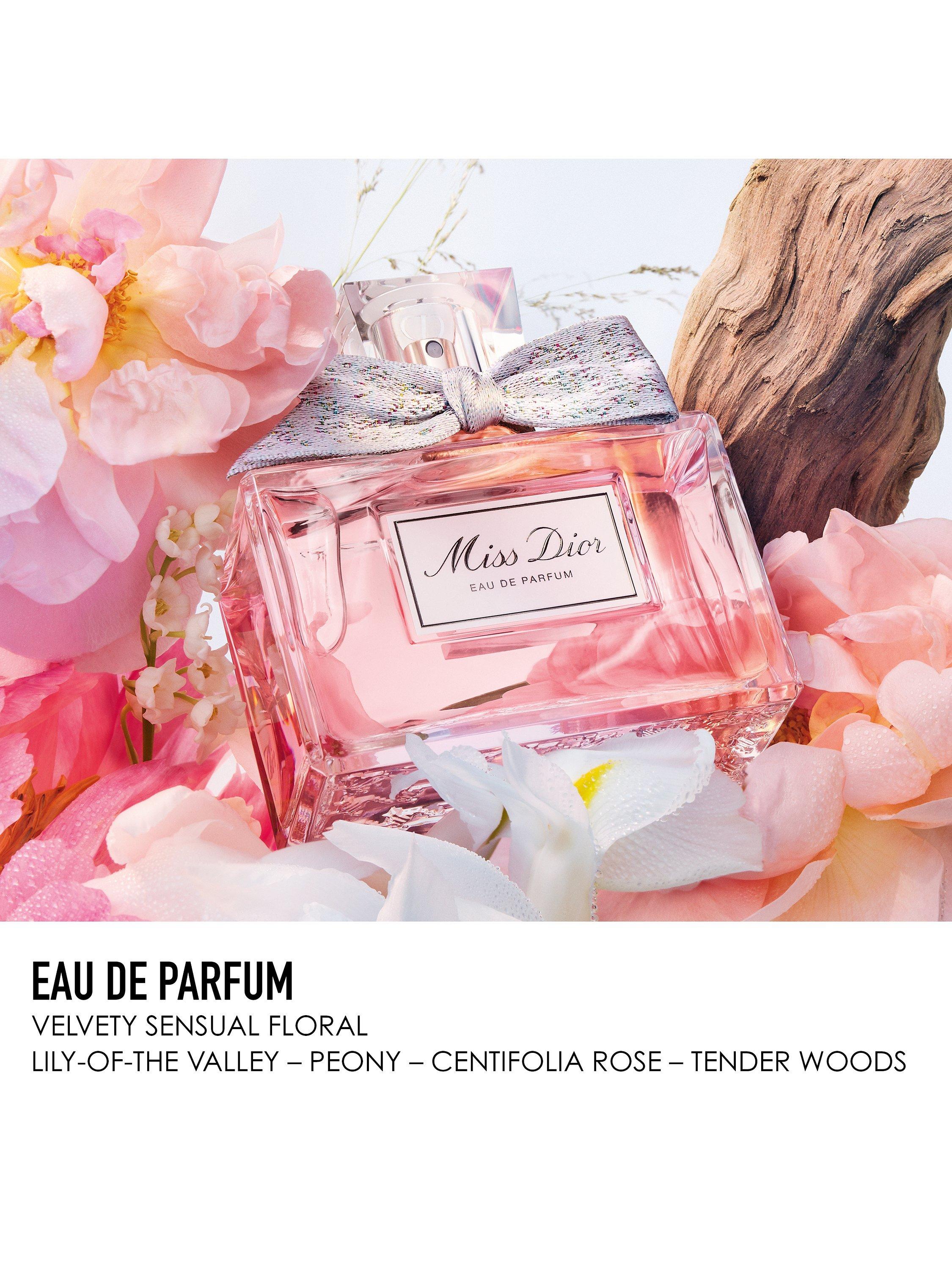 Miss Dior conveys its ode to joy and optimism through velvety notes of Centifolia rose, embroidered with an accord of fresh lily-of-the-valley, peony and powdery iris.