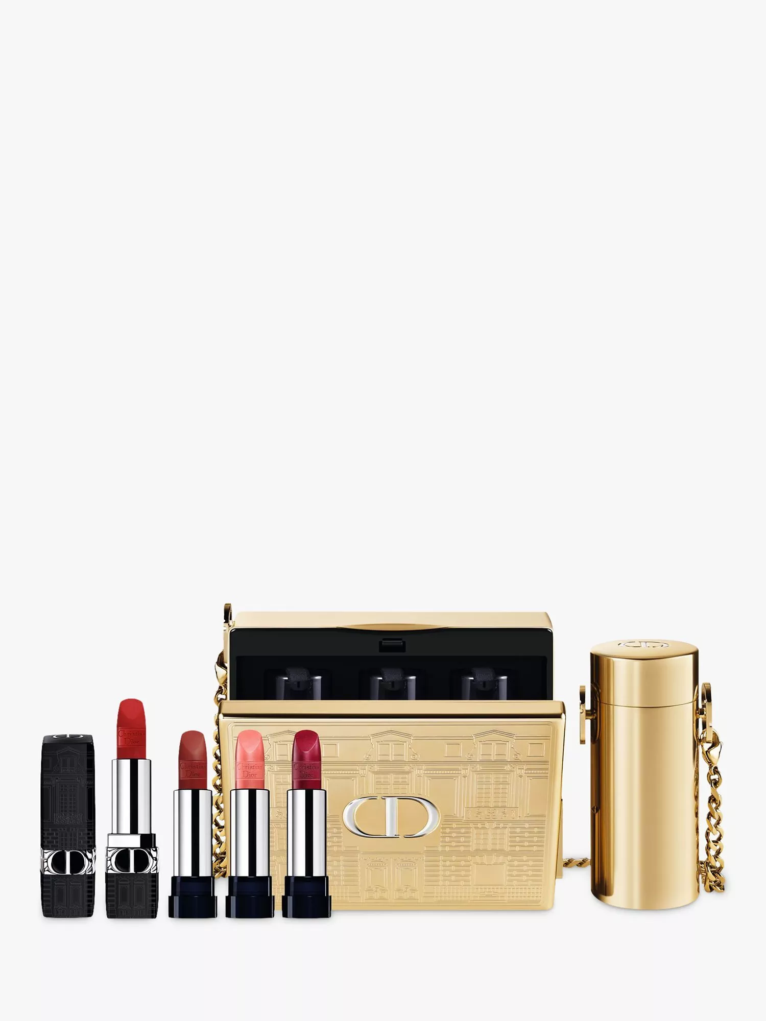 Sophisticated and travel-friendly thanks to its little golden chain strap, the Rouge DIOR minaudiere can be carried over the shoulder or held as a clutch by detaching the case from the lipstick holder for a timeless and couture-inspired look. It contains a limited-edition Rouge DIOR lipstick, whose case also pays tribute to Avenue Montaigne's architecture, as well as 3 Rouge DIOR refills.