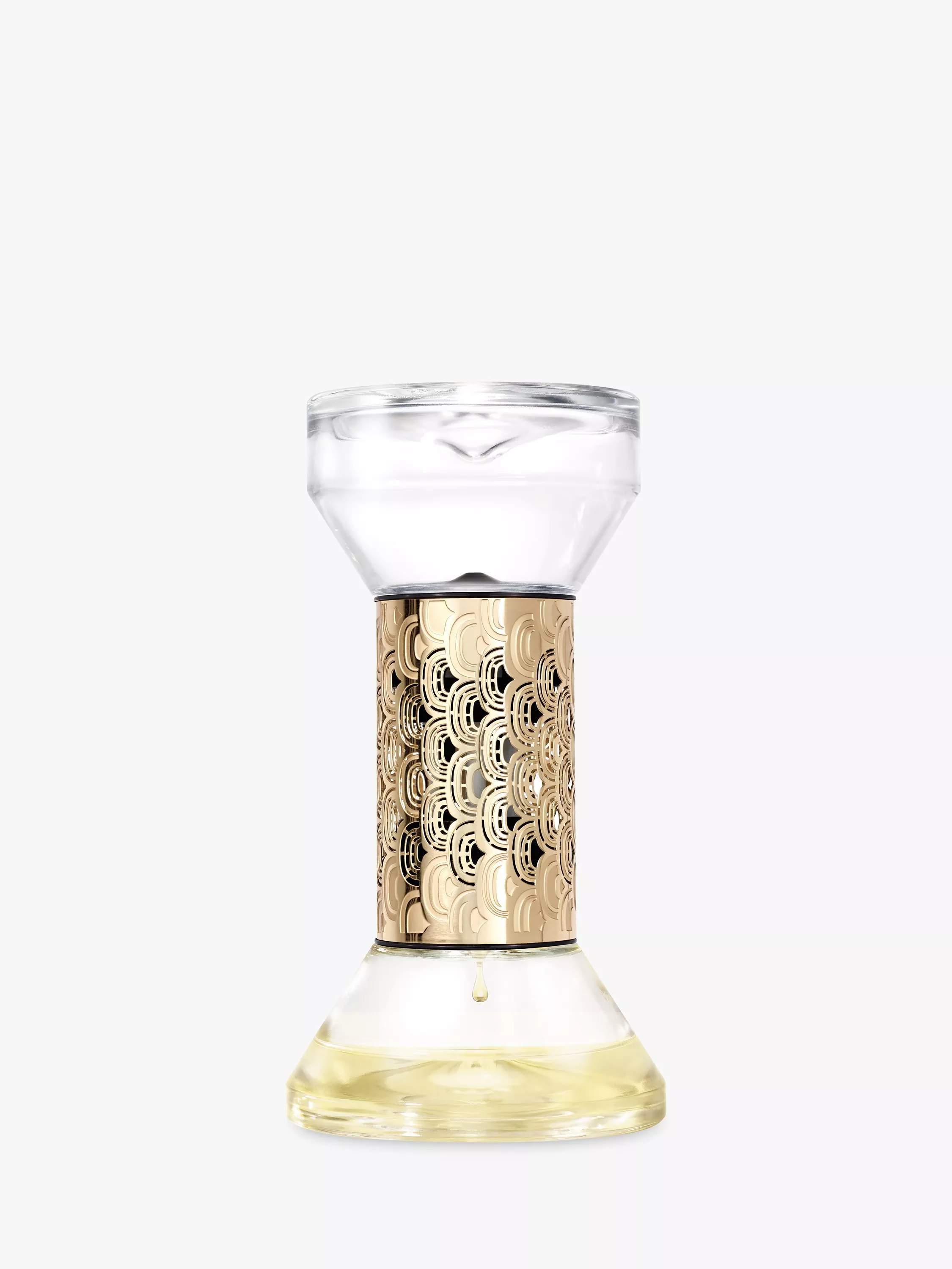 Diptyque's hourglass reinvents perfume for the home. Simply turn the hourglass over for a fragrant and sensorial experience. Using an ingenious process combining gravity and capillary action, the fragrance flows slowly from one glass bottle to another. Its subtle scents are then diffused, over the course of a singular hour: the Diptyque hour.