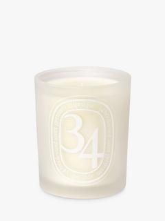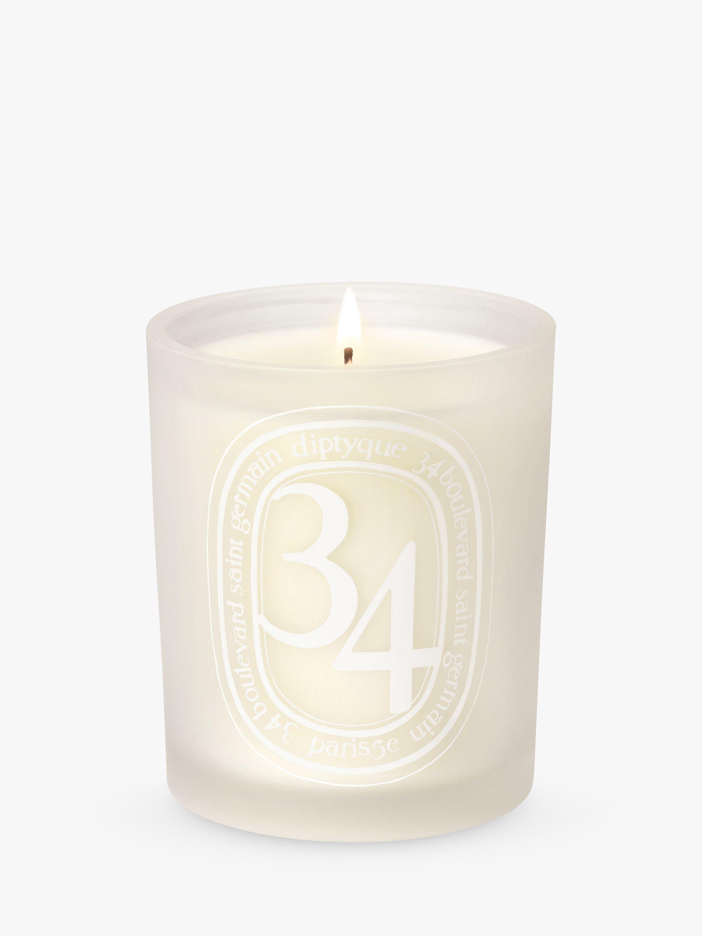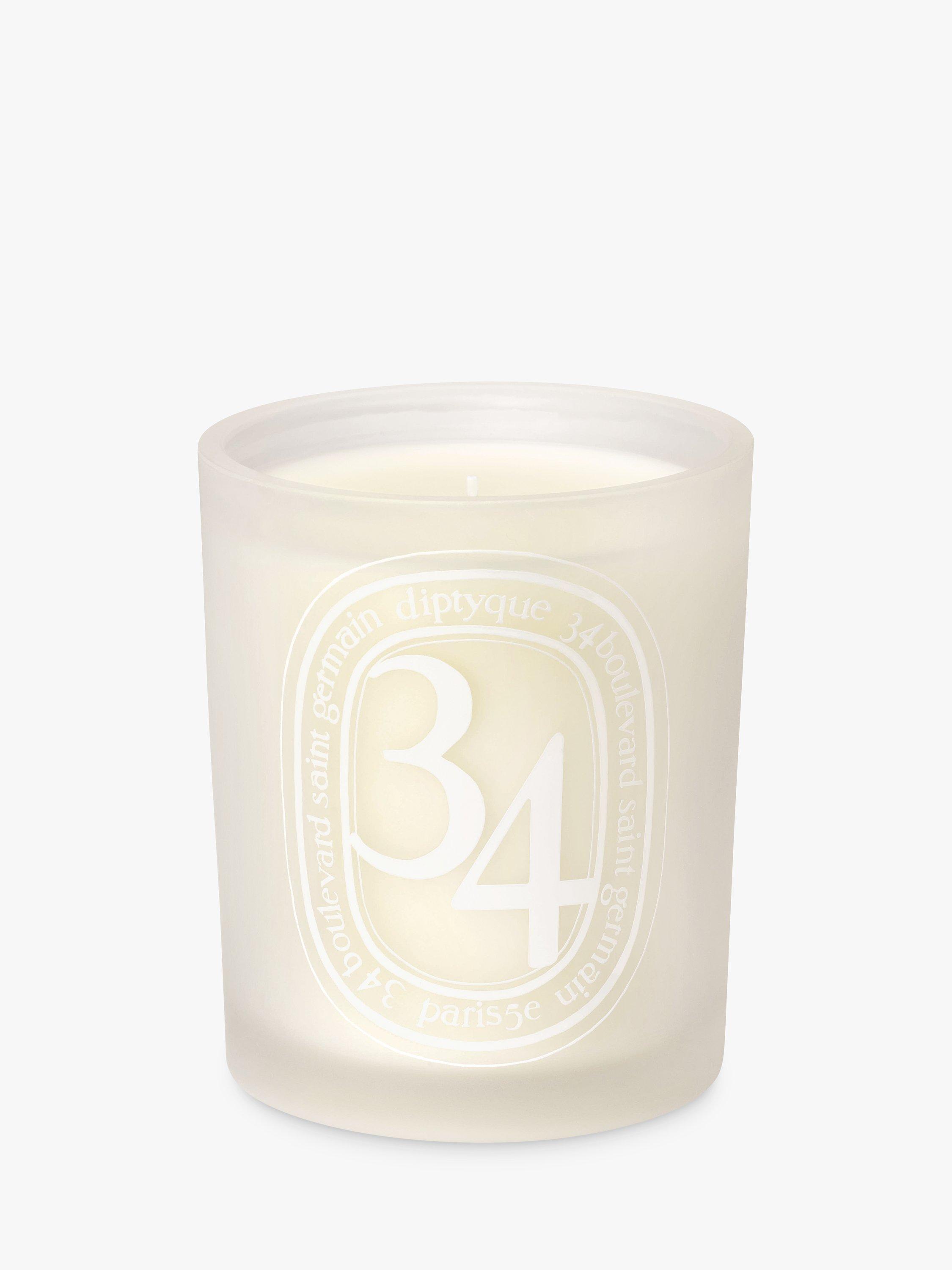 A candle jar in opaline glass bears the oval of Diptyque's signature scent in tone-on-tone colour.