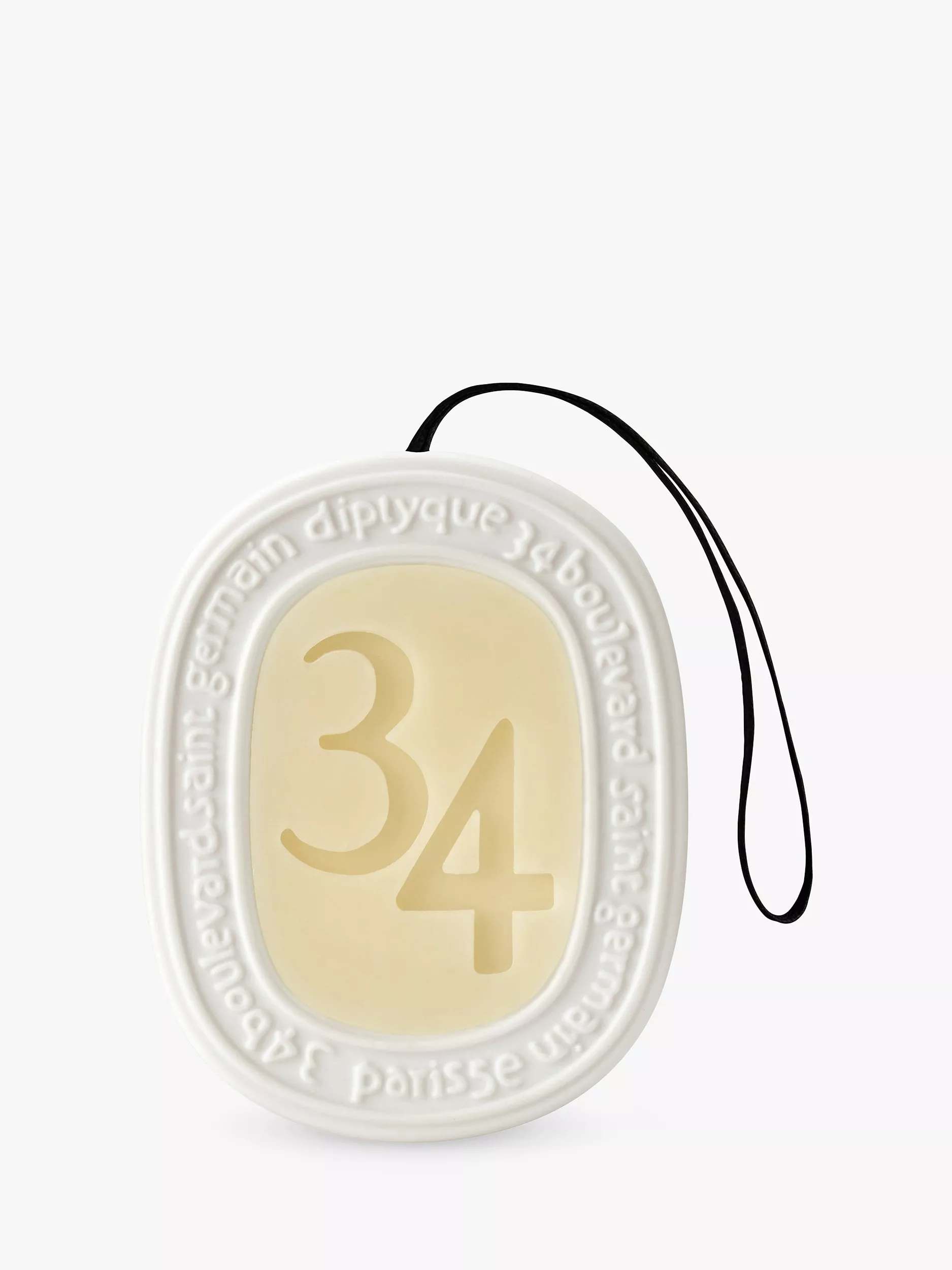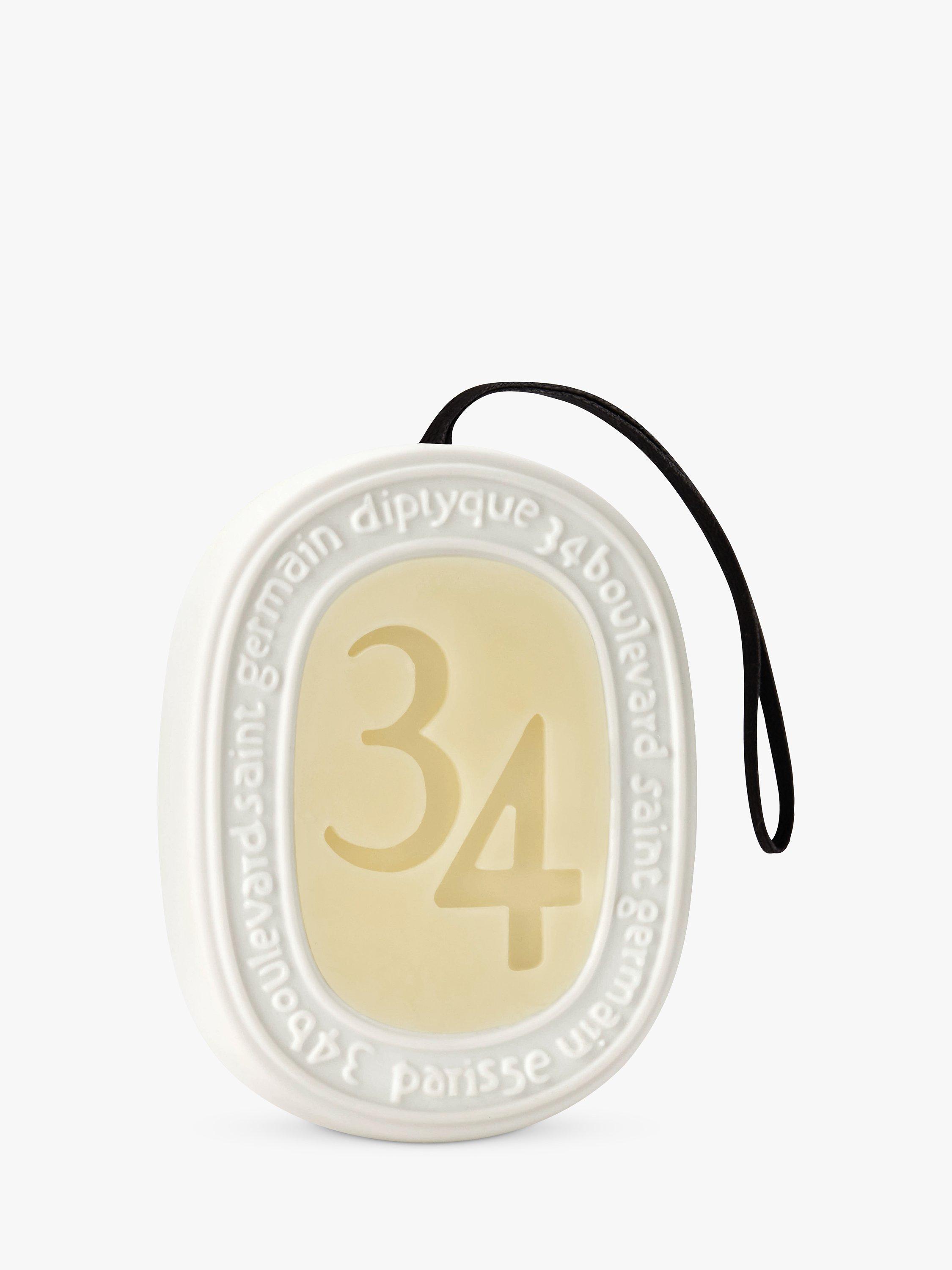 Diptyque's signature scent, in a scented wax oval framed by a white ceramic ring and adorned with a cord, to be slipped into a drawer or hung in a wardrobe.
