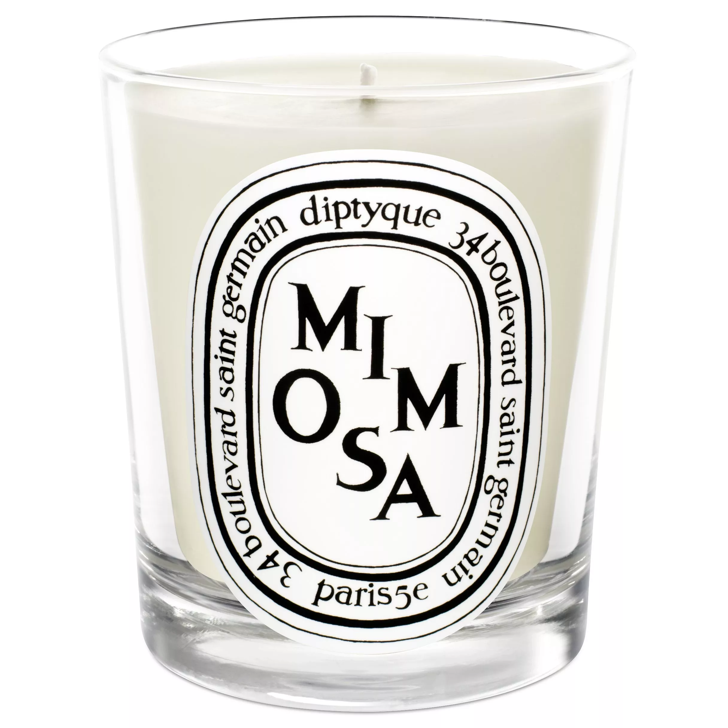 This candle in glass from Diptyque is scented with essential oils. It has a sweet floral fragrance characteristic of the Mimosa bud found on the French Riviera.